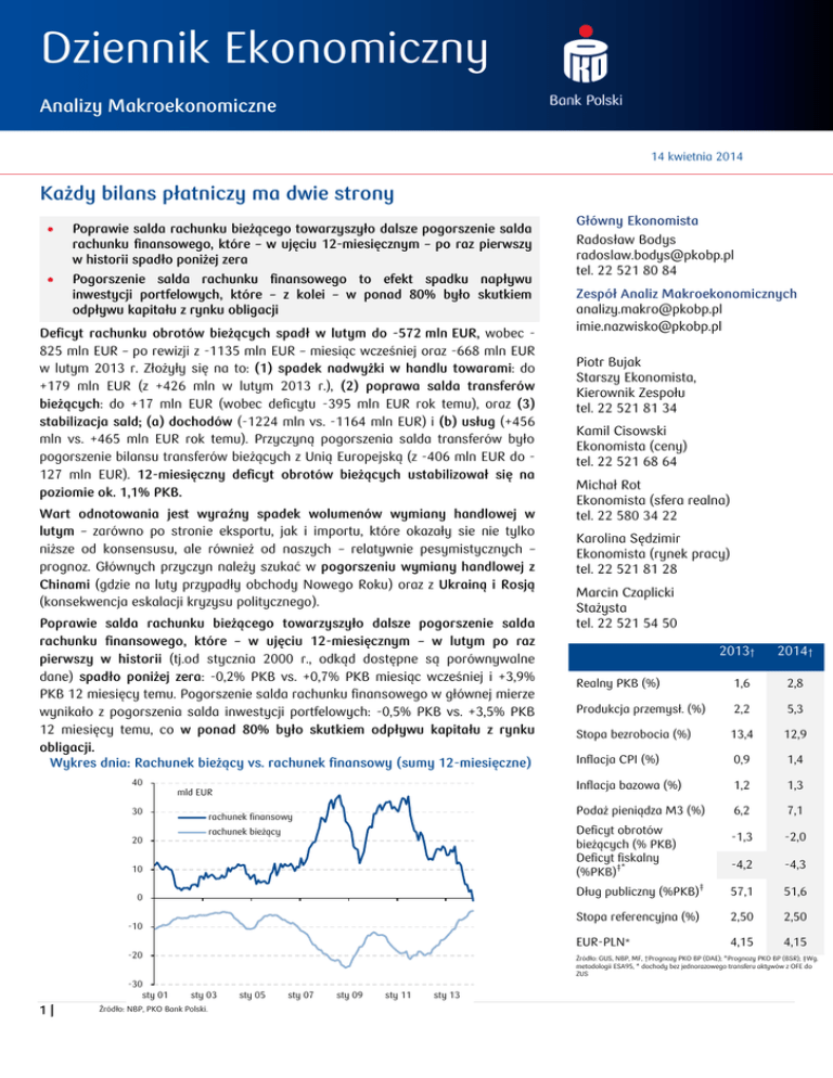 Dziennik Ekonomiczny Analizy Makroekonomiczne 14 kwietnia 2014 Każdy bilans płatniczy ma dwie strony Poprawie salda rachunku bieżącego towarzyszyło dalsze pogorszenie salda rachunku finansowego, które – w ujęciu 12-miesięcznym – po raz pierwszy w historii spadło poniżej zera Pogorszenie salda rachunku finansowego to efekt spadku napływu inwestycji portfelowych, które – z kolei – w ponad 80% było skutkiem odpływu kapitału z rynku obligacji Deficyt rachunku obrotów bieżących spadł w lutym do -572 mln EUR, wobec 825 mln EUR – po rewizji z -1135 mln EUR – miesiąc wcześniej oraz -668 mln EUR w lutym 2013 r. Złożyły się na to: (1) spadek nadwyżki w handlu towarami: do +179 mln EUR (z +426 mln w lutym 2013 r.), (2) poprawa salda transferów bieżących: do +17 mln EUR (wobec deficytu -395 mln EUR rok temu), oraz (3) stabilizacja sald; (a) dochodów (-1224 mln vs. -1164 mln EUR) i (b) usług (+456 mln vs. +465 mln EUR rok temu). Przyczyną pogorszenia salda transferów było pogorszenie bilansu transferów bieżących z Unią Europejską (z -406 mln EUR do 127 mln EUR). 12-miesięczny deficyt obrotów bieżących ustabilizował się na poziomie ok. 1,1% PKB. Wart odnotowania jest wyraźny spadek wolumenów wymiany handlowej w lutym – zarówno po stronie eksportu, jak i importu, które okazały sie nie tylko niższe od konsensusu, ale również od naszych – relatywnie pesymistycznych – prognoz. Głównych przyczyn należy szukać w pogorszeniu wymiany handlowej z Chinami (gdzie na luty przypadły obchody Nowego Roku) oraz z Ukrainą i Rosją (konsekwencja eskalacji kryzysu politycznego). Poprawie salda rachunku bieżącego towarzyszyło dalsze pogorszenie salda rachunku finansowego, które – w ujęciu 12-miesięcznym – w lutym po raz pierwszy w historii (tj.od stycznia 2000 r., odkąd dostępne są porównywalne dane) spadło poniżej zera: -0,2% PKB vs. +0,7% PKB miesiąc wcześniej i +3,9% PKB 12 miesięcy temu. Pogorszenie salda rachunku finansowego w głównej mierze wynikało z pogorszenia salda inwestycji portfelowych: -0,5% PKB vs. +3,5% PKB 12 miesięcy temu, co w ponad 80% było skutkiem odpływu kapitału z rynku obligacji. Wykres dnia: Rachunek bieżący vs. rachunek finansowy (sumy 12-miesięczne) 40 mld EUR 30 rachunek finansowy 10 -10 -20 1| Zespół Analiz Makroekonomicznych [email protected] [email protected] Piotr Bujak Starszy Ekonomista, Kierownik Zespołu tel. 22 521 81 34 Kamil Cisowski Ekonomista (ceny) tel. 22 521 68 64 Michał Rot Ekonomista (sfera realna) tel. 22 580 34 22 Karolina Sędzimir Ekonomista (rynek pracy) tel. 22 521 81 28 Marcin Czaplicki Stażysta tel. 22 521 54 50 2013† 2014† Realny PKB (%) 1,6 2,8 Produkcja przemysł. (%) 2,2 5,3 Stopa bezrobocia (%) 13,4 12,9 Inflacja CPI (%) 0,9 1,4 Inflacja bazowa (%) 1,2 1,3 Podaż pieniądza M3 (%) 6,2 7,1 -1,3 -2,0 -4,2 -4,3 57,1 51,6 Stopa referencyjna (%) 2,50 2,50 EUR-PLN* 4,15 4,15 Dług publiczny (%PKB) 0 -30 sty 01 Radosław Bodys [email protected] tel. 22 521 80 84 Deficyt obrotów bieżących (% PKB) Deficyt fiskalny ‡* (%PKB) rachunek bieżący 20 Główny Ekonomista ‡ Źródło: GUS, NBP, MF, †Prognozy PKO BP (DAE); *Prognozy PKO BP (BSR); ‡Wg. metodologii ESA95, * dochody bez jednorazowego transferu aktywów z OFE do ZUS sty 03 Źródło: NBP, PKO Bank Polski. sty 05 sty 07 sty 09 sty 11 sty 13 Dziennik ekonomiczny 14.04.2014 Tygodniowy kalendarz makroekonomiczny Wskaźnik Godz. Kraj Poprzednie dane Konsensus Odczyt/ PKO BP† 8:00 GER 1,2% r/r 1,0% r/r 1,0% r/r Komentarz Piątek 11.04. Inflacja CPI (mar) -Spadł wolumen handlu towarami z uwagi na negatywne efekty kalendarzowe i załamanie wymiany z Rosją i Ukrainą. Spadek deficytu na rachunku obrotów bieżących wynikał ze wzrostu nadwyżki handlu usługami i poprawy salda transferów bieżących. -- Saldo rachunku obrotów bieżących (lut) 14:00 POL -825 mln EUR -533 mln EUR -572 mln EUR Inflacja PPI (mar) 14:30 USA 0,9% r/r 1,0% r/r 1,4% r/r Indeks Uniwersytetu Michigan (kwi, wst.) 15:55 USA 80,0 pkt. 81,0 pkt. 82,6 pkt. Produkcja przemysłowa (lut) 11:00 EMU -0,2% m/m 0,3% m/m Podaż pieniądza M3 (mar) 14:00 POL 5,2% r/r 4,8% r/r 4.6% r/r Sprzedaż detaliczna (mar) 14:30 USA 0,3 m/m 0,8% m/m -- Inflacja CPI (mar) 14:00 POL 0,7% r/r 0,7% r/r 0.7% r/r Inflacja CPI (mar) 14:30 USA 1,1% r/r 1,5% r/r -- Stopa inflacji nie zmieniła się w marcu, w wyniku zrównoważenia się skutków spadku cen żywności wzrostu cen paliwa oraz tytoniu. -- Inflacja HICP (mar) 11:00 EMU 0,7% r/r 0,5% r/r -- -- Inflacja bazowa (mar) 14:00 POL 0,9% r/r 1,0% r/r 0.9% r/r Zatrudnienie w przedsiębiorstwach (mar) 14:00 POL 0,2% r/r 0,4% r/r 0.4% r/r Wynagrodzenie w przedsiębiorstwach (mar) 14:00 POL 4,0% r/r 3,9% r/r 3.7% r/r Produkcja przemysłowa (mar) 15:15 USA 0,6% m/m 0,5% m/m -- -- Poniedziałek 14.04. -Tempo wzrostu podaży pieniądza M3 spadnie w wyniku słabszego wzrostu depozytów gospodarstw domowych i przedsiębiorstw. -- Wtorek 15.04. Środa 16.04. Inflacja bazowa porusza się wokół trendu 1% r/r. Brak istotnych zakłóceń w marcu wskazuje, że jej stopa powinna pozostać na niezmienionym poziomie. Widoczna jest poprawa na rynku pracy. Wzrost zatrudnienia ponownie przyśpieszył w marcu, czemu sprzyjały korzystne warunki pogodowe. Tempo wzrostu płac powinno pozostać stabilne. Prognozujemy jego nieznaczne spowolnienie z uwagi na odreagowanie po lutowych wzrostach w górnictwie. Przy pominięciu tego czynnika wzrost wynagrodzeń mógłby przyśpieszyć do 4,0-4,5% r/r. -- Czwartek 17.04. Produkcja przemysłowa (mar) 14:00 POL 5,3% r/r 6,3% r/r 7.7% r/r Inflacja PPI (mar) 14:00 POL -1,4% r/r -1,1% r/r -1.4 r/r Źródło: GUS, Reuters, NBP, ankieta Parkietu, ankieta Reuters, PKO Bank Polski. 2| Nasza prognoza wynika z silnego wzrostu produkcji samochodów (8% r/r w marcu), wysokich wskaźników koniunktury w biznesie oraz korzystnych efektów bazy. Nasza prognoza PPI odzwierciedla silne efekty spadk