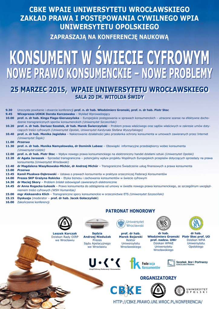 CBKE WPAIE UNIWERSYTETU WROCŁAWSKIEGO ZAKŁAD PRAWA I POSTĘPOWANIA CYWILNEGO WPIA UNIWERSYTETU OPOLSKIEGO ZAPRASZAJĄ NA KONFERENCJĘ NAUKOWĄ KONSUMENT W ŚWIECIE CYFROWYM NOWE PRAWO KONSUMENCKIE – NOWE PROBLEMY 25 MARZEC 2015, WPAIE UNIWERSYTETU WROCŁAWSKIEGO SALA 2D IM. WITOLDA ŚWIDY 9.30 9.45 10.00 10.20 10.40 11.00 11.30 12.00 12.20 12.40 13.00 13.45 14.00 14.30 14.45 15.00 15.15 16.00 Uroczyste powitanie i otwarcie konferencji prof. n. dr hab. Włodzimierz Gromski, prof. n. dr hab. Piotr Stec Wiceprezes UOKiK Dorota Karczewska – Wykład Wprowadzający prof. n. dr hab. Kinga Flaga-Gieruszyńska – Europejskie postępowania w sprawach konsumenckich – utracone szanse na efektywne dochodzenie transgranicznych sporów konsumenckich (Uniwersytet Szczeciński) prof. n. dr hab. Dariusz Szostek, dr hab. Marek Świerczyński – Problem prawa właściwego oraz sądów właściwych w zakresie umów dotyczących treści cyfrowych (Uniwersytet Opolski, Uniwersytet Kardynała Stefana Wyszyńskiego) prof. n. dr hab. Monika Jagielska – Nakierowanie działalności jako przesłanka ochrony konsumenta w umowach zawieranych przez Internet (Uniwersytet Śląski) Przerwa prof. n. dr hab. Monika Namysłowska, dr Dominik Lubasz – Obowiązki informacyjne przedsiębiorcy wobec konsumenta (Uniwersytet Łódzki) prof. n. dr hab. Piotr Stec – Wpływ nowego prawa konsumenckiego na elektroniczny handel dziełami sztuki (Uniwersytet Opolski) dr Agata Jaroszek – Sprzedaż transgraniczna – potencjalny wpływ projektu Wspólnych Europejskich przepisów dotyczących sprzedaży na prawa konsumenta (Uniwersytet Wrocławski) dr Magdalena Wasyłkowska-Michór, dr Andrzej Michór – Transgraniczne Świadczenie usług finansowych a prawa konsumenta Przerwa Kamil Pluskwa-Dąbrowski – Ustawa o prawach konsumenta w praktyce orzeczniczej Federacji Konsumentów Prezes SKP Grażyna Rokicka – Etyka biznesu i zachowania konsumentów w świecie cyfrowym dr Maciej Skory – Problem źródeł zobowiązań zawieranych elektronicznie dr Anna Rogacka Łukasik – Prawo konsumenta do odstąpienia od umowy w świetle nowego prawa konsumenckiego, ze szczególnym uwzględnieniem treści cyfrowych (WSH Humanitas) mgr Aleksandra Klich – Transgraniczne spory konsumenckie w orzecznictwie ETS (Uniwersytet Szczeciński) Dyskusja (moderator – prof. dr hab. Jacek Gołaczyński) Zakończenie konferencji PATRONAT HONOROWY Leszek Korczak Dziekan Rady OIRP we Wrocławiu Sędzia Andrzej Niedużak Prezes Sądu Apelacyjnego we Wrocławiu prof. dr hab. Marek Bojarski Rektor Uniwersytetu Wrocławskiego dr hab. dr hab. Włodzimierz Gromski Piotr Stec prof. UO prof. nadzw. UWr Dziekan WPiA Dziekan WPAiE Uniwersytetu Uniwersytetu Opolskiego Wrocławskiego ORGANIZATORZY HTTP://CBKE.PRAWO.UNI.WROC.PL/KONFERENCJA/