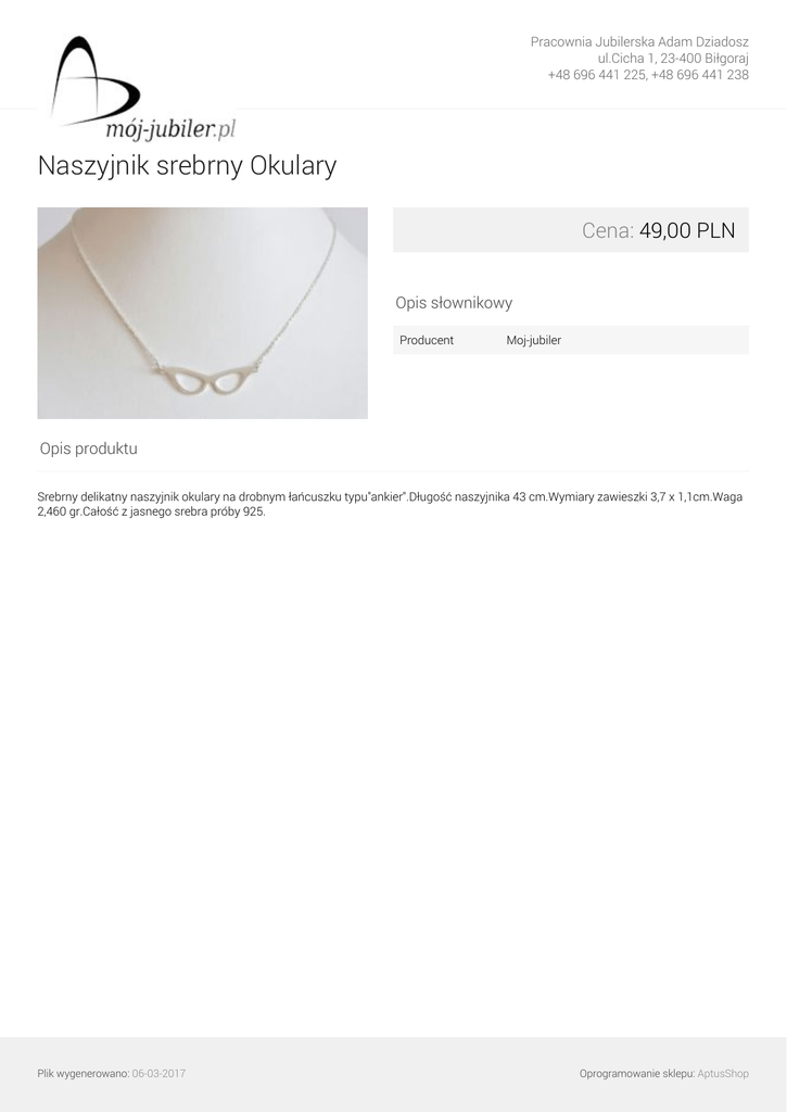 Pracownia Jubilerska Adam Dziadosz ul.Cicha 1, 23-400 Biłgoraj +48 696 441 225, +48 696 441 238 Naszyjnik srebrny Okulary Cena: 49,00 PLN Opis słownikowy Producent Moj-jubiler Opis produktu Srebrny delikatny naszyjnik okulary na drobnym łańcuszku typu"ankier".Długość naszyjnika 43 cm.Wymiary zawieszki 3,7 x 1,1cm.Waga 2,460 gr.Całość z jasnego srebra próby 925. Plik wygenerowano: 06-03-2017 Powered by TCPDF (www.tcpdf.org) Oprogramowanie sklepu: AptusShop