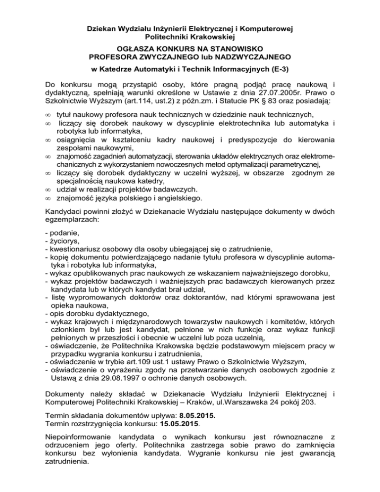 Dziekan Wydziału Inżynierii Elektrycznej i Komputerowej Politechniki Krakowskiej OGŁASZA KONKURS NA STANOWISKO PROFESORA ZWYCZAJNEGO lub NADZWYCZAJNEGO w Katedrze Automatyki i Technik Informacyjnych (E-3) Do konkursu mogą przystąpić osoby, które pragną podjąć pracę naukową i dydaktyczną, spełniają warunki określone w Ustawie z dnia 27.07.2005r. Prawo o Szkolnictwie Wyższym (art.114, ust.2) z późn.zm. i Statucie PK § 83 oraz posiadają: • • • • • • • tytuł naukowy profesora nauk technicznych w dziedzinie nauk technicznych, liczący się dorobek naukowy w dyscyplinie elektrotechnika lub automatyka i robotyka lub informatyka, osiągnięcia w kształceniu kadry naukowej i predyspozycje do kierowania zespołami naukowymi, znajomość zagadnień automatyzacji, sterowania układów elektrycznych oraz elektromechanicznych z wykorzystaniem nowoczesnych metod optymalizacji parametrycznej, liczący się dorobek dydaktyczny w uczelni wyższej, w obszarze zgodnym ze specjalnością naukowa katedry, udział w realizacji projektów badawczych. znajomość języka polskiego i angielskiego. Kandydaci powinni złożyć w Dziekanacie Wydziału następujące dokumenty w dwóch egzemplarzach: - podanie, - życiorys, - kwestionariusz osobowy dla osoby ubiegającej się o zatrudnienie, - kopię dokumentu potwierdzającego nadanie tytułu profesora w dyscyplinie automatyka i robotyka lub informatyka, - wykaz opublikowanych prac naukowych ze wskazaniem najważniejszego dorobku, - wykaz projektów badawczych i ważniejszych prac badawczych kierowanych przez kandydata lub w których kandydat brał udział, - listę wypromowanych doktorów oraz doktorantów, nad którymi sprawowana jest opieka naukowa, - opis dorobku dydaktycznego, - wykaz krajowych i międzynarodowych towarzystw naukowych i komitetów, których członkiem był lub jest kandydat, pełnione w nich funkcje oraz wykaz funkcji pełnionych w przeszłości i obecnie w uczelni lub poza uczelnią, - oświadczenie, że Politechnika Krakowska będzie podstawowym miejscem pracy w przypadku wygrania konkursu i zatrudnienia, - oświadczenie w trybie art.109 ust.1 ustawy Prawo o Szkolnictwie Wyższym, - oświadczenie o wyrażeniu zgody na przetwarzanie danych osobowych zgodnie z Ustawą z dnia 29.08.1997 o ochronie danych osobowych. Dokumenty należy składać w Dziekanacie Wydziału Inżynierii Elektrycznej i Komputerowej Politechniki Krakowskiej – Kraków, ul.Warszawska 24 pokój 203. Termin składania dokumentów upływa: 8.05.2015. Termin rozstrzygnięcia konkursu: 15.05.2015. Niepoinformowanie kandydata o wynikach konkursu jest równoznaczne z odrzuceniem jego oferty. Politechnika zastrzega sobie prawo do zamknięcia konkursu bez wyłonienia kandydata. Wygranie konkursu nie jest gwarancją zatrudnienia.