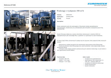 Reference 071558 Wodociągi o wydajności 500 m³/h Industry Waterworks Application Drinking water Country Poland Description Stacja uzdatniania wody dla wodociągów w Wyszkowie została zaprojektowana, wyprodukowana, dostarczona oraz zainstalowana jako kompletne rozwiązanie przez firmę EUROWATER. System filtracyjny składa się z sześciu zbiorników ciśnieniowych o średnicy 3000 mm zaprojektowanych jako równoległe filtry z systemem rur wykonanych ze stali nierdzewnej. W dolnej części filtrów ciśnieniowych znajduje się dno dyszowe, która zapewnia kilka znacznych korzyści: • Równomierny rozkład obciążenia dla optymalnego wykorzystania złoża filtracyjnego. • Skuteczne płukanie złoża filtracyjnego przy użyciu powietrza i wody zapewniając wysoką skuteczność filtracji. • Uniknięcie wody stojącej zarówno podczas pracy jak i płukania wstecznego, co jest istotne w celu ograniczania wzrostu bakterii. Technical data • Przepływ: 500 m³/h • Żelazo: < 0.01 mg/L • Mangan: < 0.01 mg/L Units in plant • Urządzenie do napowietrzania • Automatyczne filtry ciśnieniowe, 6 x TFB 105 – średnica 3000 mm • Urządzenie do płukania wstecznego • Pompa dytrybucyjna • System sterowania