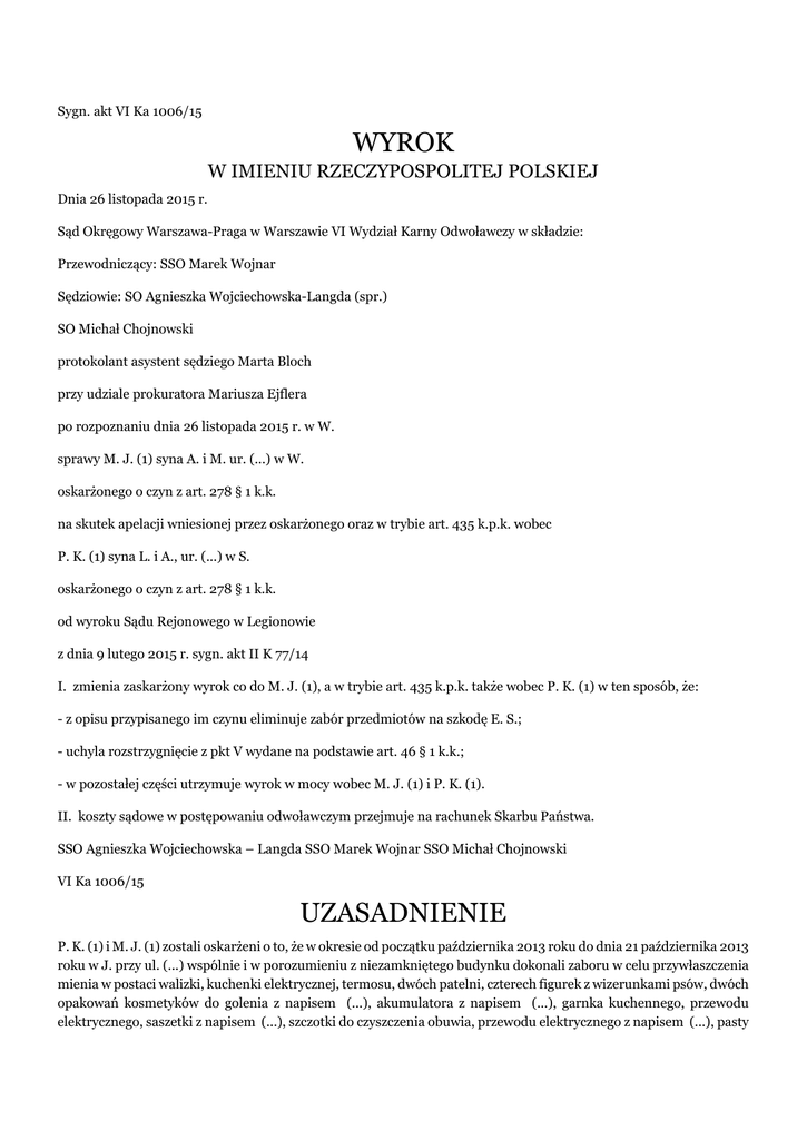 Sygn. akt VI Ka 1006/15 WYROK W IMIENIU RZECZYPOSPOLITEJ POLSKIEJ Dnia 26 listopada 2015 r. Sąd Okręgowy Warszawa-Praga w Warszawie VI Wydział Karny Odwoławczy w składzie: Przewodniczący: SSO Marek Wojnar Sędziowie: SO Agnieszka Wojciechowska-Langda (spr.) SO Michał Chojnowski protokolant asystent sędziego Marta Bloch przy udziale prokuratora Mariusza Ejflera po rozpoznaniu dnia 26 listopada 2015 r. w W. sprawy M. J. (1) syna A. i M. ur. (...) w W. oskarżonego o czyn z art. 278 § 1 k.k. na skutek apelacji wniesionej przez oskarżonego oraz w trybie art. 435 k.p.k. wobec P. K. (1) syna L. i A., ur. (...) w S. oskarżonego o czyn z art. 278 § 1 k.k. od wyroku Sądu Rejonowego w Legionowie z dnia 9 lutego 2015 r. sygn. akt II K 77/14 I. zmienia zaskarżony wyrok co do M. J. (1), a w trybie art. 435 k.p.k. także wobec P. K. (1) w ten sposób, że: - z opisu przypisanego im czynu eliminuje zabór przedmiotów na szkodę E. S.; - uchyla rozstrzygnięcie z pkt V wydane na podstawie art. 46 § 1 k.k.; - w pozostałej części utrzymuje wyrok w mocy wobec M. J. (1) i P. K. (1). II. koszty sądowe w postępowaniu odwoławczym przejmuje na rachunek Skarbu Państwa. SSO Agnieszka Wojciechowska – Langda SSO Marek Wojnar SSO Michał Chojnowski VI Ka 1006/15 UZASADNIENIE P. K. (1) i M. J. (1) zostali oskarżeni o to, że w okresie od początku października 2013 roku do dnia 21 października 2013 roku w J. przy ul. (...) wspólnie i w porozumieniu z niezamkniętego budynku dokonali zaboru w celu przywłaszczenia mienia w postaci walizki, kuchenki elektrycznej, termosu, dwóch patelni, czterech figurek z wizerunkami psów, dwóch opakowań kosmetyków do golenia z napisem (...), akumulatora z napisem (...), garnka kuchennego, przewodu elektrycznego, saszetki z napisem (...), szczotki do czyszczenia obuwia, przewodu elektrycznego z napisem (...), pasty do butów, elementu metalowego ze zwojem drutu, skrzynki z częściami zamiennymi do sprzętu rehabilitacyjnego, urządzenia elektrycznego koloru czarnego wraz z ładowarką, ładowarki do wózka elektrycznego z napisem (...), siekiery oraz walizki, powodując straty o łącznej wartości 802 złotych na szkodę R. B. oraz mienia w postaci kompletu szkła do win, wódki, koniaku w ilości 30 sztuk, szkła tzw. (...), kompletu srebrnych łyżeczek deserowych, widelczyków deserowych i nożyków deserowych w ilości 18 sztuk w plastikowym koszyku, posrebrzanej cukiernicy, szklanej karafki z posrebrzanym korkiem, 5 sztuk czar kryształowych na wysokich nóżkach, karafki z uchwytem spiralnym z zawieszonymi kieliszkami, powodując straty o łącznej wartości 750 złotych na szkodę E. S., tj. o czyn z art. 278 § 1 k.k. Wyrokiem Sądu Rejonowego w Legionowie z dnia 9 lutego 2015 roku w sprawie o sygn. akt II K 77/14 oskarżonych uznano za winnych zarzucanego im czynu i wymierzono im kary: P. K. (1) roku pozbawienia wolności, a M. J. (1) 10 miesięcy pozbawienia wolności. Wykonanie orzeczonej wobec P. K. (1) kary pozbawienia wolności Sąd Rejonowy warunkowo zawiesił na okres 4 lat próby. Ponadto każdemu z oskarżonych Sąd Rejonowy wymierzył karę 30 stawek dziennych po 10 złotych każda. Na podstawie art. 46 § 1 k.k. orzeczono wobec oskarżonych obowiązek naprawienia szkody poprzez zapłatę na rzecz pokrzywdzonej E. S. kwoty po 375 złotych od każdego oskarżonego. P. K. (1) Sąd oddał pod dozór kuratora w okresie próby. Jednocześnie zwolnił oskarżonych od obowiązku ponoszenia kosztów postępowania, przejmując je na rachunek Skarbu Państwa. Od powyższego wyroku apelację złożył oskarżony M. J. (1), w której zarzucił wyrokowi rażącą surowość orzeczonej kary pozbawienia wolności i wniósł o złagodzenie tej kary i orzeczenie jej z warunkowym zawieszeniem wykonania na okres 5 lat. Sąd Okręgowy zważył, co następuje. Apelacja oskarżonego M. J. (1), w której oskarżony zarzucał rażącą surowość wymierzonej wobec niego kary 10 miesięcy pozbawienia wolności, okazała się bezzasadna. Jednakże Sąd z urzędu dostrzegł podstawy do zmiany zaskarżonego wyroku poprzez wyeliminowanie z opisu przypisanego oskarżonemu przestępstwa zaboru przedmiotów na szkodę E. S., a co za tym idzie – także uchylenia rozstrzygnięcia z pkt. V tego wyroku, nakładającego obowiązek naprawienia szkody poprzez zapłatę kwoty 375 złotych na rzecz E. S.. Jednocześnie, w związku z faktem, iż te same względy przemawiały za zmianą zaskarżonego wyroku wobec drugiego z oskarżonych Sąd Okręgowy na podstawie art. 435 k.p.k. zmienił orzeczenie Sądu I instancji w powyższym zakresie także w stosunku do oskarżonego P. K. (1). W ocenie Sądu Okręgowego z opisu czynu przypisanego oskarżonym należało wyeliminować zabór przedmiotów na szkodę E. S. z tego względu, że żaden dowód zgromadzony w niniejszym postępowaniu nie pozwala na ustalenie, że dokonali tego oskarżeni. Pokrzywdzona E. S. zeznała jedynie, iż doszło do kradzieży w piwnicy domu, w którym mieszka jej synowa oraz wskazała, jakie przedmioty do niej należące zostały skradzione. Nie sposób jednak ustalić, czy zaboru tego mienia dokonali właśnie oskarżeni P. K. i M. J., jak bowiem wskazywali świadkowie, piwnica, w której znajdować się miały przedmioty należące do E. S. nie była zamknięta, co oznacza, że dostęp do niej mógł mieć każdy. Jednocześnie w świetle zeznań świadków R. B., E. S., E. B. nie sposób jednoznacznie ustalić, kiedy rzeczy E. S. zostały skradzione – czy właśnie w dniu 21 X 2013 r., czy też wcześniej. Żaden dowód nie potwierdza również tego, że oskarżeni byli na terenie rzeczonej piwnicy w innym czasie niż w dniu 21 października 2013 roku, kiedy to widziano ich, gdy dokonywali kradzieży, następnie zatrzymano, a w toku przeszukania M. J. (1) ujawniono jedynie przedmioty należące do R. B.. Nie stwierdzono natomiast. aby w posiadaniu oskarżonych znajdowały się przedmioty skradzi