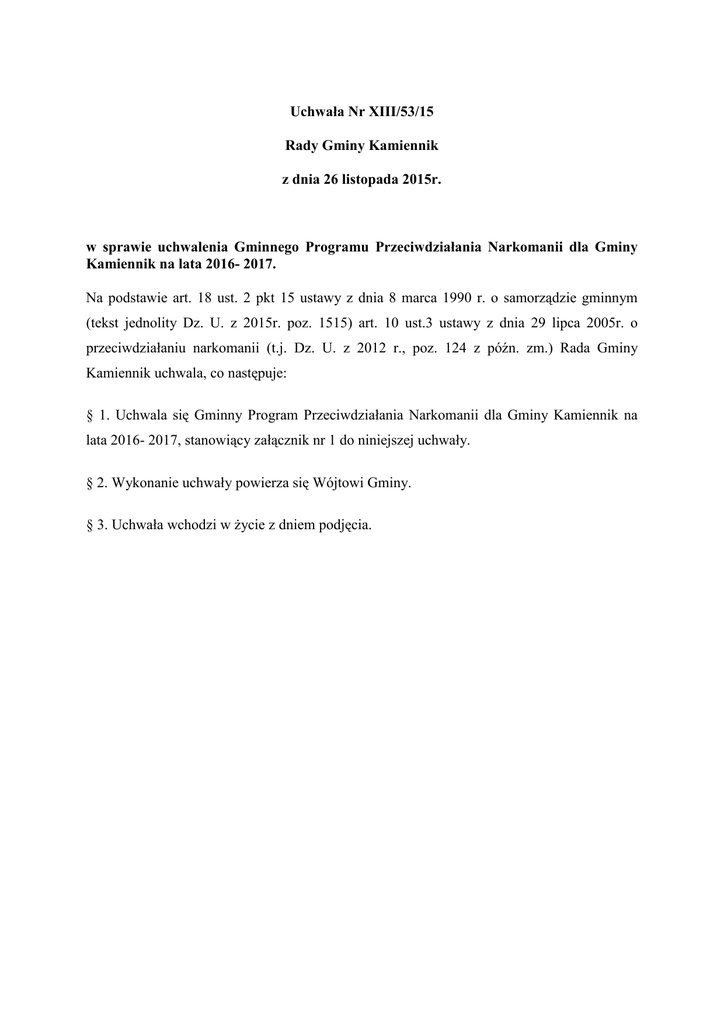 Uchwała Nr XIII/53/15 Rady Gminy Kamiennik z dnia 26 listopada 2015r. w sprawie uchwalenia Gminnego Programu Przeciwdziałania Narkomanii dla Gminy Kamiennik na lata 2016- 2017. Na podstawie art. 18 ust. 2 pkt 15 ustawy z dnia 8 marca 1990 r. o samorządzie gminnym (tekst jednolity Dz. U. z 2015r. poz. 1515) art. 10 ust.3 ustawy z dnia 29 lipca 2005r. o przeciwdziałaniu narkomanii (t.j. Dz. U. z 2012 r., poz. 124 z późn. zm.) Rada Gminy Kamiennik uchwala, co następuje: § 1. Uchwala się Gminny Program Przeciwdziałania Narkomanii dla Gminy Kamiennik na lata 2016- 2017, stanowiący załącznik nr 1 do niniejszej uchwały. § 2. Wykonanie uchwały powierza się Wójtowi Gminy. § 3. Uchwała wchodzi w życie z dniem podjęcia. Załącznik 1 do Uchwały Nr XIII/53/15 Rady Gminy Kamiennik z dnia 26 listopada 2015r. GMINNY PROGRAM PRZECIWDZIAŁANIA NARKOMANII DLA GMINY KAMIENNIK NA LATA 2016-2017 Narkomania jest zjawiskiem ogólnoświatowym. Powstaje na podłożu przeobrażeń zachodzących we współczesnym cywilizowanym świecie i staje się poważnym problemem społecznym. Narkomania powstaje na skutek zanikania tradycyjnych więzi społecznych, zwłaszcza rodzinnych oraz osłabienia funkcji wychowawczej rodziny i szkoły. Jest niepokojącym przejawem trudności dojrzewania psychospołecznego, a zwłaszcza emocjonalnego młodych ludzi. Zażywanie narkotyków wywołuje wiele różnych problemów rodzinnych, szkolnych, prawnych, a także zdrowotnych. Jednym z nich jest wystąpienie tzw. zespołu uzależnienia, a także ostrych i przewlekłych chorób, w tym zakażenia wirusem HIV. Narkomania jest przyczyną tragedii młodych ludzi i ich rodzin. Stanowi poważne zagrożenie dla zdrowia społeczeństwa. Przyczyna uzależnienia nie jest do końca znana, ale z pewnością jest ono związane z właściwościami danego środka odurzającego. Także czas, dawki, środowisko i wiek, w którym zaczyna się kontakt z narkotykiem, mają swoje znaczenie. Istotne wydają się również czynniki genetyczne. Młodzież pochodząca z rodzin, gdzie występowało uzależnienie, wykazuje genetyczne predyspozycje w tym kierunku, tak jak inni mogą dziedziczyć skłonność do cukrzycy, wysokiego ciśnienia, chorób serca i niektórych odmian raka. Współcześnie zmieniły się przyczyny i formy zażywania środków psychoaktywnych, wygląd zewnętrzny przestał być elementem identyfikującym subkulturę, której członkowie zażywają narkotyki. Zażywanie narkotyków przestało być przede wszystkim wyrazem kontestacji, buntu przeciw zakłamaniu i konformizmowi starszego pokolenia, staje się natomiast modą, formą spędzania wolnego czasu, zaspokojenia potrzeby przeżycia silnych wrażeń, czy też ucieczki od stresów i frustracji. Coraz większa liczba dzieci i młodzieży eksperymentuje z narkotykami i wypróbowuje ich działanie. Obecnie narkomania stanowi nie tylko problem dotyczący dzieci i młodzieży z biednych dzielnic wielkich miast czy określonych grup młodzieży. Coraz bardziej masowe staje się zażywanie narkotyków na dyskotekach, zastępowanie nimi alkoholu, aby dodać sobie energii, umożliwić mobilizację organizmu do wysiłku fizycznego i umysłowego. Dzieci z natury są ciekawsze wszystkiego, co wydaje się mieć związek z dorosłością i ta ciekawość może je skłaniać do spróbowania działania środków psychoaktywnych. Próbowanie czy eksperymentowanie odbywa się najczęściej w okresie dorastania, a więc okresie przejściowym między dzieciństwem a dorosłością, który przypada na wiek 10-18 lat. Narkotyk potrafi wypełnić czas, zwłaszcza, gdy odczuwa się nudę, potrafi stać się atrakcyjną przygodą. Dzieci oczekują natychmiastowej gratyfikacji i narkotyk potrafi tę potrzebę zaspokoić. „Młodzieżowy” charakter zjawiska narkomanii ukierunkował poszukiwanie jej przyczyn na problemy związane z okresem dojrzewania i dorastania oraz na nieprawidłowości w przebiegu procesu socjalizacji. Nastolatek pozostaje jakby jedną nogą w dzieciństwie, a drugą w świecie dorosłych i w rezultacie może odczuwać brak własnego miejsca, czuje się niedopasowany do rówieśników i dorosłych oraz do samego siebie. Wejście w grupę narkomanów pozwala na zaspokojenie potrzeby kontaktów i uzyskania 2 emocjonalnego wsparcia, czego nie można było uzyskać w innych grupach koleżeńskich. Akceptacja grupy sprawia, że nie ma już potrzeby ukrywania swoich pragnień i pokazywania swojego nieprawdziwego oblicza, gdyż środowisko narkomanów składa się z osób podobnych do siebie, akceptujących jednostkę taką, jaka jest. Dzieci nie przeciwstawiają się presji grupy rówieśniczej, ponieważ nie chcą odróżniać się od innych i chcą być akceptowane przez grupę. Przez eksperymentowanie z narkotykami następuje potwierdzenie przynależności do grupy. Zachęcając do zachowań dewiacyjnych czy popełnianie czynów przestępczych w związku ze zdobywaniem środków psychoaktywnych, grupa spełnia rolę destruktywną. Można by więc powiedzieć, że środki uspokajające służą „ucieczce od”, zaś stymulujące i halucynogenne sprzyjają „ucieczce ku ...”. Kiedy młody narkoman odczuwa potrzebę narkotyku, jest to siła przemożna. Niezdolny do konsekwentnego, a nawet chwilowego przeciwstawienia się jej, musi ją osłabić, zaspokoić, sprawić, żeby przestała istnieć. W tym punkcie potrzeba „haju” jest podstawowa, a więc ważniejsza niż rodzina, przyjaciele, szkoła, a nawet zachowanie życia. Prócz niej nie liczy się nic. Charakterystyczne dla narkomanów jest pomieszanie snu i stanu czuwania. Zasypiają przed świtem, wstają koło południa. Aktywni są nocą. Wtedy nie muszą się bać, że ktoś ich zaskoczy. Po zerwaniu z narkomanią przez długi okres cierpią na bezsenność i na ogół śpią w dzień. Męcząca bezsenność jest często powodem zażywania barbituranów i wchodzenia w kolejne narkomanie. U osoby, która zac