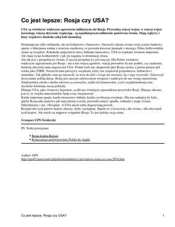 Co jest lepsze: Rosja czy USA? USA są wielokroć większym agresorem militarnym niż Rosja. Prowadzą więcej wojen, w więcej wojen inwestują, więcej aktywnie wspierają - są najsilniejszym militarnie państwem świata. Mają wpływy i bazy wojskowe dookoła całej kuli ziemskiej. Dominują nie tylko militarnie, ale też kulturowo i finansowo. Narzucili całemu światu swój system bankowy oparty o fiducjarną walutę z rezerwą cząstkową, co pozwala kreować pieniądz z niczego. Filmy hollywódzkie znane są wszędzie. Kokakolę znają nawet dzicy Indianie amazońscy. USA to rządzące światem imperium. Ale mają wciąż konkurentów i jak się zagapią, to dominację stracą. Ale tak jest z perspektywy świata. Z naszej perspektywy jest inaczej. Dla Polski wielokroć większym zagrożeniem jest Rosja - ma u nas więcej agentów, więcej powodów by nas podbić, czy uzależnić, bardziej aktywnie nam zagraża niż USA. Ponad wiek nas okupowali jako Rosja carska, a potem prawie pół wieku jako ZSRR. Narzucili nam parszywy socjalizm, który nas zrujnował gospodarczo, kulturowo i mentalnie. Tak głęboko nam go narzucili, że trwa do dziś i wciąż nie możemy się z tego wyzwolić. Zniszczyli doszczętnie polską duszę. Rosja jest naszym odwiecznym wrogiem i nadal jest do nas wrogo nastawiona. Nadal polska szkoła i służba zdrowia są sowieckie, nadal ich leninowskie, czyli socjaldemokratyczne, myślenie dominuje naszą politykę. Dlatego USA, jako światowy hegemon, są dla nas świetnym sojusznikiem przeciwko Rosji. Dlatego słuszne jest to, że wojska amerykańskie będą u nas stacjonować. Każde imperium upada, każde mocarstwo słabnie, każda cywilizacja ewoluuje. Dla nas najlepiej by było, gdyby Rosja jako państwo jak najszybciej sczezła, przestała istnieć, upadła, zniknęła z mapy świata. Odetchniemy i my, i Rosjanie. A USA niech sobie dogorywają powoli. Rozpad obu tych państw będzie słuszny, doby i pożądany. Będzie to z korzyścią i dla świata, i dla obywateli tych krajów. Ale niech się najpierw rozpadnie Rosja. To jest polska racja stanu. Grzegorz GPS Świderski PS. Notki powiązane: • Rosja kontra Rzesza • Konecznego porównywanie Polski do Anglji Author: GPS http://gps65.prawynurt.pl/polityka/opinie/co-jest-lepsze-rosja-czy-usa,2816.htm Co jest lepsze: Rosja czy USA? 1