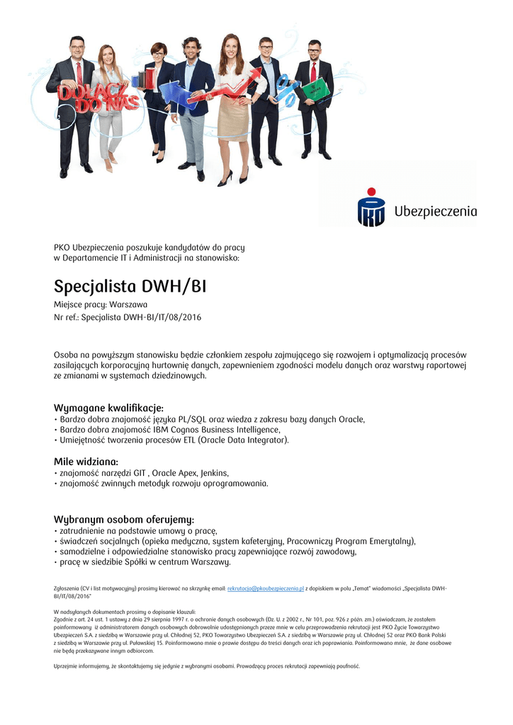 PKO Ubezpieczenia poszukuje kandydatów do pracy w Departamencie IT i Administracji na stanowisko: Specjalista DWH/BI Miejsce pracy: Warszawa Nr ref.: Specjalista DWH-BI/IT/08/2016 Osoba na powyższym stanowisku będzie członkiem zespołu zajmującego się rozwojem i optymalizacją procesów zasilających korporacyjną hurtownię danych, zapewnieniem zgodności modelu danych oraz warstwy raportowej ze zmianami w systemach dziedzinowych. Wymagane kwalifikacje: • Bardzo dobra znajomość języka PL/SQL oraz wiedza z zakresu bazy danych Oracle, • Bardzo dobra znajomość IBM Cognos Business Intelligence, • Umiejętność tworzenia procesów ETL (Oracle Data Integrator). Mile widziana: • znajomość narzędzi GIT , Oracle Apex, Jenkins, • znajomość zwinnych metodyk rozwoju oprogramowania. Wybranym osobom oferujemy: • zatrudnienie na podstawie umowy o pracę, • świadczeń socjalnych (opieka medyczna, system kafeteryjny, Pracowniczy Program Emerytalny), • samodzielne i odpowiedzialne stanowisko pracy zapewniające rozwój zawodowy, • pracę w siedzibie Spółki w centrum Warszawy. Zgłoszenia (CV i list motywacyjny) prosimy kierować na skrzynkę email: [email protected] z dopiskiem w polu „Temat” wiadomości „Specjalista DWHBI/IT/08/2016” W nadsyłanych dokumentach prosimy o dopisanie klauzuli: Zgodnie z art. 24 ust. 1 ustawy z dnia 29 sierpnia 1997 r. o ochronie danych osobowych (Dz. U. z 2002 r., Nr 101, poz. 926 z późn. zm.) oświadczam, że zostałem poinformowany iż administratorem danych osobowych dobrowolnie udostępnionych przeze mnie w celu przeprowadzenia rekrutacji jest PKO Życie Towarzystwo Ubezpieczeń S.A. z siedzibą w Warszawie przy ul. Chłodnej 52, PKO Towarzystwo Ubezpieczeń S.A. z siedzibą w Warszawie przy ul. Chłodnej 52 oraz PKO Bank Polski z siedzibą w Warszawie przy ul. Puławskiej 15. Poinformowano mnie o prawie dostępu do treści danych oraz ich poprawiania. Poinformowano mnie, że dane osobowe nie będą przekazywane innym odbiorcom. Uprzejmie informujemy, że skontaktujemy się jedynie z wybranymi osobami. Prowadzący proces rekrutacji zapewniają poufność.