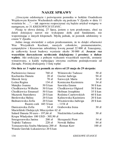 NASZE SPRAWY „Uroczyste odsłonięcie i poświęcenie pomnika w hołdzie Osadnikom Wojskowym Kresów Wschodnich odbyło się podczas V Zjazdu w dniu 11 września br. ...”. – tak zapewne rozpoczynać się będzie artykuł wstępny w następnym, nr 31 KRESOWYCH STANIC. Pisząc te słowa dzisiaj, 27 lipca, jestem o tym przekonany, choć na dzień dzisiejszy nawet nie wykopano dołu pod fundament, nie wspominając o innych kłopotach. Myślę jednak, że pomnik odsłonimy w czasie V Zjazdu. Jedno mogę stwierdzić z całym przekonaniem, że to dzięki ofiarności Was Wszystkich Kochani, naszych członków, prenumeratorów, sympatyków i Kresowian zebraliśmy kwotę ponad 22 000 zł. Szacujemy, że całkowity koszt budowy wyniesie około 30 000 zł. Jeszcze raz wszystkim darczyńcom serdecznie dziękujemy i prosimy o dalsze wpłaty. Akt erekcyjny z pełnym wykazem wszystkich nazwisk, zostanie wmurowany, a każdy wpłacający otrzyma osobiste podziękowanie od Zarządu. Poniżej drukujemy 3 listę wpłat: Oto lista nr 3 wpłat na pomnik za okres od 25 maja do 29 sierpnia: Pachniewicz Janusz 760 zł Wiśniewski Tadeusz Kucharska Danuta 20 zł Guziur Jadwiga Sławek Jerzy 70 zł Szewczyk Maria Łoźna Regina 134 zł Konieczna Kazimiera Matejko Joanna 50 $ kan Sawicka Emma Chodkiewicz Wilhelm 50 $ kan Chodkiewicz Olgierd Chodkiewicz Emanuel 50 $ kan Hofman Josephine Mazurek Stanisława 20 $ kan Rodzina Czartowskich Berdowska Halina 20 $ kan Kalinowska Kazimiera Bednarowska Zofia 20 $ kan Wiszniowska Jadwiga Razem czek 445 $ kan - 1154 zł Daniszewska Zofia 34 zł Grabowska Irena Macieliński Dedejczyk Mieczysław 62 zł Salard Danuta 50 euro - 197,66 zł Niedzielska Leokadia Krupa Władysław 100 USD - 305,90 zł Smogorzewska Janina 200 zł Skrzypecki Piotr Trąbski Tadeusz 220 zł Nowak Halina Tomaszewska Szuba Marianna 200 zł Roman Kerr Wanda Gawlak Łukasiewicz 20 $ kan 134 50 zł 94 zł 34 zł 34 zł 50 $ kan 50 $ kan 35 $ kan 60 $ kan 20 $ kan 20 $ kan 30 zł 30 zł 54 zł 84 zł 100 zł KRESOWE STANICE Mieczysław Gawlak 50 $ kan Zofia i Marian Gawlak 50 $ kan Jadwiga Gryłko Gawlak 40 $ kan Stefania Trzciankowska-Stolska50 $ kan. razem czek 210 $ kan - 556,68 zł Dębska Bronisława 50 zł Zarębski Zygmunt 50 zł Grzebyk Władysław 30 zł Dolińska Helena 50 zł Konarska Felicja 40 zł Drozd Adam 1 000 zł Więcławska Teresa 34 zł Szymański Kazimierz 35 zł Rodzina Ordyńskich 200 USD Stasik Wanda 150 USD Helena i Adam Trawka 60 GBP Mikre Włodzimierz 200 zł Maria, Wanda, Antoni Muszyńscy150 $ kan Godlewscy Leokadia i Ryszard 100 zł Sukiennik Józef 20 GBP Pani Antonina Szabunio z Kanady w intencji zmarłego męża Bronisława Szabunio, a naszego członka przekazuje na pomnik 100 $ kan. *** Na działalność Stowarzyszenia: Konarski Wawrzyniec 300 zł Stasik Wanda 150 USD *** Na Kościół w Żydomli na Białorusi Stasik Wanda 150 USD *** Witamy w naszym gronie nowych członków: 456. Haciski Wiesław os. Stołowicze, pow. Baranowicze, syn osadnika, 457. Aleksandra Kawiak os. Stołowicze, pow. Baranowicze, córka osadnika, 458. Zofia Pawłowska os. Stołowicze, pow. Baranowicze, córka osadnika, 459. Piotr Nowicki os. Husaki, pow. Stołpce, wnuk osadnika, 460. Krystyna Głuszek os. Nieciecz, pow. Lida, córka osadnika, 461. Danuta Kamińska os. Sienkiewicze. pow. Krzemieniec, córka osadnika, 462. Czesław Czyżewicz os. Horodyszcze, pow. Baranowicze, syn osadnika, 463. Jerzy Sławek os. Hołowczyce, pow. Wołkowysk, wnuk osadnika, 464. Małgorzata Rudzińska os. Narucewicze, pow. Nieśwież, prawnuczka osadnika, KRESOWE STANICE 135 465. Michał Rudziński os. Narucewicze, pow. Nieśwież, prawnuk osadnika, 466. Monika Rudzińska os. Narucewicze, pow. Nieśwież, prawnuczka osadnika, 467. Marek Rudziński os. Narucewicze, pow. Nieśwież, prawnuk osadnika, 468. Tadeusz Rochmanowski os. Koźlenice, pow. Kowel, syn osadnika. *** Staraniem Zarządu SPK (Stowarzyszenie Polskich Kombatantów) Koło nr 6 w Edmonton – Kanada, w kościele polskim p.w. Różańca św. została umieszczona tablica upamiętniająca 65. rocznicę deportacji obywateli polskich w głąb byłego ZSRR. Uroczystego poświęcenia dokonał proboszcz ww. paraf ks. Roman Majek w dniu 20 lutego 2005 Fot. W. J. Rudolf Informację i zdjęcie otrzymaliśmy od p. Janiny Muszyńskiej z Kanady. Proponuję aby ta rubryka w „Naszych sprawach” była stałą pozycją. Nadsyłajcie Państwo zdjęcia pomników i tablic upamiętniającymi naszą martyrologię, jako dowód pamięci o tych okrutnych i złych czasach. 136 KRESOWE STANICE *** Historia zawitała na Poznańską Podczas moich stałych dyżurów czwartkowych, jakie pełnię w ramach Sekretariatu, odwiedził nas Pan Ryszard Lorens, którego ojciec Leon w latach 1921-1922 jako geometra wojskowy w stopniu st. sierż. pracował na Wołyniu przy parcelacji majątków na działki dla osadników wojskowych. Otrzymaliśmy kilkanaście historycznych zdjęć które będziemy sukcesywnie zamieszczać. Oto dwa z nich: Prace przy pomiarach parcelacyjnych działek osadniczych Poświęcenie działek osadniczych żołnierzy 16 Dywizji Piechoty Pomorskiej w majątku Świniuchy. 14.08.1922 r. KRESOWE STANICE 137 *** Zapraszamy na otwarte zebrania Zarządu. Oto najbliższe terminy zebrań: 26 września, 31 października, 28 listopada 2005 r. o godz. 16.00, w każdy ostatni poniedziałek miesiąca. Warszawa ul. Poznańska 13 m. 7. Pod tym samym adresem, pełnimy stałe dyżury: · sekretariat – w każdy czwartek od 14.00 do 16.00, · redakcja KRESOWYCH STANIC – w drugi i trzeci poniedziałek miesiąca w godz. 15.30 do 17.30. *** Z żałobnej Karty Śp. Aleksandra Kasprowicz z d. Pudło Córka osadnika z osady Szeroka Kornelia woj. stanisławowskie Zmarła 9 lipca 2005 roku Cześć jej pamięci Śp. Anna Idzikowska Śliwińska Zmarła 20 czerwca 2005 roku Serdecznie żegnamy redaktor „Naszego Dziennika”, zawsze ciepło piszącej o naszym Stowarzyszeniu i KRESOWYCH STANICACH