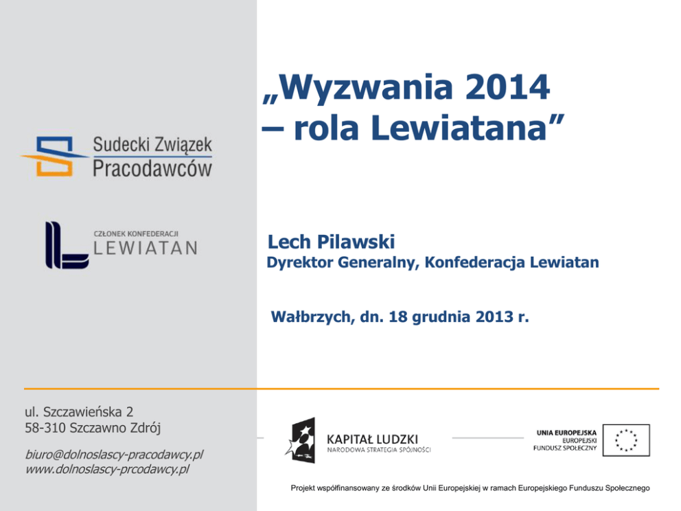 „Wyzwania 2014 – rola Lewiatana” Lech Pilawski Dyrektor Generalny, Konfederacja Lewiatan Wałbrzych, dn. 18 grudnia 2013 r. ul. Szczawieńska 2 58-310 Szczawno Zdrój [email protected] www.dolnoslascy-prcodawcy.pl Projekt współfinansowany ze środków Unii Europejskiej w ramach Europejskiego Funduszu Społecznego Wyzwania 2014 – rola Lewiatana Wałbrzych, 18 grudnia 2013 r. Lech Pilawski – Dyrektor Generalny Konfederacji Lewiatan Kształtuje się nowy porządek świata • globalizacja gwałtownie przyspiesza, • zmienia się układ sił w świecie i pojawiają się możliwości dekoncentracji władzy, •zwiększa się rola Azji – szczególnie południowo wschodniej • rola BRIC (BRICS oraz E7) •rola podmiotów niepaństwowych – np. Facebook • zmienia się pozycja Afryki (wzrost konkurencyjności wobec Europy, w tym Polski) •Problemy tzw. „łuku niestabilności” – Ameryka Płd., Afryka Płn i Subsaharyjska, Bliski Wschód, Kaukaz, centralna i wschodnia Azja Czy w 1990 roku przedsiębiorca polski mógł przejmować się nową fabryką kredek albo zabawek powstającą w Chinach? W jakim świecie budujemy konkurencyjność i atrakcyjność gospodarczą Polski? o o o o 2012 - 80% ludzi na Ziemi umie czytać i pisać, w 1880 r. - 25%; Od 1990 r. liczba ludzi mających dostęp do urządzeń sanitarnych wzrosła o 50%, W latach 1960 – 2010 śmiertelność wśród niemowląt zmalała o 60%; W latach 1981 – 2005 odsetek ludzi żyjących w nędzy (mniej niż 2,5 USD dziennie) zmalał z 75% do 57%; o W latach 1990 – 2009 produkcja żywności wzrosła o 11% na głowę, a populacja zwiększyła się o 1,5 mld; o To co dzisiaj jest biedą, w 1950 r. wielu traktowałoby jako luksus – lodówka, telewizor, samochód; o Liczba ludzi, którzy zginęli w konfliktach zbrojnych na świecie spadła z 235/1 milion w 1950 r. do 2,5/1 milion w 2007 r. Źródło: Charles Kenny, Centrum Rozwoju Globalnego, John Horgan, The End of War; Steven Pinker W jakim świecie budujemy konkurencyjność i atrakcyjność gospodarczą Polski? o o o o Od 1900 r. dwukrotnie wydłużyła się średnia długość życia; Od 1900 r. żywność staniała (relatywnie) 100 razy; Od 1900 r. koszt transportu i komunikacji zmniejszył się 1000 razy; Smartfon ma setki razy większe możliwości obliczeniowe niż komputer na pokładzie Apollo 11 (1969); Dzięki telefonom komórkowym każdy mieszkaniec Kenii ma lepszą komunikację ze światem niż Ronald Reagan w 1984 r., a jeżeli ten mieszkaniec używa telefonu– smartfona lub laptopa to ma większy dostęp do wiedzy niż Bill Clinton w 1996 r.!! Źródło: Peter Diamandis, Abundance: The Future Is Better Than You Think, 2012 Kraje G7 rozwijają się wolniej niż kraje BRIC(s). Ten trend utrzyma się w kolejnym roku Średnia roczna stopa wzrostu PKB (%) w 2007 – G7 było większe od E7 (BRIC + Indonezja, Meksyk, Turcja) ponad 60%, w 2010 – już tylko o 35% 12 10 8 6 4 2 0 -2 -4 -6 1990-1999 2000-2009 2011-2012 2012-2013 do 2050 Chiny i Indie staną się największymi gospodarkami świata, USA – znajdą się na 3 miejscu, gospodarki europejskie – Niemcy (5) i Wielka Brytania (8) na 9 i 10 Źródło: The accelerating shift of global economic power: challenges and opportunities , PWC 2011 oraz obliczenia własne PKPP LEWIATAN Jednak i w tych krajach do 2030 r. systematycznie słabnąć będzie dynamika PKB. Gospodarka światowa będzie rosła, ale znacznie wolniej niż w ostatnich 20 latach. Prognozowane tempo wzrostu PKB w w największych gospodarkach (%) Przewidywany trend wzrostowy kluczowych gospodarkach 10 9 8 realny wzrost PKB (%) 7 6 5 Indie Chiny Brazylia Rosja 4 USA 3 Wielka Brytania 2 Japonia 1 0 Źródło: World Bank 2011 Udział w światowym PKB wg PPS (%) Ranking W efekcie będzie jednak następowała zmiana roli i znaczenia gospodarek krajów UE, USA i Japonii oraz krajów BRIC, Meksyku i Indonezji USA 19,13 1 Chiny 14,32 2 Indie 5,65 3 Japonia 5,63 4 Niemcy 3,93 5 Rosja 3,02 6 Brazylia 2,91 7 Wlk. Brytania 2,87 8 Francja 2,81 9 Włochy 2,34 10 Meksyk 2,11 11 Indonezja 1,43 15 Polska 0,98 20 Zmiana pozycji USA i krajów UE oraz krajów BRIC na liście gospodarek o największym udziale w światowym PKB w PPS (w standardzie siły nabywczej) Źródło: www.worldbank.org Źródło: The Global Competitiveness Report 2012-2013, World Economic Forum 2012 Gdzie zatem szukać nowych możliwości gospodarczych? Może tam, gdzie dominacja ludnościowa zaczyna iść w parze z dominacją gospodarczą. Liczba ludności w wybranych krajach świata (mln) 1750 1500 1250 1000 750 500 250 2010 Źródło: ONZ, World Bank 2050 hi ny C In di e SA U yl ia In do ne zj a ra z ia 2025 B ig er N os ja R k Ja po ni a ek sy M ie m cy N nc ja Fr a Po ls ka 0 • Systematycznie wzrasta długość życia oraz systematycznie maleją wskaźniki urodzeń. Społeczeństwo starzeje się: • w sensie biologicznym, • w sensie strategicznym – dominacja ludzi starych sprawia, że: • gospodarka traci dynamizm, • znikają naturalne mechanizmy presji na zmianę, • nieproporcjonalnie do dochodu wytworzonego rosną wydatki na cele socjalne - ubezpieczenia, emerytury, służbę zdrowia, system opieki. Procesy demograficzne stają się kluczowym aktywem w światowej rywalizacji ekonomicznej i są powodem nowych podziałów cywilizacyjnych. Udział osób w wieku 65+ w grupie 100 osób w wieku 15-64 (%) 60 50 40 W tym podziale EU ma najsłabsze aktywa na świecie. Polska, wg prognoz, będzie w ciągu najbliższych 40 lat jednym z krajów w UE o najsłabszych „aktywa” demograficznych. 30 20 10 0 świat Chiny Indie Polska 2000 Źródło: ONZ Francja 2025 2050 Niemcy USA Japonia Czy pamiętają Państwo ten obrazek? 11 Wejście Polski do UE dało szansę na szybszy rozwój i wykorzystujemy ją. Dynamika PKB w latach 2000-2011 (%, r/r) 6,8 7 6,2 5,1 5,3 5 4,3 3,9 3,6 3,9 4,4 2010 2011 3 1,6 1,4 1 -1 1,2 2000 2001 2002 2003 2004 2005 2006 2007 2008 2009 -3 -5 Polska Lin