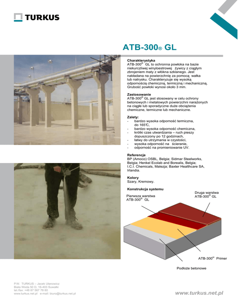 ATB-300® GL Charakterystyka ® ATB-300 GL to ochronna powłoka na bazie niekurczliwej winyloestrowej żywicy z ciągłym zbrojeniem maty z włókna szklanego. Jest nakładana na powierzchnię za pomocą wałka lub natrysku. Charakteryzuje się wysoką odpornością chemiczną, termiczną i mechaniczną. Grubość powłoki wynosi około 3 mm. Zastosowanie ® ATB-300 GL jest stosowany w celu ochrony betonowych i metalowych powierzchni narażonych na ciągłe lub sporadyczne duże obciążenia chemiczne, termiczne lub mechaniczne. Zalety: bardzo wysoka odporność termiczna, do 165°C, bardzo wysoka odporność chemiczna, krótki czas utwardzania – ruch pieszy dopuszczony po 12 godzinach, łatwy do utrzymania w czystości, wysoka odporność na ścieranie, odporność na promieniowanie UV. Referencje BP (Amoco) OSBL, Belgia; Sidmar Steelworks, Belgia; Henkel Ecolab and Borealis, Belgia; I.C.I. Chemicals, Malezja; Baxter Healthcare SA, Irlandia. Kolory Szary, Kremowy. Konstrukcja systemu Pierwsza warstwa ® ATB-300 GL Druga warstwa ® ATB-300 GL ATB-300 ® Primer Podłoże betonowe P.W. TURKUS – Jacek Ułanowicz Biała Woda 50 D, 16-403 Suwałki tel./fax: +48 87 567 78 80 www.turkus.net.pl e-mail: [email protected] www.turkus.net.pl Charakterystyka systemu ® Produkt: ATB-300 GL Wykończenie: połysk Grubość: 2 - 3 mm Kolor: Szary, Kremowy. Producent: Flowcrete Group plc Dostawca: Flowcrete Polska Sp. z o.o. Telefon : Dział Obsługi Klienta: +48 22 879 89 07 Wykonanie systemu Wykonanie sytemu powinno być przeprowadzone przez Autoryzowanego Wykonawcę zgodnie z instrukcją producenta oraz dokumentacją techniczną. Aby otrzymać szczegółowe informacje dotyczące sieci Autoryzowanych Wykonawców należy skontaktować się z Działem Obsługi Klienta lub wysłać zapytanie przez naszą stroną internetową: www.flowcrete.com Produkty wchodzące w skład systemu Podkład gruntujący: ATB-300® Primer, Wykończenie: ATB-300® GL, Wymagania dla podłoża betonowego Podkład betonowy powinien być klasy C20/25, pozbawiony mleczka cementowego, kurzu i innych zanieczyszczeń. Wilgotność względna betonu powinna być zgodna z wymaganiami dla podłoża betonowego pod posadzki Flowcrete. Podłoże betonowe nie może być narażone na działanie naporu wody gruntowej. Jeżeli podkład nie posiada izolacji przeciwwilgociowej wówczas należy zastosowć membranę Flowcrete Hydraseal DPM jako warstwę gruntującą. Kompleksowa obsługa klienta Flowcrete Group plc jest światowym liderem w branży posadzkowej specjalizującym się w obiektach przemysłowych i komercyjnych. Dostępne systemy obejmują między innymi: samorozlewne masy posadzkowe, systemy do ogrzewania podłogowego, membrany przeciwwilgociowe, posadzki przemysłowe i dekoracyjne, nawierzchnie parkingowe, systemy antykorozyjne. Naszym celem jest spełnienie Państwa wymagań w zakresie posadzek. Czyszczenie i konserwacja Posadzkę można zamiatać, odkurzać, zmywać na mokro lub sprzątać przy użyciu maszyny czyszczącej wyposażonej w tarcze szczotkowe w połączeniu ze średnio alkalicznym detergentem. P.W. TURKUS – Jacek Ułanowicz Biała Woda 50 D, 16-403 Suwałki tel./fax: +48 87 567 78 80 www.turkus.net.pl e-mail: [email protected] Dane techniczne Poniższe wyniki badań uzyskano w badaniach laboratoryjnych przy temperaturze 20˚C i 50% wilgotności względnej. Właściwość o Odporność termiczna do 165 C Twardość w skali Barcola >50 (ASTM 2583) Moduł sprężystości E 3.1 GPa (ASTM D-695) Skurcz <0.004 % Rill 4 2.5.3.2.1 Wytrzymałość na ciśnienie 160 MPa (ASTM D-695) Wytrzymałość na zginanie 125 MPa (ASTM D-790) Wytrzymałość na rozciąganie 73 MPa (ASTM D-638) Przyczepność do betonu >1,5 MPa (zniszczenie w betonie) Gęstość 1.01 kg/dm3 Czas utwardzania Ruch pieszy Ruch pojazdów Pełne utwardzenie o 20 C 12 h 24 h 72 h Czas utwardzania może być regulowany za pomocą odpowiedniego dozowania akceleratora. Powyższe czasy podano w odniesieniu do standardowych proporcji składników. Wpływ na środowisko Produkt końcowy uważany jest za nieszkodliwy dla zdrowia i środowiska. Bezspoinowość, szczelność i doskonała przyczepność do podłoża powodują, że system spełnia wymagania higieniczne i ochrony środowiska. Posadzka jest łatwa do utrzymania. Informacje uzupełniające Produkty Flowcrete zapewniają najwyższy standard jakościowy. Zasady sprzedaży materiałów oraz gwarancji zawarte są w Szczególnych Warunkach Dostaw i Sprzedaży (dokument dostępny na życzenie). W celu upewnienia się, czy wybrane przez Państwa rozwiązanie spełnia wszystkie wymagania projektowe i użytkowe prosimy o kontakt z Działem Obsługi Klienta. www.turkus.net.pl
