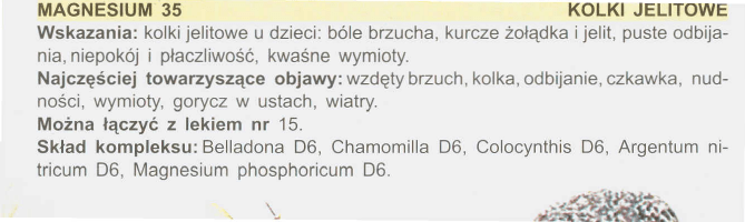 MAGNESIUM 35 KOLKI JELITOWE Wskazania: kolki jelitowe u dzieci: bóle brzucha, kurcze żołądka i jelit, puste odbijania, niepokój i płaczliwość, kwaśne wymioty. Najczęściej towarzyszące objawy: wzdęty brzuch, kolka, odbijanie, czkawka, nudności, wymioty, gorycz w ustach, wiatry. Można łączyć z lekiem nr 15. Skład kompleksu: Belladona 06, Chamomilla 06, Colocynthis 06, Argentum nitricum 06, Magnesium phosphoricum 06.