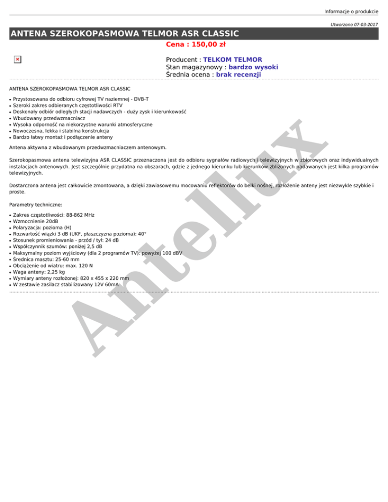 Informacje o produkcie Utworzono 07-03-2017 ANTENA SZEROKOPASMOWA TELMOR ASR CLASSIC Cena : 150,00 zł Producent : TELKOM TELMOR Stan magazynowy : bardzo wysoki Średnia ocena : brak recenzji ANTENA SZEROKOPASMOWA TELMOR ASR CLASSIC ● ● ● ● ● ● Przystosowana do odbioru cyfrowej TV naziemnej - DVB-T Szeroki zakres odbieranych częstotliwości RTV Doskonały odbiór odległych stacji nadawczych - duży zysk i kierunkowość Wbudowany przedwzmacniacz Wysoka odporność na niekorzystne warunki atmosferyczne Nowoczesna, lekka i stabilna konstrukcja Bardzo łatwy montaż i podłączenie anteny x ● Antena aktywna z wbudowanym przedwzmacniaczem antenowym. lu Szerokopasmowa antena telewizyjna ASR CLASSIC przeznaczona jest do odbioru sygnałów radiowych i telewizyjnych w zbiorowych oraz indywidualnych instalacjach antenowych. Jest szczególnie przydatna na obszarach, gdzie z jednego kierunku lub kierunków zbliżonych nadawanych jest kilka programów telewizyjnych. Dostarczona antena jest całkowicie zmontowana, a dzięki zawiasowemu mocowaniu reflektorów do belki nośnej, rozłożenie anteny jest niezwykle szybkie i proste. Parametry techniczne: ● ● ● ● ● ● ● ● ● ● Zakres częstotliwości: 88-862 MHz Wzmocnienie 20dB Polaryzacja: pozioma (H) Rozwartość wiązki 3 dB (UKF, płaszczyzna pozioma): 40° Stosunek promieniowania - przód / tył: 24 dB Współczynnik szumów: poniżej 2,5 dB Maksymalny poziom wyjściowy (dla 2 programów TV): powyżej 100 dBV Średnica masztu: 25-60 mm Obciążenie od wiatru: max. 120 N Waga anteny: 2,25 kg Wymiary anteny rozłożonej: 820 x 455 x 220 mm W zestawie zasilacz stabilizowany 12V 60mA te l ● An ●