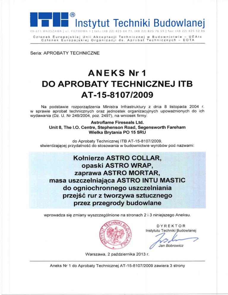 lEIl 00 61 1 \IARSZA\4lA tl nstytut Techniki Budowlanej I u1, FiLTROtVA 1 I tel : (48 22) t]25 04 71, (48 22) 825 76 55 | fax: (48 22) 825 i;.1 86 Czlonek Europejskiej Unii Akceptacji Technicznej w Budownictwie - UEAtc Czlonek Europejskiej Organizac)i ds. Aprobat Technicznych - EOTI\ Seria: APROBATY TECHNICZNE AN EKS Nr 1 DO APROBATY TEGHINICZNEJ ITB AT-1 5-8 107 112009 Na podstawie rozporzqdzenia Ministra Infrastrr.rktury z dnia 8 listopada 2004 r. w sprawie aprobat technicznych orztz jednostek organizacyjnych upowaznionych do ich wydawania (Dz. U. Nr 24912004, poz.2497), na wniosel,i firmy: Astroflame Fireseals Ltd. Unit 8, The l.O. Centre, Stephenson Roadl, Segensworth Fareham Wielka Brytania PO 1ti sRU do Aprobaty Technicznej ITB AT-15-81 0712009, stwierdzajqcej przydatnoS6 do stosowania w budownictwie wyrobow pod nazwami: Koln ierze ASTRO GOLLAR, opaski ASTRO WRAP, zapfawa ASTRO MORTAR, masa uszczelniajqca ASTRO INTU MASTIG do ogniochronnego usizczelniania przej6e rLrr z twozywa sztucznego przez pz.eg rody budowlane wprowadza siq zmiany wyszczegolnione na stronach 2 i 3 niniejszego Aneksu. DYREKTOR Warszawa,2 pa2dziernika 2013 r. Aneks Nr 1 do Aprobaty Technicznej AT-1 5-8i107l2OO9 zawiera 3 strony |_-.lf_lt-]r@ Aneks nr 1 do AT-15-8107/2009 L-]TL]T 1) s;tr. A3 .1. pl. ,,Pzeznaczenie izekres stosowania kolniezy ASIRO COLLAR" zmienia siq zapisy w poz. 6 tablicy 1, W p. 2.1 zl Rodzaj Rodzaj Poz. tworzywa rury przegrody Srednica rury D, mm z 1 Wymiary wkladu pgczniejqcego;; wysoko56 x grubo56, mm 4 o PP, PVC, MUPVC, UPVC Stropy >82+3110 Metoda uszczelnienia przej6cia o 60x12 PN-8-02851-1:1997 iPN-EN 13501-2:2008 7 p.2.2.2 irys. Klasa odporno5r:i ogniowej pzej5cia wg 5 E 180 na: Rodzaj Rodzaj Poz. tworzywa rury przegrody Srednica rury D, mm 4 1 Stropy 2) Metoda pecznreJecegoji uszczelnienia wysoko56 x grubo56, mm przej6cia 5 o 60x8 PVC, PP h Wymiary wkladu > 82+ 3110 MUPVC, UPVC 60x 12 p.2.2.2 i rys. 5 Klasa odporno5ci ogniowej przej5cia wg PN-8-02851 -1 :1 997 i PN-EN 13501-2:2008 7 Et 180 W p. 2.2.2. pt. ,,Warunki stosowania kolnierzy ASTRO COLLAR'zmienia sig ostatnie zdanie. zi ,,Szczeliny o szerokoSci wiqkr;zej ni2 5 mm, (ale nie wiqkszej ni2 10 mm) nalezy wypetn 6 zapr aw qog n och ro n nr q AS RTO MORTA,R. " i i na: ,,Szczeliny o szeroko6ci wiqkrszej niZ 5 mm, erle nie wiqkszej ni2 10 mm, nale2y wypelnic zaptawqogniochronnq ASRTO MORT/IR lub niepalnq zaprawqmineralrrq. (np. cementow4 gipsowq)." 3) w p.2.2.3. pt. ,,Warunki stosowania opasek ogniochronnych ASTRO WRAP'zmienia siq zdanie 1), a). za i usz:czelnic przej6cie, na gfqboko6ci h = 10 mm przegrody, zaprawE ogniochronnqASRTO MIORTAR (rys. 6), lub a) jednq w osi Sciany od lica na: i usz:czelni6 przej5cie, na gNqboko6ci h = 10 mm od lica przegrody, zaprawq ogniochronnq ASRTO MORTAR albo niepalnq zaprawq a) jednq w osi Sciany mineralnq(np. cementow4 gipsowq) (rys. 6), lub t-tftrr@ L-I 4) Aneks nr 1 do AT-15-8107/2009 T L-jT s;tr. 3/3 w p. 2.2.3. pt. ,,Warunki stosowania opasek ogniochronnych ASTRO WRAP'zmienia siq zdanie 2), a): zi a) jednqwewnqtz stropu, w odleglo5ci 10 mm od dolnej powiezchni stropu i uszczelni6 pzej6de po obu stronach stropu, na glqbokoiici 10 mm od lica przegrody, zerprawq ogniochronnqASRTO MOFITAR (rys 7), na: a) jednqwewnqtz stropu, w odleglo6ci 10 mm od dolnej powiezchni stropu iuszczelni6 pzejScie po obu stronach stropu, na glgboko$ci 10 mm od lica przegrody, zerprawq ogniochronnq ASRTO MOIRTAR lub niepalneLza1awq mineralnq (np. cemenrtowq) (rys.7), 5) w p.2.2.3. pt. ,,Warunki stosowania opasek ogniochronnych ASTRO WRAP'zmienia siq zdanie'. zl Po zamontowaniu opaski, powstale wolne przestrzenie pomiqdzy rurE a obrze2em otworu w przegrodzie nale2y us:zczelni6 zaprawq ogniochronnq ASRTO MORTAR lub masE uszczelniajqcqASTRO lNTI.J MASTIC jak opisano .vqlZq. na: Po zamontowaniu opaski, powstaNe wolne przestrzenie pomiqdzy rurE a obrze2em otworu w przegrodzie nale?y uszczelni6 zaprawq ogniochronnq ASRTO MORTI\R lub niepalnq zaprawqmineralnq (np. c;ementow4 gipsornrq) albo masE uszczelniajqcq ASTRO INTU MASTIC jak opisano WZeJ. 6) W rozdziale pt. INFORMACJE DODATKOWE, Raporty, sprawozdania z badan, klasyfikacje i oceny wprowadza siq nowe oceny: NP-5625R/13 Ocena klasyfikacji w zakresie odp<trnoSci ogniowej uszczelnieh ptrzejSc rur z PVC przez strop, zabezpieczonych przy uZyciu kolnierzy ASIRO COLLAR. Instyturt Techniki Budowlanej, Zaklad Badari Ogniowych. Warszawa , 2013.09.27 NP-5625.1R/13Ocena klasyfikacyjna w zakresiet odpornoSci ogniowej uszcz'elnieh przejSc rur z PP' przez strop, zabezpieczonych przy u2yciu kolnierzy ASIRO COLLAR. Instytut Techniki Budowlanej, Zaklad l3adari Og niowych. Warszawa, 201 3.09.27 KONIEC