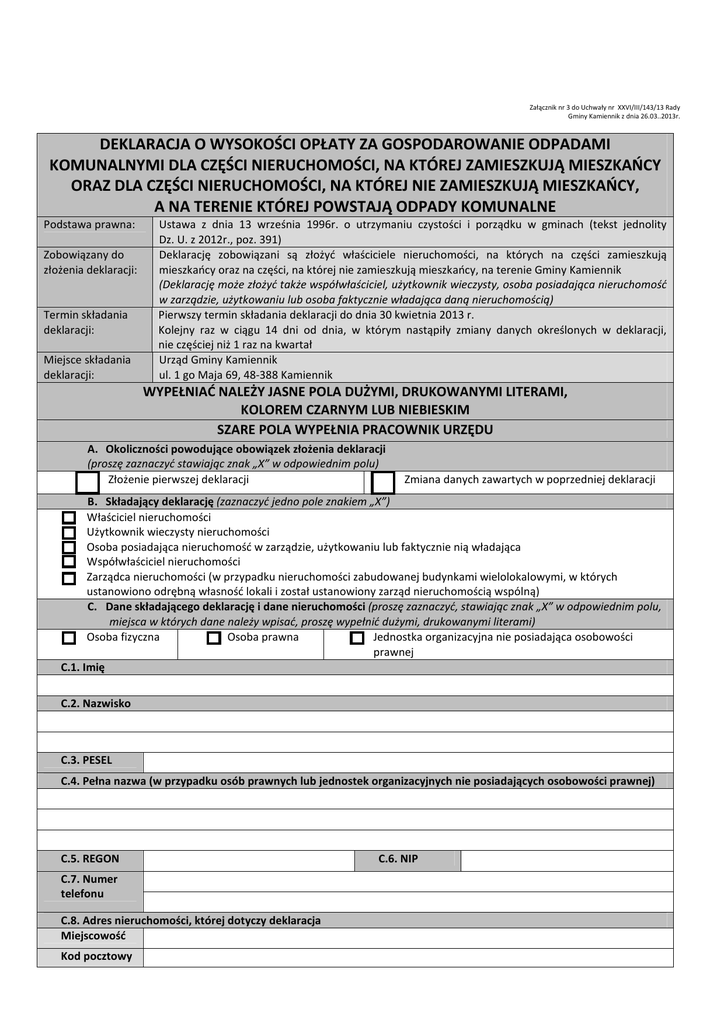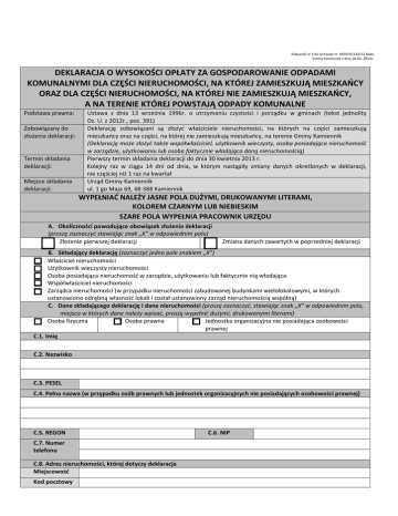 Załącznik nr 3 do Uchwały nr XXVI/III/143/13 Rady Gminy Kamiennik z dnia 26.03..2013r. DEKLARACJA O WYSOKOŚCI OPŁATY ZA GOSPODAROWANIE ODPADAMI KOMUNALNYMI DLA CZĘŚCI NIERUCHOMOŚCI, NA KTÓREJ ZAMIESZKUJĄ MIESZKAŃCY ORAZ DLA CZĘŚCI NIERUCHOMOŚCI, NA KTÓREJ NIE ZAMIESZKUJĄ MIESZKAŃCY, A NA TERENIE KTÓREJ POWSTAJĄ ODPADY KOMUNALNE Podstawa prawna: Zobowiązany do złożenia deklaracji: Termin składania deklaracji: Miejsce składania deklaracji: Ustawa z dnia 13 września 1996r. o utrzymaniu czystości i porządku w gminach (tekst jednolity Dz. U. z 2012r., poz. 391) Deklarację zobowiązani są złożyć właściciele nieruchomości, na których na części zamieszkują mieszkańcy oraz na części, na której nie zamieszkują mieszkańcy, na terenie Gminy Kamiennik (Deklarację może złożyć także współwłaściciel, użytkownik wieczysty, osoba posiadająca nieruchomość w zarządzie, użytkowaniu lub osoba faktycznie władająca daną nieruchomością) Pierwszy termin składania deklaracji do dnia 30 kwietnia 2013 r. Kolejny raz w ciągu 14 dni od dnia, w którym nastąpiły zmiany danych określonych w deklaracji, nie częściej niż 1 raz na kwartał Urząd Gminy Kamiennik ul. 1 go Maja 69, 48-388 Kamiennik WYPEŁNIAĆ NALEŻY JASNE POLA DUŻYMI, DRUKOWANYMI LITERAMI, KOLOREM CZARNYM LUB NIEBIESKIM SZARE POLA WYPEŁNIA PRACOWNIK URZĘDU A. Okoliczności powodujące obowiązek złożenia deklaracji (proszę zaznaczyć stawiając znak „X” w odpowiednim polu) Złożenie pierwszej deklaracji Zmiana danych zawartych w poprzedniej deklaracji B. Składający deklarację (zaznaczyć jedno pole znakiem „X”) Właściciel nieruchomości Użytkownik wieczysty nieruchomości Osoba posiadająca nieruchomość w zarządzie, użytkowaniu lub faktycznie nią władająca Współwłaściciel nieruchomości Zarządca nieruchomości (w przypadku nieruchomości zabudowanej budynkami wielolokalowymi, w których ustanowiono odrębną własność lokali i został ustanowiony zarząd nieruchomością wspólną) C. Dane składającego deklarację i dane nieruchomości (proszę zaznaczyć, stawiając znak „X” w odpowiednim polu, miejsca w których dane należy wpisać, proszę wypełnić dużymi, drukowanymi literami) Osoba fizyczna Osoba prawna Jednostka organizacyjna nie posiadająca osobowości prawnej C.1. Imię C.2. Nazwisko C.3. PESEL C.4. Pełna nazwa (w przypadku osób prawnych lub jednostek organizacyjnych nie posiadających osobowości prawnej) C.5. REGON C.7. Numer telefonu C.8. Adres nieruchomości, której dotyczy deklaracja Miejscowość Kod pocztowy C.6. NIP Poczta Ulica Nr domu Nr lokalu C.9. Adres zamieszkania (lub adres siedziby składającego deklarację) Adres zamieszkania składającego deklarację (lub adres siedziby składającego deklarację) jest taki sam jak adres nieruchomości, której dotyczy deklaracja (proszę zaznaczyć znak „X” i pominąć pozostałą część punktu C.9.) Gmina Miejscowość Kod pocztowy Poczta Ulica Nr domu Nr lokalu D. Dane na temat sposobu zbierania i magazynowania odpadów 1 D.1. Sposób zbierania odpadów Odpady komunalne będą zbierane w sposób Odpady komunalne nie będą zbierane w selektywny zgodnie z regulaminem sposób selektywny utrzymania czystości i porządku na terenie Gminy Kamiennik E. Opłata za gospodarowanie odpadami komunalnymi dla części nieruchomości, na której nie zamieszkują mieszkańcy, a powstają odpady komunalne (dotyczy ilości pojemników danego rodzaju dla odpadów komunalnych) E.1. Ilość pojemników (lub worków) przeznaczona do zbierania odpadów (należy wpisać ilość pojemników lub worków jaka będzie ustawiona na terenie nieruchomości, której dotyczy deklaracja) Deklaruję zapotrzebowanie Deklaruję Pojemników 120l Pojemników 120l na następującą ilość zapotrzebowanie na kontenerów, pojemników, następującą ilość Pojemników 240l Pojemników 240l worków przeznaczonych do pojemników, worków Pojemników 1100l Pojemników 1100l zbierania zmieszanych przeznaczonych do 3 3 Pojemników 2,5 m Pojemników 2,5 m odpadów komunalnych zbierania odpadów surowcowych (suchych) E.2.Wysokość opłaty miesięcznej za pojemnik o określonej pojemności dla części nieruchomości, na której nie zamieszkują mieszkańcy Na zmieszane odpady komunalne Stawki opłat w przypadku Stawki opłat w przypadku braku selektywnej zbiórki odpadów selektywnej zbiórki odpadów Pojemnik 120l 19,24 zł 25,01 zł Pojemnik 240l Pojemnik 1100l Pojemnik 2,5 m 3 50,04 zł 176,40 zł 229,32 zł 400,91 zł 521,18 zł Na odpady surowcowe (suche) Stawki opłat w przypadku selektywnej zbiórki odpadów 13,22 zł Pojemnik 120l Pojemnik 240l 26,44 zł Pojemnik 1100l Pojemnik 2,5 m 38,49 zł 121,18 zł 3 275,40 zł E.3. Obliczenie stawki opłaty miesięcznej dla części nieruchomości dla części nieruchomości, na której nie zamieszkują mieszkańcy, a na terenie której powstają odpady komunalne (kwotę należy podać w złotych polskich z dokładnością do dwóch miejsc po przecinku) Zmieszane odpady komunalne Stawka opłaty z pkt. Ilość pojemników E.2. z pkt. E.1. Pojemnik 120l * = Pojemnik 240l * = * = * = Pojemnik 1100l 3 Pojemników 2,5 m Odpady surowcowe (suche) Stawka opłaty z pkt. Ilość pojemników z E.2. pkt. E.1. Pojemnik 120l * = Pojemnik 240l * = * = * = Pojemnik 1100l 3 Pojemników 2,5 m Wysokość opłaty za gospodarowanie odpadami komunalnymi (opłata do zapłaty) obliczona samodzielnie przez właściciela nieruchomości, zgodnie ze złożoną deklaracją, ponoszona będzie zgodnie z Uchwałą Nr XXIV/119/12 Rady Gminy Kamiennik z dn. 13.12.2012 r. o terminie, częstotliwości i trybie uiszczania opłaty od mieszkańców, określone w Uchwale Rady Gminy Kamiennik nr XXVI/126/13 z dnia 24.01.2013 r. F. Opłata za gospodarowanie odpadami komunalnymi dla części nieruchomości, na której zamieszkują mieszkańcy, (zaznaczyć znakiem „X” lub w przypadku większej ilośc