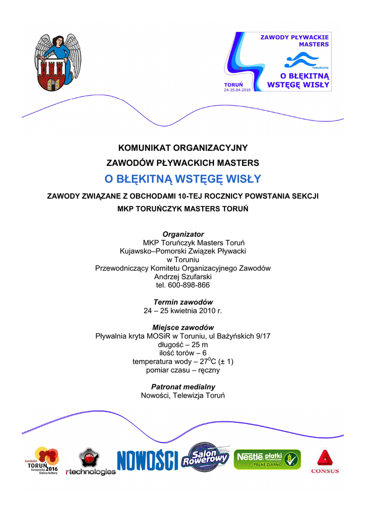 KOMUNIKAT ORGANIZACYJNY ZAWODÓW PŁYWACKICH MASTERS O BŁĘKITNĄ WSTĘGĘ WISŁY ZAWODY ZWIĄZANE Z OBCHODAMI 10-TEJ ROCZNICY POWSTANIA SEKCJI MKP TORUŃCZYK MASTERS TORUŃ Organizator MKP Toruńczyk Masters Toruń Kujawsko–Pomorski Związek Pływacki w Toruniu Przewodniczący Komitetu Organizacyjnego Zawodów Andrzej Szufarski tel. 600-898-866 Termin zawodów 24 – 25 kwietnia 2010 r. Miejsce zawodów Pływalnia kryta MOSiR w Toruniu, ul BaŜyńskich 9/17 długość – 25 m ilość torów – 6 temperatura wody – 270C (± 1) pomiar czasu – ręczny Patronat medialny Nowości, Telewizja Toruń I. 1. 2. 3. 4. Uczestnictwo Prawo startu w zawodach mają zawodniczki i zawodnicy w wieku od 20 lat (rok urodzenia 1990 i starsi). KaŜdy zawodnik moŜe uczestniczyć w dwóch konkurencjach indywidualnych i jednej sztafecie w bloku. Zawodnicy muszą złoŜyć pisemne oświadczenia, Ŝe są zdrowi i startują na własną odpowiedzialność. Zawodnicy reprezentujący kluby i sekcje zrzeszone lub niezrzeszone w PZP muszą zgłosić się do zawodów tylko w ramach zgłoszenia klubowego. Zawodnicy niezrzeszeni zgłaszają się indywidualnie. II. Zgłoszenia 1. Zgłoszenie w formie elektronicznej naleŜy przesłać na adres: [email protected] 2. Zgłoszenie w tej formie dostępne są do pobrania na stronie: www.omegatiming.pl Poprawnie wypełnione zgłoszenie w formacie Lenex lub wskazanym w załączniku powinno zawierać: listę zawodników z podaniem roku urodzenia, kategorii wiekowej, nazwy klubu, wybranych konkurencji z podaniem aktualnych czasów (wzór w załączeniu). Zgłoszenia naleŜy przesłać na adres [email protected] lub listownie na adres Andrzej Szufarski, ul. Matejki 60/7, 87-100 Toruń w nieprzekraczalnym terminie do 15.04.2010 roku. Listy startowe zostaną opublikowane w dniu 20.04.2010 r. na stronach: www.torunczyk.rtechnologies.pl www.masters.kania.pl III. Kategorie wiekowe Grupa młodzieŜowa: „0” 20-24 lata A B C D E F 25-29 30-34 35-39 40-44 45-49 50-54 Kategorie Masters: G H I J K L 55-59 60-64 65-69 70-74 75-79 80-84 i dalej co 5 lat IV. Sztafety klubowe Sztafetę stanowią wyłącznie zawodnicy jednego klubu. Nie dopuszcza się startu zawodników z grupy „0” w sztafetach kategorii Masters. Łączny wiek czterech zawodników: Grupa młodzieŜowa: „0” 80-96 lat A B C 100-119 120-159 160-199 Kategorie Masters: D E F 200-239 240-279 280+ V. Przepisy techniczne Zawody będą przeprowadzone seriami na czas. Serie będą ustalone zgodnie z przepisami pływania – wg zgłoszonych aktualnych czasów. Osoby bez podanych czasów będą startowały w najsłabszych seriach. Podczas zawodów obowiązują przepisy FINA, PZP i zasady organizacji zawodów Masters. VI. Program zawodów 11.00 – 13.30 14.00 14.30 – 15.15 15.20 15.30 BLOK I – 24.04.2010 r. (sobota) rejestracja zawodników odprawa techniczna rozgrzewka uroczyste otwarcie zawodów rozpoczęcie konkurencji pływackich Konkurencje BLOK I: Nr 1-2 3-4 5-6 7-8 9-10 11-12 13 Konkurencja 200 zm K/M 50 grzb K/M 100 dow K/M 50 klas K/M 100 mot K/M 200 dow K/M 4 x 50 zm MIX BLOK II – 25.04.2010 r. (niedziela) 9.30 – 10.15 rozgrzewka 10.20 rozpoczęcie konkurencji pływackich . Konkurencje BLOK II: Nr Konkurencja 14-15 100 zm K/M 16-17 100 grzb K/M 18-19 50 dow K/M 20-21 100 klas K/M 22-23 50 mot K/M 24-25 400 zm K/M 26 4 x 50 dow MIX VII. Nagrody 1. Za zajęcie miejsca 1-3 we wszystkich kategoriach wiekowych w konkurencjach indywidualnych i sztafetach – dyplomy. 2. Ponadto 10 najlepszych zawodniczek i 10 najlepszych zawodników wg punktacji Masters – nagrody. 3. KaŜdy uczestnik zawodów otrzymuje okolicznościowy upominek. VIII. Zasady finansowania Opłata startowa wynosi 40,00 zł od kaŜdego zawodnika. Opłata moŜe być wniesiona w dniu zawodów lub wpłacona do dnia 15.04.2010 r. na konto klubu nr: 62 1160 2202 0000 0000 5531 3744, z dopiskiem opłata startowa zawody Masters „O Błękitną Wstęgę Wisły”. IX. Postanowienia końcowe Podczas zawodów obowiązują przepisy FINA i PZP oraz regulaminy i przepisy ruchu Masters. W sprawach nie określonych regulaminem, komunikatami oraz innymi przepisami decyzje podejmuje Przewodniczący Komitetu Organizacyjnego i Sędzia Główny zawodów. X. Zakwaterowanie Istnieje moŜliwość zakwaterowania w: 1. Hoteliku na basenie MOSiR – Toruń, ul. BaŜyńskich 9/17, tel. 566233634 (ok. 20 miejsc). 2. Hotel Refleks – Toruń, ul. Wojska Polskiego 24 (200 m od basenu), tel. 566230015, fax. 566230711, e-mail: [email protected] (ok. 50 miejsc). Ustalenia telefoniczne – rezerwacja zbiorowa faxem bądź e-mailem przez klub na hasło: zawody pływackie „O Błękitną Wstęgę Wisły” z podaniem ilości zawodników i podziałem na K/M. Pokoje 1-2 osobowe ze śniadaniem – cena 80 zł/osoba. 3. Hotel ALFA – Toruń, ul. Grudziądzka 132 tel. 566231097 (ok. 50 miejsc). Rezerwacja telefoniczna na hasło: zawody pływackie „O Błękitną Wstęgę Wisły”. Pokoje 2, 3, 4 osobowe – cena 25 zł/osoba. Rezerwacja dla hoteli z pozycji od 1 do 3 wygasa w dniu 4.04.2010 r. 4. Hotel FORT IV – Toruń, ul. B. Chrobrego 86 (róg z ul. Mleczną). Strona internetowa: www.fort.torun.pl, e-mail: [email protected], tel. 56 655 82 36, fax. 566558236. Ustalenia telefoniczne – rezerwacja na fax. lub e-mail na hasło: zawody pływackie „O Błękitną Wstęgę Wisły” z podaniem nazwy klubu, nazwiska rezerwującego i tel. kontaktowego. NaleŜy podać ilość osób z rozdziałem na K/M. Pokoje 1, 2, 3 osobowe kl. turystyczna – 35 miejsc – cena 28 zł/osobę. Pokoje 2, 3 osobowe z łazienką – 5 miejsc – 28 zł/osoba. Pokój koszarowy (wieloosobowy) – 20 miejsc – 22 zł/osoba. Rezerwacja wygasa w dniu 1.04.2010 r. 5. Dwór Mieszczański – Toruń, ul. Podmurna 4/6, tel. 566555033. Rezerwacja w godz. 8.00 do 14.00. Pokoje w okolicy zamku krzyŜackiego, z widokiem na Wisłę, na starówce. Najlepiej dla jednorodnej grupy. Pokoje gościnne: dwa pokoje 1 osobowe