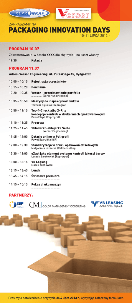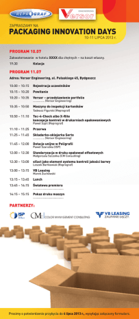 Zapraszamy na Packaging Innovation Days 10-11 lipca 2013 r. Program 10.07 Zakwaterowanie w hotelu XXXX dla chętnych – na koszt własny. 19:30 Kolacja Program 11.07 Adres: Versor Engineering, ul. Pułaskiego 45, Bydgoszcz 10:00 – 10:15 Rejestracja uczestników 10:15 – 10:20 Powitanie 10:20 – 10:35Versor – przedstawienie portfolio …………… (Versor Engineering) 10:35 – 10:50 Maszyny do inspekcji kartoników Tadeusz Figurski (Reprograf) 10:50 – 11:10Tec-4-Check albo X-Rite koncepcje kontroli w drukarniach opakowaniowych Paweł Szpil (Reprograf) 11:10 – 11:25 Przerwa 11:25 – 11:45 Składarko-sklejarka Serto …………… (Versor Engineering) 11:45 – 12:00 Dotacje unijne w Poligrafii Paweł Szarubka (ISP) 12:00 – 12:30Standaryzacja w druku opakowań offsetowych Małgorzata Szczotka (CM Consulting) 12:30 – 13:00eXact jako element systemu kontroli jakości barwy Leszek Bartkowiak (Reprograf) 13:00 – 13:15 VB Leasing Marek Żuchowski 13:15 – 13:45 Lunch 13:45 – 14:15 Światowa premiera ……………........................ 14:15 – 15:15 Pokaz druku maszyn ……………........................ Partnerzy: Prosimy o potwierdzenie przybycia do 4 lipca 2013 r., wysyłając załączony formularz. formularz zgłoszeniowy Potwierdzam uczestnictwo w konferencji Packaging Innovation Days organizowanej w dniach 10-11 lipca 2013 r. w Bydgoszczy Imię i nazwisko Nazwa firmy Proszę o rezerwację pokoju 1-os. w terminie 10-11 lipca 2013 r. tak zaznacz właściwe przez wstawienie „X” • nie zakwaterowanie na koszt własny • koszt noclegu XXX zł/dobę (pokój 1-os.) Podpis Prosimy o potwierdzenie przybycia do 4 lipca 2013 r., wysyłając wypełniony formularz na adres: [email protected] lub faksem: 22 539 40 10. Partnerzy: