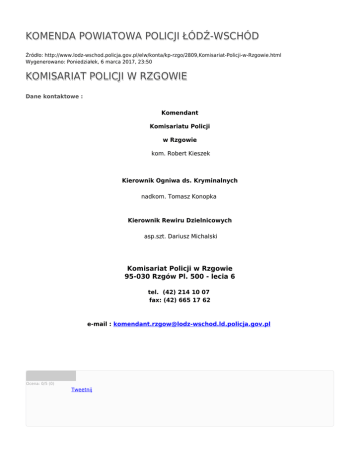 KOMENDA POWIATOWA POLICJI ŁÓDŹ-WSCHÓD Źródło: http://www.lodz-wschod.policja.gov.pl/elw/konta/kp-rzgo/2809,Komisariat-Policji-w-Rzgowie.html Wygenerowano: Poniedziałek, 6 marca 2017, 23:50 KOMISARIAT POLICJI W RZGOWIE Dane kontaktowe : Komendant Komisariatu Policji w Rzgowie kom. Robert Kieszek Kierownik Ogniwa ds. Kryminalnych nadkom. Tomasz Konopka Kierownik Rewiru Dzielnicowych asp.szt. Dariusz Michalski Komisariat Policji w Rzgowie 95-030 Rzgów Pl. 500 - lecia 6 tel. (42) 214 10 07 fax: (42) 665 17 62 e-mail : [email protected] Ocena: 0/5 (0) Tweetnij