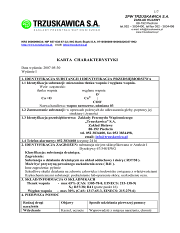 1/7 ZPW TRZUSKAWICA S.A. ZAKŁAD KUJAWY 88-192 Piechcin tel.052 – 3834400, tel/fax 052 - 3834498 e-mail: [email protected] www.trzuskawica.pl KRS 0000096034; NIP 657-038-67-32; ING Bank Śląski S.A. 97105000861000002203571902 http://www.trzuskawica.pl email: [email protected] KARTA CHARAKTERYSTYKI Data wydania: 2007-05-30 Wydanie I 1. IDENTYFIKACJA SUBSTANCJI I IDENTYFIKACJA PRZEDSIĘBIORSTWA 1.1 Identyfikacja substancji: mieszanina tlenku wapnia i węglanu wapnia. Wzór cząsteczki: tlenku wapnia węglanu wapnia OCa =O Ca2+ COONazwa handlowa: wapno nawozowe, odmiana 03 1.2 Zastosowanie substancji: w uprawach polowych do odkwaszania gleby, poprawy jej struktury i Ŝyzności 1.3 Identyfikacja przedsiębiorstwa: Zakłady Przemysłu Wapienniczego „Trzuskawica” S.A. Zakład Bielawy 88-192 Piechcin tel. 052 3834400, fax 052 3834498, email: [email protected] 1.4 Telefon alarmowy: 052 3834408 (czynny 24 h) 2. IDENTYFIKACJA ZAGROśEŃ: substancja nie jest sklasyfikowana w Aneksie I Dyrektywy 67/548/EWG Klasyfikacja: substancja draŜniąca. ZagroŜenia: Substancja o działaniu draŜniącym na układ oddechowy i skórę ( R37/38 ). MoŜe być przyczyną powaŜnego uszkodzenia oczu ( R41 ). Inne zagroŜenia: pylenie Szkodliwe skutki działania na zdrowie człowieka i środowisko związane z właściwościami fizykochemicznymi substancji: podraŜnienie lub oparzenie skóry, uszkodzenie oczu. 3. SKŁAD/INFORMACJA O SKŁADNIKACH Tlenek wapnia - max 65% (CAS: 1305-78-8, EINECS: 215-138-9) Xi; R37/38; R41 (patrz punkt 16) Węglan wapnia - max 30% (CAS: 1317-65-3, EINECS: 215-279-6) 4. PIERWSZA POMOC Rodzaj drogi naraŜenia Wdychanie Objawy Sposób udzielania pierwszej pomocy Kaszel, uczucie Wyprowadzić z miejsca naraŜenia, chronić 2/7 palenia, krótki oddech Kontakt ze skórą Kontakt z oczami Połknięcie przed utratą ciepła. W razie potrzeby stosować sztuczne oddychanie. Potrzebna natychmiastowa pomoc lekarska. Zaczerwienienie Zdjąć odzieŜ, zanieczyszczoną skórę skóry, pieczenie, przetrzeć na sucho, a następnie myć bardzo ból duŜą ilością chłodnej wody przynajmniej przez 15 minut. Nie stosować mydła ani środków zobojętniających. ZałoŜyć na oparzenia jałowe opatrunki. Wezwać lekarza. MoŜe być konieczna konsultacja dermatologiczna. Zaczerwienienie, Natychmiast usunąć szkła kontaktowe, czystą ból, zaburzenie chusteczką usunąć większe kawałki wapna, widzenia płukać oczy co najmniej 15 minut duŜą ilością roztworu soli fizjologicznej lub wody (unikać silnego strumienia ze względu na ryzyko uszkodzenia rogówki). Uwaga: osoby naraŜone na kontakt wapna nawozowego z oczami powinny być pouczone o konieczności i sposobie ich natychmiastowego płukania. W kaŜdym przypadku skaŜenia oczu konieczna pilna konsultacja okulistyczna. Uczucie palenia, Nie wywoływać wymiotów. Podawać do ból brzucha, picia zimną czystą wodę, małymi porcjami. wymioty Nigdy nie podawać niczego do picia osobie nieprzytomnej. Potrzebna natychmiastowa pomoc lekarska. Wskazówki ogólne Efekty mogą być opóźnione. W przypadku wystąpienia zaburzeń zasięgnąć porady lekarza, pokazać opakowanie produktu. 5. POSTĘPOWANIE W PRZYPADKU POśARU Niepalne ciało stałe, zawierające równieŜ proszek i pył. Nie podtrzymuje palenia. Reaguje z wodą z wydzieleniem duŜej ilości ciepła, która moŜe być wystarczająca do zapalenia materiałów łatwopalnych. W przypadku poŜaru w otoczeniu naleŜy stosować gaśnice proszkowe lub śniegowe ABCE. Do gaszenia poŜaru nie stosować wody i środków pochodnych. SłuŜby Ratownicze powinny stosować odzieŜ ochronną oraz indywidualne środki ochrony dróg oddechowych i oczu. Nie ma specjalnych wymagań dla sprzętu ochronnego dla SłuŜb Ratowniczych. 6. POSTĘPOWANIE W PRZYPADKU NIEZAMIERZONEGO UWOLNIENIA DO ŚRODOWISKA Rozsypany produkt ostroŜnie zebrać (nie wzbijając obłoku pyłu) do zamykanego pojemnika lub pyłoszczelnego worka (patrz pkt 13). Unikać kontaktu substancji z wodą. UŜywać środków ochrony indywidualnej (patrz pkt 8), zapewnić odpowiednią wentylację oraz kontrolować pylenie. Unikać niezamierzonego uwolnienia do wód powierzchniowych i gruntowych (wzrost pH). 7. POSTĘPOWANIE Z SUBSTANCJĄ I JEJ MAGAZYNOWANIE 7.1 Postępowanie z substancją Przechowywać poza zasięgiem dzieci. Podczas stosowania nie jeść, nie pić, unikać bezpośredniego kontaktu substancji z oczami i skórą, unikać wdychania pyłu. Pracować 3/7 w pomieszczeniach wyposaŜonych w wentylację ogólną lub miejscową. Przestrzegać zasad higieny osobistej, stosować środki ochrony indywidualnej (patrz pkt 8). 7.2 Magazynowanie Magazynować w pomieszczeniach lub zbiornikach zabezpieczających przed zawilgoceniem, oznakowanych zgodnie z Rozporządzeniem Ministra Zdrowia z dn. 14 marca 2003 r.( DU nr 61 z 2003 r., poz.552) w sprawie sposobu oznakowania miejsc, rurociągów oraz pojemników i zbiorników słuŜących do przechowywania lub zawierających substancje niebezpieczne lub preparaty niebezpieczne. Zabezpieczyć przed moŜliwością zanieczyszczenia. Nie transportować ani przechowywać w zbiornikach z aluminium zwłaszcza gdy jest ryzyko kontaktu substancji z wodą. KaŜdy zbiornik, w którym przechowywana jest substancja powinien być wyposaŜony w odpylacz o odpowiedniej skuteczności, a pomieszczenie w wentylację ogólną lub miejscową. 7.3 Specyficzne zastosowania Nie ma osobnych zaleceń dotyczących specyficznych zastosowań substancji. 8. KONTROLA NARAśENIA I ŚRODKI OCHRONY INDYWIDUALNEJ 8.1 Wartości graniczne naraŜenia Zgodnie z Rozporządzeniem Ministra Pracy i Polityki Społecznej z dnia 29 listopada 2002 r. w sprawie najwyŜszych dopuszczalnych stęŜeń i natęŜeń czynników szkodliwych dla zdrowia w środowisku pracy (Dz.U.02.217.1833) najwyŜsze dopuszczalne stęŜenie to dla: tlenku wapnia węglanu wapnia 3 NDS - 2mg/m NDS - 10mg/m3 NDSCh - 6mg/m3 8.2 Kontrola naraŜenia 8.2.1 Kontrola naraŜenia 
