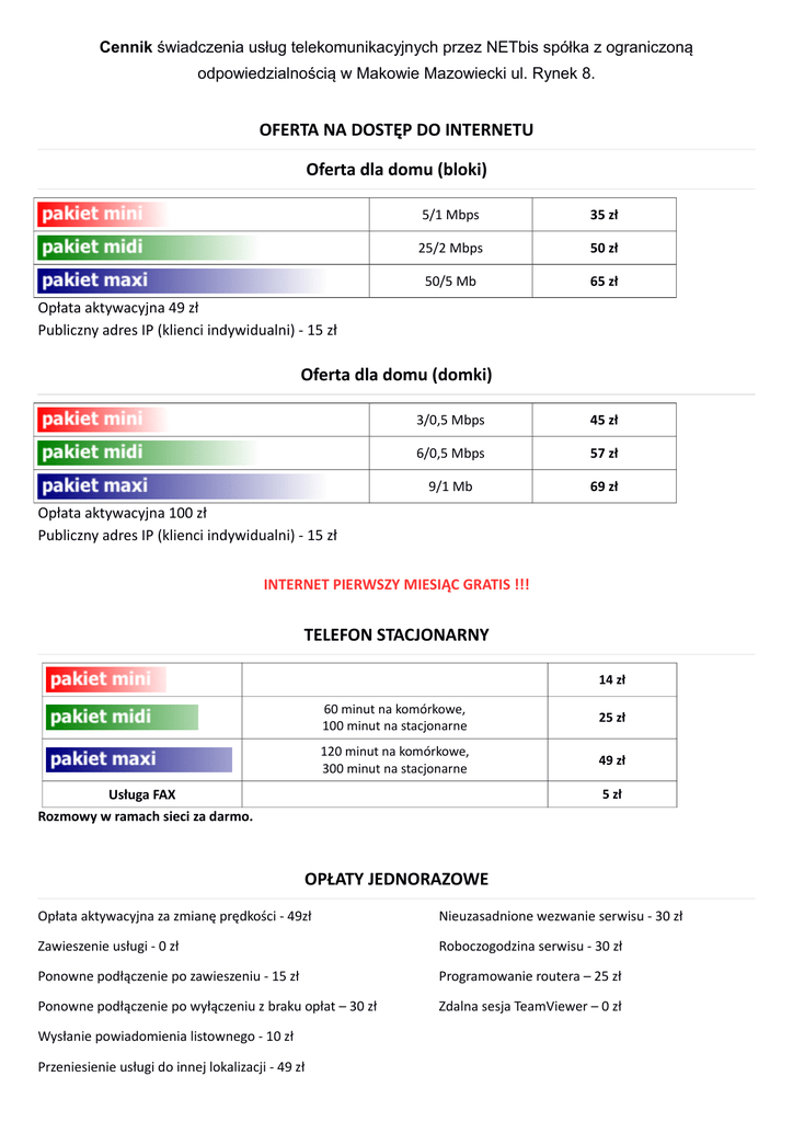 Cennik świadczenia usług telekomunikacyjnych przez NETbis spółka z ograniczoną odpowiedzialnością w Makowie Mazowiecki ul. Rynek 8. OFERTA NA DOSTĘP DO INTERNETU Oferta dla domu (bloki) 5/1 Mbps 35 zł 25/2 Mbps 50 zł 50/5 Mb 65 zł Opłata aktywacyjna 49 zł Publiczny adres IP (klienci indywidualni) - 15 zł Oferta dla domu (domki) 3/0,5 Mbps 45 zł 6/0,5 Mbps 57 zł 9/1 Mb 69 zł Opłata aktywacyjna 100 zł Publiczny adres IP (klienci indywidualni) - 15 zł INTERNET PIERWSZY MIESIĄC GRATIS !!! TELEFON STACJONARNY 14 zł 60 minut na komórkowe, 100 minut na stacjonarne 25 zł 120 minut na komórkowe, 300 minut na stacjonarne 49 zł Usługa FAX 5 zł Rozmowy w ramach sieci za darmo. OPŁATY JEDNORAZOWE Opłata aktywacyjna za zmianę prędkości - 49zł Nieuzasadnione wezwanie serwisu - 30 zł Zawieszenie usługi - 0 zł Roboczogodzina serwisu - 30 zł Ponowne podłączenie po zawieszeniu - 15 zł Programowanie routera – 25 zł Ponowne podłączenie po wyłączeniu z braku opłat – 30 zł Zdalna sesja TeamViewer – 0 zł Wysłanie powiadomienia listownego - 10 zł Przeniesienie usługi do innej lokalizacji - 49 zł
