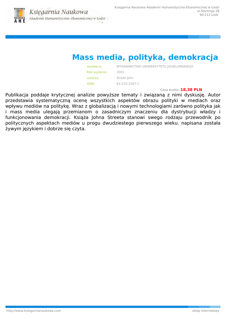 Księgarnia Naukowa Akademii Humanistyczno-Ekonomicznej w Łodzi ul.Sterlinga 26 90-212 Łódź Mass media, polityka, demokracja wydawca: WYDAWNICTWO UNIWERSYTETU JAGIELOŃSKIEGO Rok wydania: 2001 autorzy: Street John ISBN: 83-233-2167-1 Cena brutto: 18,38 PLN Publikacja poddaje krytycznej analizie powyższe tematy i związaną z nimi dyskusję. Autor przedstawia systematyczną ocenę wszystkich aspektów obrazu polityki w mediach oraz wpływu mediów na politykę. Wraz z globalizacją i nowymi technologiami zarówno polityka jak i mass media ulegają przemianom o zasadniczym znaczeniu dla dystrybucji władzy i funkcjonowania demokracji. Książa Johna Streeta stanowi swego rodzaju przewodnik po politycznych aspektach mediów u progu dwudziestego pierwszego wieku. napisana została żywym językiem i dobrze się czyta. http://www.ksiegarnianaukowa.com sklep internetowy