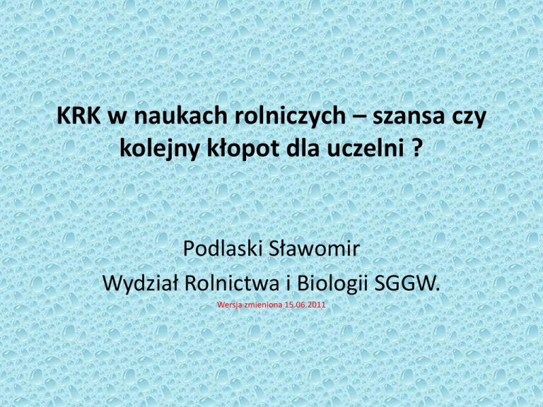 KRK w naukach rolniczych – szansa czy kolejny kłopot dla uczelni ? Podlaski Sławomir Wydział Rolnictwa i Biologii SGGW. Wersja zmieniona 15.06.2011 Wstęp KRK – uwagi ogólne • KRK – metoda opisu kształcenia wg jego efektów Przyczyny wprowadzenia ram kształcenia 1.Mobilnośd studentów i absolwentów 2.Koniecznośc porównania, oceny i właściwej kwalifikacji efektów kształcenia w na poziomie krajowym i międzynarodowym Mobilnośd studentów • 1.Liczba studentów w świecie wzrosła 5-krotnie od 1970 roku • 2.Liczba międzynarodowo mobilnych studentów wzrosła z 2mln w 2001 roku do 3,9 mln w 2009 roku i zwiększy się do 8 mln w 2025 roku. • 3.20% studentów mobilnych przyjmują USA, 14% UK, 8% Francja • 4.Polska na 14 miejscu – wyjeżdża ok. 50 tys. studentów, zagranicznych studentów ok.15 tys. 5.Będzie rosła liczba międzynarodowych studentów w małych uniwersytetach. Światowa mobilnośd studentów 47% międzynarodowych mobilnych studentów wybiera studia magisterskie, doktoranckie, prowadzenie badao. Lokalni studenci – 14%. Liczba międzynarodowych mobilnych studentów 100% to 23% Business and Administration 1% - Agriculture Standardy kształcenia a KRK 1.Standardy były wynikiem żywiołowego rozwoju szkolnictwa głównie prywatnego 2.119 standardów - 40% godzin narzuconych 60% fakultety, specyfika uczelni. Standardy nie w pełni się sprawdziły ale były konieczne 1.Ujednoliciły ofertę dydaktyczna 2.Oferowane były dla przeciętnego maturzysty 3.Utrudniały reagowanie na potrzeby rynku pracy, lokalnego, krajowego czy międzynarodowego. Prawo o szkolnictwie wyższym możliwości • Jednostki mające prawo do habilitowania prawo do tworzenia nowych kierunków studiów • Wzorcowe opisy efektów kształcenia. Ocenie PKA podlega projekt procesu kształcenia. • Najlepsze kierunki –wyróżnione • Nowe kierunki-nie obowiązek a przywilej • Ważny efekt nie proces kształcenia • Studia – student centered vs teacher centered Skład zespołu ds. opracowania opisu efektów kształcenia dla obszaru studiów rolniczych, leśnych i weterynaryjnych 1.Prof. dr hab. Sławomir Podlaski – przewodniczacy. Szkoła Główna Gospodarstwa Wiejskiego, Katedra Fizjologii Roślin. 2.Dr hab. Anna Chełmońska- Soyta – Uniwersytet Przyrodniczy we Wrocławiu, Wydział Medycyny Weterynaryjnej 3. Prof. dr hab. inż. Tomasz Jankowski – Uniwersytet Przyrodniczy w Poznaniu, Katedra Biotechnologii i Mikrobiologii Żywności, 4.Prof. dr hab. Andrzej Radecki – Szkoła Główna Gospodarstwa Wiejskiego, Katedra Agronomii, 5 .Prof. dr hab. Bogdan J. Wosiewicz – Przewodniczący Zespołu Kierunków Studiów Rolniczych, Leśnych i Weterynaryjnych PKA, e –mail : 6. Prof. dr hab. Marek Frankowicz - Centrum Badań nad Szkolnictwem Wyższym, Uniwersytet Jagielloński. Ekspert Boloński 1.Ogólna charakterystyka kształcenia w obszarze nauk rolniczych. Kierunki studiów w kompetencji Zespołu. Przewodniczący PKA.10.07.2008 1.Architektura Krajobrazu 2.Biotechnologia- studia ,absolwenci których uzyskują tytuł inżyniera lub magistra inżyniera 3.Leśnictwo 4.Ochrona środowiska – studia, absolwenci których, uzyskują tytuł inżyniera lub magistra inżyniera 5.Ogrodnictwo 6.Rolnictwo 7.Rybactwo 8.Technika rolnicza i leśna 9.Technologia drewna 10.Technologia żywności i żywienie człowieka 11.Weterynaria+ 12.Zootechnika (+Weterynaria kształci w zakresie tzw. zawodów regulowanych tj. objętych Dyrektywą Komisji Europejskiej „ O wzajemnym uznawaniu dyplomów.” (Directive 2005/36/EC) Kształcenie to jest zharmonizowane na poziomie europejskim a uznawanie dyplomów jest automatyczne Profile studiów • I stopieo – profil ogólno akademicki i praktyczny • II stopieo- profil ogólno akademicki, praktyczny, Nie zajmowano się III stopniem (studiami doktoranckimi) Różnica programowa pomiędzy profilami !!!! a nie tylko dodanie do profilu ogólnego zagadnieo praktycznych czy naukowych. Pomiędzy I ,II i III stopniem – przyrost kompetencji. Mobilnośd pionowa?. Wiedza na wyższym stopniu –bardziej wąska i specjalistyczna Budowanie programów studiów i zajęd dydaktycznych w oparciu o efekty kształcenia Rok 2012 Wydziały, które mają prawo do habilitowania możliwośd samodzielnego opracowania programu studiów i zajęd dydaktycznych. Warunki zewnętrzne Rosnąca konkurencja o pieniądze na badania i dydaktykę Zmniejszająca się liczba kandydatów na studia Rosnące bezrobocie absolwentów Niezadowolenie pracodawców Perspektywy !!?? W stosunku do 2005 roku: Zachowując ten sam wskaźnik scholaryzacji liczba studentów w 2020 roku ulegnie zmniejszeniu o 600-800 tys., czyli zmniejszy się w 2015 o 23%, 2020 o 35% i 2025 o 45%. Utrzymanie tej samej relacji liczby studentów/nauczycieli (18,2 ) oznacza koniecznośd redukcji liczby nauczycieli akademickich o 23-26%. (Ernst&Young) Liczba studentów na różnych typach uczelni(1) Kierunki Typy uczelni studiów Lata Uniwersytety PWSZ St. N.st St. N.st Rybactwo 2006 829 79 2007 671 46 2008 491 23 2009 420 11 TRiL 2006 4679 3109 2007 4017 2496 2008 3545 1929 2009 2341 1260 Rolnictwo2006 7937 5396 1370 666 2007 7294 4979 1335 630 2008 6624 4275 1279 581 2009 5783 3509 1048 468 Razem N.publ. St. N.st 190 245 125 111 51 21 65 0 926 894 775 696 St. 829 671 491 420 4679 4017 3545 2341 9497 8874 8028 6942 N.st. 79 46 23 11 3160 2517 1994 1260 6988 6503 5631 4673 Całkowita liczba studentów w 2006-09 zmniejszyła się o 52,5-54,1% dla Rybactwa i TRiL oraz o 41,7% dla Rolnictwa Liczba studentów na różnych typach uczelni(2) Kierunki studiów Lata Ogrodnictwo 2006 2007 2008 2009 Technologia 2006 drewna 2007 2008 2009 Zootechnika 2006 2007 2008 2009 Typy uczelni Uniwersytety PWSZ St. N.st St. N.st 4402 1899 409 228 4450 1820 363 281 4270 1673 318 289 4075 1405 262 285 1226 826 1159 788 1047 720 1041 668 6222 2779 6008 2508 5636 2459 5405 2176 Razem N.publ. St. N.st 101 775 49 794 19 699 1 607 St. 4912 4862 460
