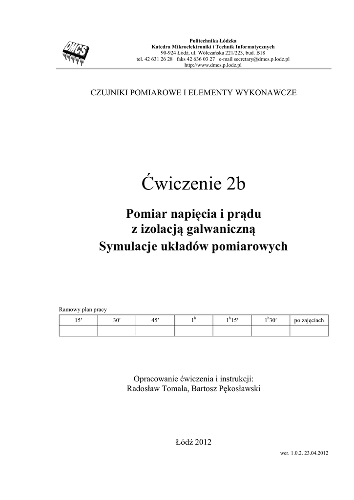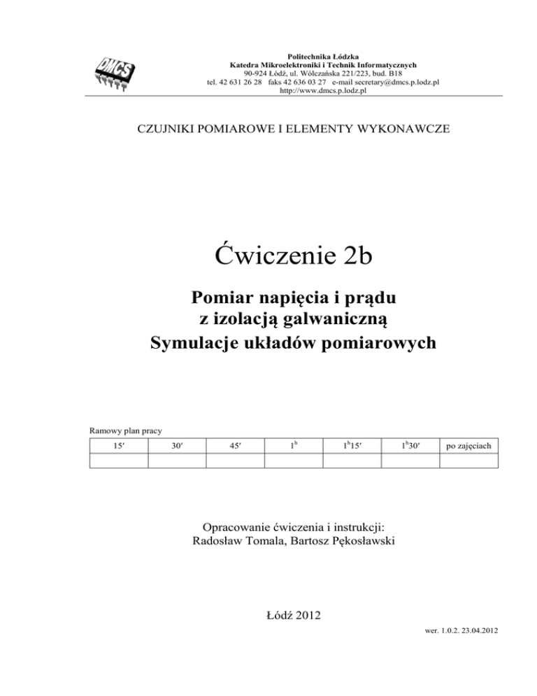Politechnika Łódzka Katedra Mikroelektroniki i Technik Informatycznych 90-924 Łódź, ul. Wólczańska 221/223, bud. B18 tel. 42 631 26 28 faks 42 636 03 27 e-mail [email protected] http://www.dmcs.p.lodz.pl CZUJNIKI POMIAROWE I ELEMENTY WYKONAWCZE Ćwiczenie 2b Pomiar napięcia i prądu z izolacją galwaniczną Symulacje układów pomiarowych Ramowy plan pracy 15′ 30′ 45′ 1h 1h15′ 1h30′ po zajęciach Opracowanie ćwiczenia i instrukcji: Radosław Tomala, Bartosz Pękosławski Łódź 2012 wer. 1.0.2. 23.04.2012 Spis treści B Wprowadzenie do ćwiczenia..............................................................................................................5 1. Cel i przebieg ćwiczenia....................................................................................................................5 2. Podstawy teoretyczne ........................................................................................................................6 2.1. Wprowadzenie .........................................................................................................................6 C Doświadczenie.....................................................................................................................................7 3. Symulacje ..........................................................................................................................................7 3.1. Wykonanie symulacji ..............................................................................................................7 D Wyniki .................................................................................................................................................9 4. Opracowanie i analiza wyników........................................................................................................9 E Informacje.........................................................................................................................................11 5. Literatura .........................................................................................................................................11 © 2012 Katedra Mikroelektroniki i Technik Informatycznych Politechniki Łódzkiej B Wprowadzenie do ćwiczenia 1. Cel i przebieg ćwiczenia Celem ćwiczenia jest poznanie zasady działania układów do pomiaru napięcia i prądu z transoptorową izolacją galwaniczną. Ćwiczenie polega na zamodelowaniu w programie PSpice oraz zbadanie charakterystyk statycznych oraz przeprowadzenie analiz czasowych kolejno: prostego układu do pomiaru napięcia, układu do pomiaru napięcia ze sprzężeniem zwrotnym, układu do pomiaru prądu. W ćwiczeniu poruszone zostanie również zagadnienie doboru wzmocnienia transoptora. © 2012 Katedra Mikroelektroniki i Technik Informatycznych Politechniki Łódzkiej 2. Podstawy teoretyczne 2.1. Wprowadzenie Teoria dotycząca układów pomiarowych z izolacją galwaniczną i transoptorów znajduje się we wprowadzeniu do ćwiczenia 2a. Rys. 1 przedstawia transoptorowy układ do pomiaru prądu. W układzie tym czujnikiem mierzonego prądu jest bocznik R. Wartości prądów I1 i I2 płynących przez diody transoptorów T1 i T2, zależą od spadku napięcia na boczniku R. Prądy te płyną pod wpływem dodatkowego źródła prądu I. Jeśli mierzony prąd IWE jest zerowy to prądy I1 oraz I2 są jednakowe i wymuszają przepływ równych co do wartości prądów IT1 oraz IT2. Prąd wyjściowy IWY będący różnicą prądów IT1 oraz IT2 jest wówczas także równy zeru. Gdy prąd mierzony jest różny od zera, to prądy I1 i I2 są różne i płynie niezerowy prąd wyjściowy IWY. Na rezystorze R3 pojawia się wówczas spadek napięcia proporcjonalny do spadku napięcia na boczniku R. IT1 I1 I2 IT2 Rys. 1. Schemat transoptorowego układu do pomiaru prądu © 2012 Katedra Mikroelektroniki i Technik Informatycznych Politechniki Łódzkiej C Doświadczenie 3. Symulacje 3.1. Wykonanie symulacji 1. Narysować poniższy schemat w programie PSpice (użyć transoptora A4N25, podłączyć wyprowadzenie bazy do masy, napięcie zasilania 20V) : 2. Przeprowadzić analizę DC Sweep dla napięcia wejściowego układu od zera do 10 V, w celu uzyskania charakterystyki statycznej UWY(UWE). 3. Przeprowadzić analizę AC Sweep w celu uzyskania charakterystyki częstotliwościowej UWY(f). 4. Wyznaczyć częstotliwość graniczną układu. © Katedra Mikroelektroniki i Technik Informatycznych Politechniki Łódzkiej 5. Narysować poniższy schemat w programie PSpice (użyć transoptorów A4N25, wzmacniacza operacyjnego TL072, podłączyć wyprowadzenie baz transoptorów do emiterów poprzez rezystory 1MΩ, napięcie zasilania 20V) : 6. Przeprowadzić analizę DC Sweep dla napięcia wejściowego układu od zera do 10 V, w celu uzyskania charakterystyki statycznej UWY(UWE). 7. Przeprowadzić analizę Transient w celu uzyskania odpowiedzi układu na wymuszenie sinusoidalne o amplitudzie 2V i składowej stałej 5V. 8. Narysować w programie PSpice układ z Rys. 1 (bazy transoptorów podłączyć do emiterów). 9. Przeprowadzić analizę DC Sweep dla prądu wejściowego układu od -10A do 10 A, w celu uzyskania charakterystyki statycznej IWY(IWE). 10. Narysować poniższy schemat w programie PSpice (użyć transoptora A4N25, podłączyć wyprowadzenie bazy do masy, napięcie zasilania 20V) : 11. Wyznaczyć wzmocnienie CTR = ICE/IF transoptora w układzie przy napięciu wejściowym 10 V. 12. Zmodyfikować parametry modelu transoptora tak, aby otrzymać CTR = 30%. © Katedra Mikroelektroniki i Technik Informatycznych Politechniki Łódzkiej D Wyniki 4. Opracowanie i analiza wyników 1. Porównać liniowość charakterystyk dla układu do pomiaru napięcia z jednym transoptorem i układu z dwoma transoptorami (ze sprzężeniem zwrotnym). 2. Określić pasmo pomiarowe dla układu do pomiaru prądu z jednym transoptorem. 3. Na podstawie uzyskanej charakterystyki statycznej dla 