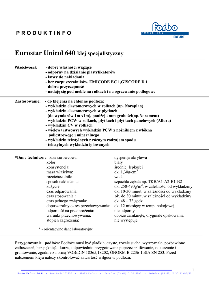 PRODUKTINFO Eurostar Unicol 640 klej specjalistyczny - dobre własności wiążące - odporny na działanie plastyfikatorów - łatwy do nakładania - bez rozpuszczalników, EMICODE EC 1,GISCODE D 1 - dobra przyczepność - nadaję się pod meble na rolkach i na ogrzewanie podłogowe Właściwości: Zastosowanie: - do klejenia na chłonne podłoża: - wykładzin elastomerowych w rolkach (np. Noraplan) - wykładzin elastomerowych w płytkach (do wymiarów 1m x1m), poniżej 4mm grubości(np.Norament) - wykładzin PCW w rolkach, płytkach i płytkach panelowych (Allura) - wykładzin CV w rolkach - wielowarstwowych wykładzin PCW z nośnikiem z włókna poliestrowego i mineralnego - wykładzin tekstylnych z różnym rodzajem spodu - tekstylnych wykładzin igłowanych *Dane techniczne: baza surowcowa: kolor: konsystencja: masa właściwa: rozcieńczalnik: sposób nakładania: zużycie: czas odparowania: czas stosowania : czas pełnego związania: dopuszczalny okres przechowywania: odporność na przemrożenia: warunki przechowywania: stopień zagrożenia: dyspersja akrylowa biały średniej lepkości ok. 1,30g/cm3 woda szpachla zębata np. TKB/A1-A2-B1-B2 ok. 250-490g/m2, w zależności od wykładziny ok. 10-30 minut, w zależności od wykładziny ok. do 30 minut, w zależności od wykładziny ok. 48 – 72 godz. ok. 12 miesięcy w temp. pokojowej nie odporny dobrze zamknięte, oryginale opakowania nie występuje * - orientacyjne dane laboratoryjne Przygotowanie podłoża: Podłoże musi być gładkie, czyste, trwale suche, wytrzymałe, pozbawione zatłuszczeń, bez pęknięć i kurzu, odpowiednio przygotowane poprzez szlifowanie, odkurzanie i gruntowanie, zgodnie z normą VOB/DIN 18365,18202, ÖNORM B 2236-1,SIA SN 253. Przed nałożeniem kleju należy skontrolować zawartość wilgoci w podłożu. ——————————————————————————————————————— Forbo Erfurt GmbH • Postfach 101355 • 99013 Erfurt • Telefon (03 61) 7 30 41-0 • Telefax (03 61) 7 30 41-90/91 1 PRODUKTINFO W przypadku lanego asfaltu lub innych nie chłonnych podłoży, jak również wrażliwych na wilgoć podłoży anhydrytowych wymagane jest użycie samopoziomującej masy szpachlowej Forbo 960 (1,5-2mm grubości), przed montażem wykładzin kauczukowych ok. 3mm. Przy układaniu wykładzin na ogrzewanych podłogach należy oznaczyć wilgotność podłoża i sporządzić protokół z wyłączenia systemu grzewczego. Sposób użycia: Przed użyciem dobrze wymieszać! Wykładziny elastomerowe(szpachla TKB,A2) i linoleum(szpachla TKB,B1) należy układać w jeszcze wilgotny klej, po ok. 10-15 minutach odparowania. Dokładny czas odparowania jest trudny dokładnie do określenia, gdyż jest uzależniony od temperatury, wilgotności względnej powietrza i chłonności podłoża. W danych warunkach należy dotykowo sprawdzić lepkość kleju. Wykładziny PCW i panelowe plytki PCW(np. Allura, TKB,A2) montować w przewidzianym czasie użycia ok.30 min., natychmiast dokładnie docisnąć za pomocą odpowiedniego walca. Po następnych ok.10-15 minutach należy wykładzinę powtórnie dokładnie docisnąć odpowiednim walcem. W przypadku wykładzin CV można też zastosować szpachlę A1(TKB) – jeżeli mamy do czynienia z równym podłożem; w ten sposób skracamy czas odparowania kleju. Wykładziny tekstylne i z włókniny igłowanej(TKB,B1-B2) montować w przewidzianym czasie użycia ok.30 min., natychmiast dokładnie docisnąć za pomocą odpowiedniego walca. Podczas odparowywania i wiązania kleju unikać bezpośredniego nasłonecznienia oraz innych źródeł ciepła jak również dynamicznego, punktowego obciążenia. Przy układaniu wykładziny należy zapewnić pełne pokrycie jej spodu używanym klejem! Uwagi: Wykładziny przed ułożeniem należy aklimatyzować w przeznaczonym do klejenia pomieszczeniu. Wykładziny musze ułożone luźno i równo na podłożu. Do spawania można przystąpić po ok. 2-3 dniach. Optymalne warunki klejenia wykładzin: Temperatura powietrza , podłoża, kleju i wykładziny min. 15-180C wilgotność względna powietrza 40-75%, zalecana < 65% Opakowanie: jednorazowe wiaderko, 13kg netto, paleta 44 szt. ——————————————————————————————————————— Forbo Erfurt GmbH • Postfach 101355 • 99013 Erfurt • Telefon (03 61) 7 30 41-0 • Telefax (03 61) 7 30 41-90/91 2 PRODUKTINFO Informacje dodatkowe: Nasze informacje oparte są na doświadczeniach laboratoryjnych i praktycznych. Producent gwarantuje jakość produktu, jednak ze względu na różnorodność materiałów, sposobów użycia i warunków otoczenia, na które nie mamy żadnego wpływu, nie ponosimy odpowiedzialności w przypadku stosowania lub przechowywania produktu niezgodnie z niniejszą instrukcją. Zalecamy przeprowadzenie prób we własnym zakresie. Należy przestrzegać zasad i reguł fachu. Zakładamy znajomość oraz stosowanie przez wykonawców obowiązujących w danym kraju przepisów i norm. Należy posiadać aktualne karty techniczne .Proszę zapoznać się z naszymi Ogólnymi Warunkami Handlowymi. Wraz z ukazaniem się niniejszej instrukcji technicznej tracą ważność wszystkie wcześniej opublikowane. Stan, Wrzesień 2006 r. ——————————————————————————————————————— Forbo Erfurt GmbH • Postfach 101355 • 99013 Erfurt • Telefon (03 61) 7 30 41-0 • Telefax (03 61) 7 30 41-90/91 3