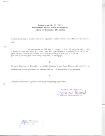 Zarz,!dzenie Nr 23/2015 Burmistrza Miasta Rawa Mazowiecka z dnia 15 kwietnia 2015 roku w sprawie zmiany w planie dochod6w i wydatk6w budietu Miasta Rawa Mazowiecka na 2015 rok. Na podstawie art.257 pkt 1 ustawy z dnia 27 sierpnia a finansach publicznych (Dz. U. z 2013 r. paz. 885 z p6iniejszymi zmianami) oraz pkt 4 ustawy z dnia 8 marca 1990 roku a samorzqdzie gminnym (Dz. U. z 2013 r. paz .594 z p6iniejszymi zmianami) zarzqdzam, co nast~puje; W planie finansowym dochod6w dokonuje si~ zmian okreslonych i wydatk6w w zalqcznikach budietu Miasta Rawa Mazowiecka nr 1 i 2 do niniejszego na 2015 zarzqdzenia. BURMISTRZ ~U&2~~~ 2009 roku art.30 ust.2 MIASTA mgr inz. Danusz Mu;ztal ' ~ · 11 z ~.ar sinski I, . CA PR/IWNY tD - M - 89LJ rok Dzial Rozdzial Nazwa § Kwota Kwota zmniejszenia zwi~kszenia Pomoc Spoleczna 6690 6014 2010 Dodatki mieszkaniowe (energetyczne 1 Dotacje Celowe 85219 Osrodki pomocy spolecznej 676 2010 Dotacje Celowe 676 852 85215 6014 OGOtEM 6690 BURMISTRZ MIASTA !UJzf~ mgr inz. Danusz Misztal ~<9dC~O? Dzial Rozdzial Kwota Kwota zmniejszenia zwi~kszenia Nazwa § Pomoc spoleczna 852 85215 Dodatki mieszkaniowe Wydatki Jednostek Z § 2010 Wynagrodzenia Swiadczenia 85219 6690 (energetyczne) Budzetowych 6014 6014 w tym; 120 i skladki ad nich naliczane na rzecz os6b fizycznych 5894 Osrodki pomocy spolecznej 676 Wydatki Jednostek Budzetowych w tym; Z § 2010 Swiadczenia na rzecz os6b fizycznych 676 660 16 Wydatki zwiqzane z realizacja zadan statutowych 6690 OGOtEM BUR~ISTRZ ~(LtS2 M}AS1AfJ kA.s1.JuX mgr inz. Dariusz Misztal