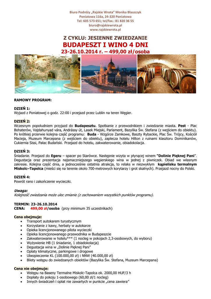 Biuro Podróży „Rajskie Wrota” Monika Błaszczyk Poniatowa 116a, 24-320 Poniatowa Tel: 605 573 651; tel/fax.: 81 820 36 55 [email protected] www.rajskiewrota.pl Z CYKLU: JESIENNE ZWIEDZANIE BUDAPESZT I WINO 4 DNI 23-26.10.2014 r. – 499,00 zł/osoba RAMOWY PROGRAM: DZIEŃ 1: Wyjazd z Poniatowej o godz. 22:00 i przejazd przez Lublin na teren Węgier. DZIEŃ 2: Wczesnym popołudniem przyjazd do Budapesztu. Spotkanie z przewodnikiem i zwiedzanie miasta. Pest - Plac Bohaterów, Vajdahunyad vára, Andrássy út, Lasek Miejski, Parlament, Bazylika Św. Stefana (z wejściem do obiektu). Po krótkiej przerwie kolejna część programu: Buda - Wzgórze Zamkowe, Baszty Rybackie, Plac Św. Trójcy, Kościół Macieja, Muzeum Marcepana (z wejściem do obiektu), zaplecza hotelu Hilton z ruinami klasztoru Dominikanów, Cukiernia Sissi, Pałac Budański. Przejazd do hotelu, zakwaterowanie, obiadokolacja. DZIEŃ 3: Śniadanie. Przejazd do Egeru – spacer po Starówce. Następnie wizyta w płynącej winem "Dolinie Pięknej Pani”. Degustacja oraz prezentacja najsmaczniejszego węgierskiego wina w jednej z piwniczek. Obiad we własnym zakresie. Kolejna część dnia, a jednocześnie ostatnia atrakcja, to relaks w niezwykłym kąpielisku termalnym Miskolc–Tapolca (mieści się na terenie około 700-metrowych korytarzy i grot skalnych). Przejazd nocny do Polski. DZIEŃ 4: Powrót rano i zakończenie wycieczki. Uwaga: Kolejność zwiedzania może ulec zmianie (z zachowaniem wszystkich punktów programu). TERMIN: 23-26.10.2014 CENA: 499,00 zł/osoba (przy minimum 35 uczestnikach) Cena obejmuje: Transport autokarem turystycznym Korzystanie z kawy, herbaty w autokarze Opieka licencjonowanego pilota wycieczki Opieka licencjonowanego przewodnika w Budapeszcie Zakwaterowanie w hotelu*** (1 nocleg w pokojach 2,3-osobowych, do wyboru) Wyżywienie HB (1 śniadanie, 1 obiadokolacja) Degustacja wina w „Dolinie Pięknej Pani” Opłaty klimatyczne, parkingowe i drogowe Ubezpieczenie KL (100.000,00 zł) i NNW (40.000,00 zł) Bilety wstępu do zwiedzanych obiektów (Bazylika Św. Stefana, Muzeum Marcepana) Cena nie obejmuje: Wstępu na Baseny Termalne Miskolc-Tapolca ok. 2000,00 HUF/3 h Dopłaty do pokoju 1-osobowego (60,00 zł/1 nocleg) Innych świadczeń i opłat nie zawartych w punkcie „cena zawiera”
