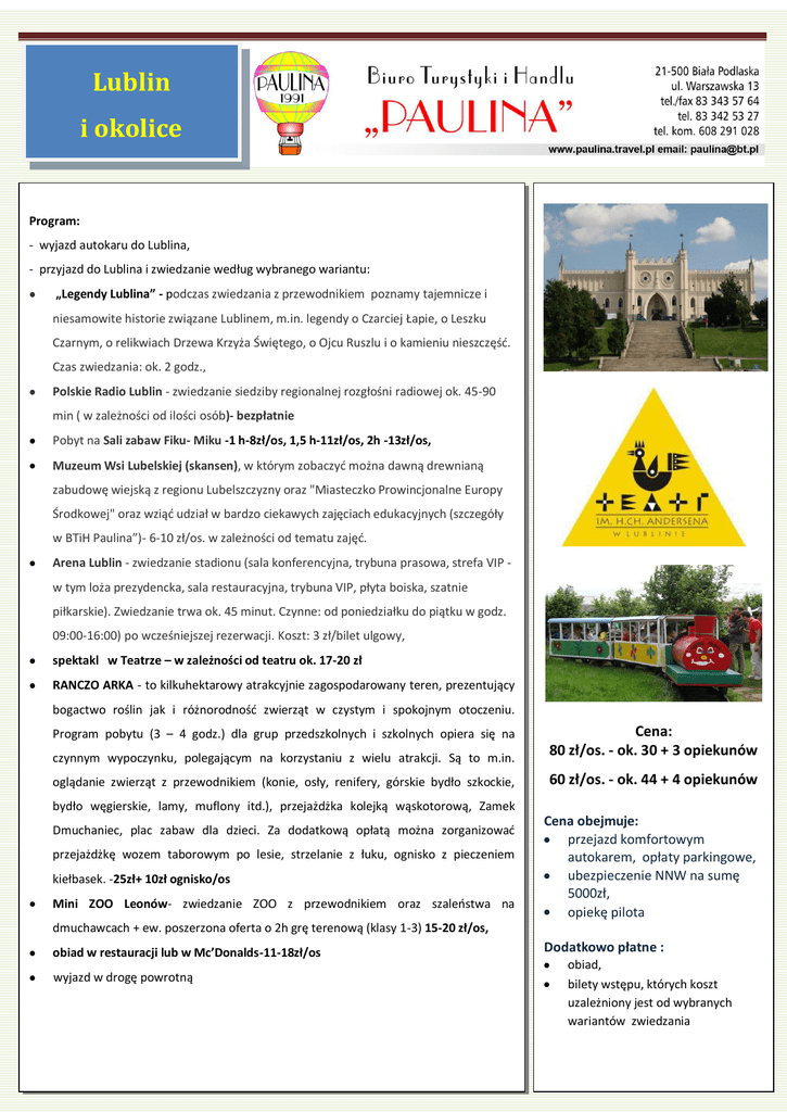 WYCIECZKA DOLublin PARYŻA i okolice 6 dni Program: - wyjazd autokaru do Lublina, - przyjazd do Lublina i zwiedzanie według wybranego wariantu: „Legendy Lublina” - podczas zwiedzania z przewodnikiem poznamy tajemnicze i niesamowite historie związane Lublinem, m.in. legendy o Czarciej Łapie, o Leszku Czarnym, o relikwiach Drzewa Krzyża Świętego, o Ojcu Ruszlu i o kamieniu nieszczęść. Czas zwiedzania: ok. 2 godz., Polskie Radio Lublin - zwiedzanie siedziby regionalnej rozgłośni radiowej ok. 45-90 min ( w zależności od ilości osób)- bezpłatnie Pobyt na Sali zabaw Fiku- Miku -1 h-8zł/os, 1,5 h-11zł/os, 2h -13zł/os, Muzeum Wsi Lubelskiej (skansen), w którym zobaczyć można dawną drewnianą zabudowę wiejską z regionu Lubelszczyzny oraz "Miasteczko Prowincjonalne Europy Środkowej" oraz wziąć udział w bardzo ciekawych zajęciach edukacyjnych (szczegóły w BTiH Paulina”)- 6-10 zł/os. w zależności od tematu zajęć. Arena Lublin - zwiedzanie stadionu (sala konferencyjna, trybuna prasowa, strefa VIP w tym loża prezydencka, sala restauracyjna, trybuna VIP, płyta boiska, szatnie piłkarskie). Zwiedzanie trwa ok. 45 minut. Czynne: od poniedziałku do piątku w godz. 09:00-16:00) po wcześniejszej rezerwacji. Koszt: 3 zł/bilet ulgowy, spektakl w Teatrze – w zależności od teatru ok. 17-20 zł RANCZO ARKA - to kilkuhektarowy atrakcyjnie zagospodarowany teren, prezentujący bogactwo roślin jak i różnorodność zwierząt w czystym i spokojnym otoczeniu. czynnym wypoczynku, polegającym na korzystaniu z wielu atrakcji. Są to m.in. Cena: 80 zł/os. - ok. 30 + 3 opiekunów oglądanie zwierząt z przewodnikiem (konie, osły, renifery, górskie bydło szkockie, 60 zł/os. - ok. 44 + 4 opiekunów Program pobytu (3 – 4 godz.) dla grup przedszkolnych i szkolnych opiera się na bydło węgierskie, lamy, muflony itd.), przejażdżka kolejką wąskotorową, Zamek Dmuchaniec, plac zabaw dla dzieci. Za dodatkową opłatą można zorganizować przejażdżkę wozem taborowym po lesie, strzelanie z łuku, ognisko z pieczeniem kiełbasek. -25zł+ 10zł ognisko/os Mini ZOO Leonów- zwiedzanie ZOO z przewodnikiem oraz szaleństwa na Cena obejmuje: przejazd komfortowym autokarem, opłaty parkingowe, ubezpieczenie NNW na sumę 5000zł, opiekę pilota dmuchawcach + ew. poszerzona oferta o 2h grę terenową (klasy 1-3) 15-20 zł/os, obiad w restauracji lub w Mc’Donalds-11-18zł/os wyjazd w drogę powrotną Dodatkowo płatne : obiad, bilety wstępu, których koszt uzależniony jest od wybranych wariantów zwiedzania