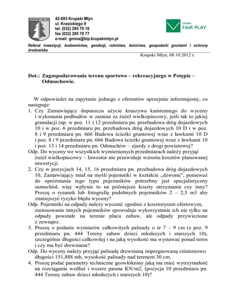 42-693 Krupski Młyn ul. Krasickiego 9 tel. (032) 285 70 16 fax (032) 285 70 77 e-mail: [email protected] Referat inwestycji, budownictwa, geodezji, rolnictwa, leśnictwa, gospodarki gruntami i ochrony środowiska Krupski Młyn, 08.10.2012 r. Dot.: Zagospodarowanie terenu sportowo – rekreacyjnego w Potępie – Odmuchowie. W odpowiedzi na zapytanie jednego z oferentów uprzejmie informujemy, co następuje: 1. Czy Zamawiający dopuszcza użycie kruszywa kamiennego do wyceny i wykonania podbudów w zamian za żużel wielkopiecowy, jeśli tak to jakiej granulacji (np. w poz. 11 i 12 przedmiaru pn. przebudowa dróg dojazdowych 10 i w poz. 6 przedmiaru pn. przebudowa dróg dojazdowych 10 D i w poz. 8 i 9 przedmiaru pn. 666 Budowa ścieżki gruntowej wraz z ławkami 10 D i poz. 8 i 9 przedmiaru pn. 666 Budowa ścieżki gruntowej wraz z ławkami 10 i poz. 13 i 14 przedmiaru pn. Odmuchów – zjazdy z drogi powiatowej? Odp. Do wyceny we wszystkich wymienionych przedmiarach należy przyjąć żużel wielkopiecowy – Inwestor nie przewiduje wzrostu kosztów planowanej inwestycji. 2. Czy w pozycjach 14, 15, 16 przedmiaru pn. przebudowa dróg dojazdowych 10, Zamawiający miał na myśli pojemniki w kształcie „dzwonu”, ponieważ do opróżniania tego typu pojemników potrzebny jest specjalistyczny samochód, więc wpłynie to na późniejsze koszty utrzymania czy inny? Proszę o rysunek lub fotografię podobnych pojemników 2 – 2,5 m3 aby zmniejszyć ryzyko błędu wyceny? Odp. Pojemniki na odpady należy wycenić zgodnie z kosztorysem ofertowym, zastosowanie innych pojemników spowoduje wykorzystanie ich nie tylko na odpady powstałe na terenie placu zabaw, ale odpady przywiezione z zewnątrz. 3. Proszę o podanie wymiarów całkowitych palisady o śr 7 – 9 cm (z poz. 9 przedmiaru pn. 444 Tereny zabaw dzieci młodszych i starszych 10), szczególnie długości całkowitej i na jaką wysokość ma wystawać ponad teren i czy ma być drewniana? Odp. Do wyceny należy przyjąć palisadę drewnianą impregnowaną ciśnieniowo długości 151,888 mb, wysokość palisady nad terenem 30 cm. 4. Proszę podać parametry techniczne geowłókniny jaką ma mieć wytrzymałość na rozciąganie wzdłuż i wszerz pasma KN/m2, (pozycja 10 przedmiaru pn. 444 Tereny zabaw dzieci młodszych i starszych 10)? Odp. Do wyceny należy przyjąć geowłókninę o parametrach: wodoprzepuszczalność w kierunku prostopadłym do płaszczyzn wyrobu 100 l/m2/s, wytrzymałość na rozciąganie 13,5 – 15 kN/m, odporność na przebicie min 1500 N, wydłużenie przy max obciążeniu min 40%, wodoprzepuszczalność w płaszczyźnie wyrobu 4,4. 5. Jakiego koloru przyjąć do wyceny płyty o nawierzchni bezpiecznej 500 x 500 x 100 mm, pozycja 16 przedmiaru pn. 444 Tereny zabaw dzieci młodszych i starszych? Odp. Do wyceny poz. 16 przedmiaru należy przyjąć wykładzinę koloru bordowego. 6. W projekcie w pkt. 1.4. Opis zagospodarowania ternu jest mowa o dwóch ubikacjach TOY TOY, czy przedmiot zamówienia obejmuje zakup ubikacji? Odp. Jako pozycję dodatkową – norma indywidualna należy wycenić dostawę kabin WC szt. 2 wykonanie wykopów KNR 2 – 31 0101 – 05 m2 – 12 wykonanie podsypki KNR 2 – 31 0116 – 01 m2 – 12 montaż obrzeży KNR 2 – 31 0407 – 03 mb – 20 montaż kostki betonowej KNR 2 – 31 0511 – 02 m2 – 12. 7. Proszę o wyjaśnienie czy w pozycji 27 przedmiaru pn. 444 Tereny zabaw dzieci młodszych i starszych 10 wycenić 20 szt. krzewów żywopłotowych z bukszpanu tj. w opisie projektowym czy inne krzewy lub drzewa, proszę o szczegółowe dane potrzebne do wyceny? Odp. Do wyceny należy przyjąć krzewy z bukszpanu o wysokości min 50 cm. 8. Proszę o podanie długości ławek (8 szt.) jakie należy przyjąć do wyceny w pozycji 10 przedmiaru pn. 666 Budowa ścieżki gruntowej wraz z ławkami 10, prosimy o rys. wzorcowy lub zdjęcie? Odp. Do wyceny należy przyjąć ławki np. firmy NOVUM Nr katalogowy 0805 lub równoważny. 9. Jakiej wielkości i generacji znaki D18 przyjąć do wyceny w pozycji 24 przedmiaru pn. 666 Budowa ścieżki gruntowej wraz z ławkami 10? Odp. Do wyceny należy przyjąć znaki drogowe D 18 zgodnie z Kodeksem Drogowym – wykonanie z tworzywa. 10. Proszę o podanie jaką grubość płyt styropianowych do izolacji cieplnych i przeciwdźwiękowych przyjąć do wyceny w pozycji 5 przedmiaru pn. 888 Remont budynku klubowego 10D i w poz. 17 przedmiaru pn. 888 Remont budynku klubowego 10? Odp. Do wyceny pozycja 5 należy przyjąć styropian gr. 5 cm – podłoga, do wyceny pozycja 17 należy przyjąć styropian gr. 8 cm – fasada. 11. Czy są jakieś wymagania dotyczące piasku pod pole piaskowe na terenie placu zabaw, tzn. czy musi posiadać atest sanepidu pozycja 11 przedmiaru pn. 444 Tereny zabaw dzieci młodszych i starszych 10? Odp. Do wyceny należy przyjąć piasek kopany pozbawiony zanieczyszczeń ziemią, odpadami organicznymi, piasek musi posiadać atest higieniczny. 12. Jakie wymiary stóp fundamentowych prefabrykowanych przyjąć do wyceny pod urządzenia placu zabaw w pozycjach 17 – 26 przedmiaru pn. 444 Tereny zabaw dzieci młodszych i starszych 10? Odp. Do wyceny pozycja 17 – 26 należy przyjąć wymiary fundamentów zgodnie z wytycznymi dostawców urządzeń sportowych. 13. Czy uwzględnić przy wycenie zieleni tj. drzew i krzewów, trawników – pielęgnację, ile lat? Odp. Pielęgnacja trawników do chwili ukorzenienia się, pielęgnacja zieleni do momentu odbioru zadania przez Zamawiającego.
