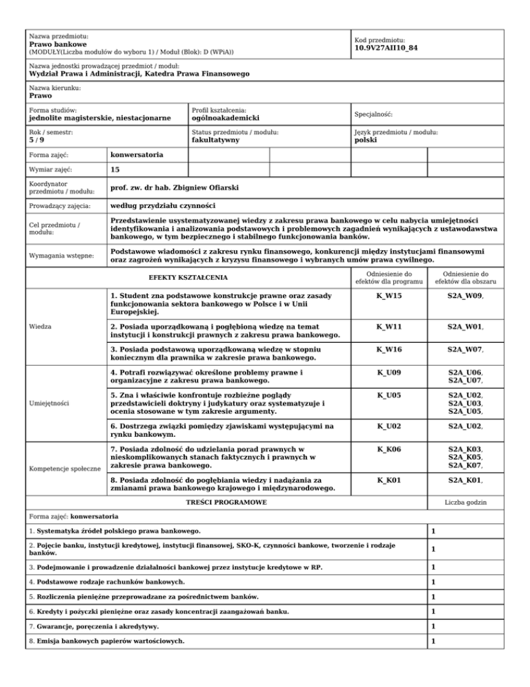 Nazwa przedmiotu: Kod przedmiotu: Prawo bankowe (MODUŁY(Liczba modułów do wyboru 1) / Moduł (Blok): D (WPiA)) 10.9V27AII10_84 Nazwa jednostki prowadzącej przedmiot / moduł: Wydział Prawa i Administracji, Katedra Prawa Finansowego Nazwa kierunku: Prawo Forma studiów: Profil kształcenia: jednolite magisterskie, niestacjonarne ogólnoakademicki Rok / semestr: 5/9 Status przedmiotu / modułu: Język przedmiotu / modułu: fakultatywny polski Specjalność: Forma zajęć: konwersatoria Wymiar zajęć: 15 Koordynator przedmiotu / modułu: prof. zw. dr hab. Zbigniew Ofiarski Prowadzący zajęcia: według przydziału czynności Cel przedmiotu / modułu: Przedstawienie usystematyzowanej wiedzy z zakresu prawa bankowego w celu nabycia umiejętności identyfikowania i analizowania podstawowych i problemowych zagadnień wynikających z ustawodawstwa bankowego, w tym bezpiecznego i stabilnego funkcjonowania banków. Wymagania wstępne: Podstawowe wiadomości z zakresu rynku finansowego, konkurencji między instytucjami finansowymi oraz zagrożeń wynikających z kryzysu finansowego i wybranych umów prawa cywilnego. Odniesienie do efektów dla programu Odniesienie do efektów dla obszaru 1. Student zna podstawowe konstrukcje prawne oraz zasady funkcjonowania sektora bankowego w Polsce i w Unii Europejskiej. K_W15 S2A_W09, 2. Posiada uporządkowaną i pogłębioną wiedzę na temat instytucji i konstrukcji prawnych z zakresu prawa bankowego. K_W11 S2A_W01, 3. Posiada podstawową uporządkowaną wiedzę w stopniu koniecznym dla prawnika w zakresie prawa bankowego. K_W16 S2A_W07, 4. Potrafi rozwiązywać określone problemy prawne i organizacyjne z zakresu prawa bankowego. K_U09 S2A_U06, S2A_U07, 5. Zna i właściwie konfrontuje rozbieżne poglądy przedstawicieli doktryny i judykatury oraz systematyzuje i ocenia stosowane w tym zakresie argumenty. K_U05 S2A_U02, S2A_U03, S2A_U05, 6. Dostrzega związki pomiędzy zjawiskami występującymi na rynku bankowym. K_U02 S2A_U02, 7. Posiada zdolność do udzielania porad prawnych w nieskomplikowanych stanach faktycznych i prawnych w zakresie prawa bankowego. K_K06 S2A_K03, S2A_K05, S2A_K07, 8. Posiada zdolność do pogłębiania wiedzy i nadążania za zmianami prawa bankowego krajowego i międzynarodowego. K_K01 S2A_K01, EFEKTY KSZTAŁCENIA Wiedza Umiejętności Kompetencje społeczne TREŚCI PROGRAMOWE Liczba godzin Forma zajęć: konwersatoria 1. Systematyka źródeł polskiego prawa bankowego. 1 2. Pojęcie banku, instytucji kredytowej, instytucji finansowej, SKO-K, czynności bankowe, tworzenie i rodzaje banków. 1 3. Podejmowanie i prowadzenie działalności bankowej przez instytucje kredytowe w RP. 1 4. Podstawowe rodzaje rachunków bankowych. 1 5. Rozliczenia pieniężne przeprowadzane za pośrednictwem banków. 1 6. Kredyty i pożyczki pieniężne oraz zasady koncentracji zaangażowań banku. 1 7. Gwarancje, poręczenia i akredytywy. 1 8. Emisja bankowych papierów wartościowych. 1 9. Szczególne obowiązki i uprawnienia banków. 1 10. Gospodarka finansowa banków. 1 11. NBP jako bank centralny państwa. 1 12. Bankowy Fundusz Gwarancyjny. 1 13. Banki hipoteczne i listy zastawne. 1 14. Banki spółdzielcze. 1 15. Nadzór KNF nad działalnością banków. 1 Metody kształcenia Metody weryfikacji efektów kształcenia Forma i warunki zaliczenia Analiza tekstów aktów prawnych z dyskusją. Analiza obowiązującego orzecznictwa sądów administracyjnych i poglądów doktryny. Rozwiązywanie kazusów. Nr efektu kształcenia z sylabusa * sprawdzian 1,2,3,4,5,6,7,8, Zaliczenie z oceną. Ocena końcowa jest oceną z testu końcowego złożonego z 2 części: - teoretycznej (test jednokrotnego wyboru obejmuje 10 pytań. Student wybiera dla każdego zagadnienia 1 odpowiedź spośród proponowanych 3 wersji), - praktycznej (należy rozwiązać 10 kazusów; zadań). Każda prawidłowa odpowiedź umożliwia uzyskanie 1 punktu. Prawidłowo rozwiązany test (złożony z 2 części) umożliwia uzyskanie 20 punktów. Zasady oceniania testu są następujące: - 20 pkt; bardzo dobry, - 19 pkt; dobry plus, - 17-18 pkt; dobry, - 15-16 pkt; dostateczny plus, - 12-14 pkt; dostateczny, - poniżej 12 pkt; niedostateczny. Literatura podstawowa Ofiarski Z. (2011): Prawo bankowe. Lex a Wolters Kluwer business Ofiarski Z. (2013): Prawo bankowe. Komentarz Lex. Lex a Wolters Kluwer business Literatura uzupełniająca Fojcik-Mastalska E. (red.) (2009): Prawo bankowe. Wydawnictwo Uniwersytetu Wrocławskiego Baka W. (2005): Bankowość europejska. PWE Masiota J. (2003): Elektroniczne instrumenty płatnicze. Komentarz. C.H.Beck NAKŁAD PRACY STUDENTA: Liczba godzin Zajęcia dydaktyczne 15 Udział w konsultacjach 18 Zdawanie egzaminu lub/i zaliczenia 2 Przygotowanie się do zajęć 12 Studiowanie literatury 38 Przygotowanie się do egzaminu lub/i zaliczenia 15 ŁĄCZNY nakład pracy studenta w godz. 100 Liczba punktów ECTS 4