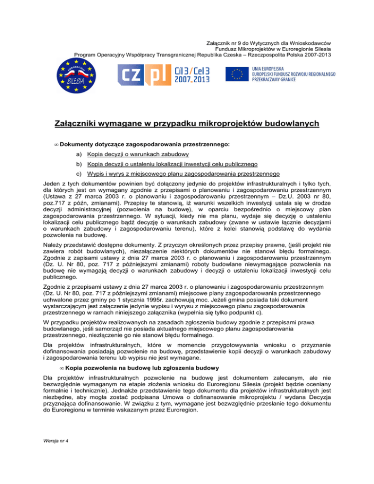 Załącznik nr 9 do Wytycznych dla Wnioskodawców Fundusz Mikroprojektów w Euroregionie Silesia Program Operacyjny Współpracy Transgranicznej Republika Czeska – Rzeczpospolita Polska 2007-2013 Załączniki wymagane w przypadku mikroprojektów budowlanych • Dokumenty dotyczące zagospodarowania przestrzennego: a) Kopia decyzji o warunkach zabudowy b) Kopia decyzji o ustaleniu lokalizacji inwestycji celu publicznego c) Wypis i wyrys z miejscowego planu zagospodarowania przestrzennego Jeden z tych dokumentów powinien być dołączony jedynie do projektów infrastrukturalnych i tylko tych, dla których jest on wymagany zgodnie z przepisami o planowaniu i zagospodarowaniu przestrzennym (Ustawa z 27 marca 2003 r. o planowaniu i zagospodarowaniu przestrzennym – Dz.U. 2003 nr 80, poz.717 z późn, zmianami). Przepisy te stanowią, iż warunki wszelkich inwestycji ustala się w drodze decyzji administracyjnej (pozwolenia na budowę), w oparciu bezpośrednio o miejscowy plan zagospodarowania przestrzennego. W sytuacji, kiedy nie ma planu, wydaje się decyzję o ustaleniu lokalizacji celu publicznego bądź decyzję o warunkach zabudowy (zwane w ustawie łącznie decyzjami o warunkach zabudowy i zagospodarowaniu terenu), które z kolei stanowią podstawę do wydania pozwolenia na budowę. Należy przedstawić dostępne dokumenty. Z przyczyn określonych przez przepisy prawne, (jeśli projekt nie zawiera robót budowlanych), niezałączenie niektórych dokumentów nie stanowi błędu formalnego. Zgodnie z zapisami ustawy z dnia 27 marca 2003 r. o planowaniu i zagospodarowaniu przestrzennym (Dz. U. Nr 80, poz. 717 z późniejszymi zmianami) roboty budowlane niewymagające pozwolenia na budowę nie wymagają decyzji o warunkach zabudowy i decyzji o ustaleniu lokalizacji inwestycji celu publicznego. Zgodnie z przepisami ustawy z dnia 27 marca 2003 r. o planowaniu i zagospodarowaniu przestrzennym (Dz. U. Nr 80, poz. 717 z późniejszymi zmianami) miejscowe plany zagospodarowania przestrzennego uchwalone przez gminy po 1 stycznia 1995r. zachowują moc. Jeżeli gmina posiada taki dokument wystarczającym jest załączenie jedynie wypisu i wyrysu z miejscowego planu zagospodarowania przestrzennego w ramach niniejszego załącznika (wypełnia się tylko podpunkt c). W przypadku projektów realizowanych na zasadach zgłoszenia budowy zgodnie z przepisami prawa budowlanego, jeśli samorząd nie posiada aktualnego miejscowego planu zagospodarowania przestrzennego, niezłączenie go nie stanowi błędu formalnego. Dla projektów infrastrukturalnych, które w momencie przygotowywania wniosku o przyznanie dofinansowania posiadają pozwolenie na budowę, przedstawienie kopii decyzji o warunkach zabudowy i zagospodarowania terenu lub wypisu nie jest wymagane. • Kopia pozwolenia na budowę lub zgłoszenia budowy Dla projektów infrastrukturalnych pozwolenie na budowę jest dokumentem zalecanym, ale nie bezwzględnie wymaganym na etapie złożenia wniosku do Euroregionu Silesia (projekt będzie oceniany formalnie i technicznie). Jednakże przedstawienie tego dokumentu dla projektów infrastrukturalnych jest niezbędne, aby mogła zostać podpisana Umowa o dofinansowanie mikroprojektu / wydana Decyzja przyznająca dofinansowanie. W związku z tym, wymagane jest bezwzględnie przesłanie tego dokumentu do Euroregionu w terminie wskazanym przez Euroregion. Wersja nr 4 Załącznik nr 9 do Wytycznych dla Wnioskodawców Fundusz Mikroprojektów w Euroregionie Silesia Program Operacyjny Współpracy Transgranicznej Republika Czeska – Rzeczpospolita Polska 2007-2013 Załączone dokumenty powinny być aktualne (np. pozwolenie na budowę nie starsze niż dwa lata, chyba że prace budowlane zostały już rozpoczęte. W takim przypadku należy dołączyć kopię pierwszej strony stosownego dziennika budowy oraz kopię strony z pierwszym wpisem w dzienniku budowy. Zgodnie z art. 28 ustawy z dnia 7 lipca 1994 r. Prawo budowlane (Dz. U. Z 2006 r., Nr 156, poz. 1118) roboty budowlane można rozpocząć jedynie na podstawie ostatecznej decyzji o pozwoleniu na budowę. Nie wszystkie projekty dotyczące robót budowlanych wymagają pozwolenia na budowę. Szczegółowo wyjaśniają to zagadnienie artykuły 29, 29a, 30, 31 Ustawy – Prawo budowlane z 7 lipca 1994 (Dz. U. 2000 nr 106, poz.1126 – tekst jednolity) z późniejszymi zmianami (ostatnie zmiany z 27 marca 2003 Dz. U. 2003 nr 80, poz. 718), tekst jednolity (Dz.U.2006 nr 156, poz.1118). • Wyciąg z dokumentacji technicznej (projekt i opis techniczny) Beneficjent jako wymagany załącznik musi przedstawić wykaz z projektu budowlanego, zawierający: numery tomów, tytuły i autorów opracowań wraz z numerami uprawnień oraz opisem technicznym. Ponadto, na żądanie Euroregionu beneficjent jest zobowiązany do dostarczenia pełnej dokumentacji technicznej projektu. Załącznik ten może okazać się istotnym w procesie oceny wniosku przy weryfikacji rzeczowego zakresu robót. • Oświadczenie o prawie dysponowania nieruchomością na cele budowlane (potwierdzenie prawa do dysponowania gruntem lub obiektami) Generalną zasadą jest, że dofinansowaniu mogą podlegać jedynie projekty realizowane na terenie (w obiekcie) należącym lub będącym w dyspozycji beneficjenta. Dlatego też do wniosku należy dołączyć stosowne oświadczenie Załącznik nr 20), że beneficjent posiada prawo do dysponowania nieruchomością. Inwestor nie musi dołączać do wniosku wypisów z ksiąg wieczystych lub aktów notarialnych potwierdzających to prawo (złożenie fałszywego oświadczenia jest zagrożone odpowiedzialnością karną). Dopuszcza się prawo dysponowania nieruchomością ograniczonego prawa rzeczowego (np. w formie dzierżawy lub użyczenia) na okres minimum pięciu lat od dnia planowanego zakończenia projektu. Umowa dzierżawy lub użyczenia musi gwarantować warunki, które umożliwią pełną realizację projektu. W przypadku dysponowania nieruchomością w fo