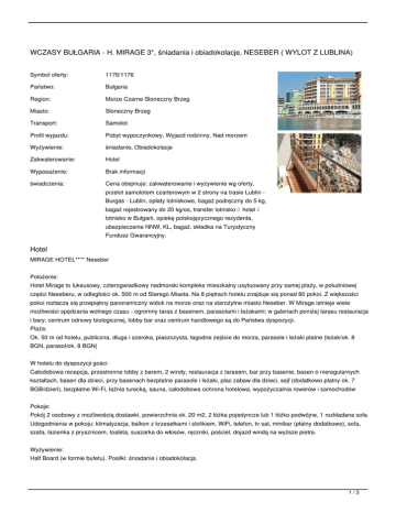 WCZASY BUŁGARIA - H. MIRAGE 3*, śniadania i obiadokolacje, NESEBER ( WYLOT Z LUBLINA) Symbol oferty: 1176/1176 Państwo: Bułgaria Region: Morze Czarne Słoneczny Brzeg Miasto: Słoneczny Brzeg Transport: Samolot Profil wyjazdu: Pobyt wypoczynkowy, Wyjazd rodzinny, Nad morzem Wyżywienie: śniadanie, Obiadokolacje Zakwaterowanie: Hotel Wyposażenie: Brak informacji świadczenia: Cena obejmuje: zakwaterowanie i wyżywienie wg oferty, przelot samolotem czarterowym w 2 strony na trasie Lublin - Burgas - Lublin, opłaty lotniskowe, bagaż podręczny do 5 kg, bagaż rejestrowany do 20 kg/os, transfer lotnisko hotel lotnisko w Bułgarii, opiekę polskojęzycznego rezydenta, ubezpieczenie NNW, KL, bagaż, składka na Turystyczny Fundusz Gwarancyjny. Hotel MIRAGE HOTEL**** Neseber Położenie: Hotel Mirage to luksusowy, czterogwiadkowy nadmorski kompleks mieszkalny usytuowany przy samej plaży, w południowej części Neseberu, w odległości ok. 500 m od Starego Miasta. Na 8 piętrach hotelu znajduje się ponad 80 pokoi. Z większości pokoi roztacza się przepiękny panoramiczny widok na morze oraz na starożytne miasto Neseber. W Mirage istnieje wiele możliwości spędzania wolnego czasu - ogromny taras z basenem, parasolami i leżakami; w galeriach poniżej tarasu restauracja i bary; centrum odnowy biologicznej, lobby bar oraz centrum handlowego są do Państwa dyspozycji. Plaża: Ok. 50 m od hotelu, publiczna, długa i szeroka, piaszczysta, łagodne zejście do morza, parasole i leżaki płatne (leżak/ok. 8 BGN, parasol/ok. 8 BGN) W hotelu do dyspozycji gości: Całodobowa recepcja, przestronne lobby z barem, 2 windy, restauracja z tarasem, bar przy basenie, basen o nieregularnych kształtach, basen dla dzieci, przy basenach bezpłatne parasole i leżaki, plac zabaw dla dzieci, sejf (dodatkowo płatny ok. 7 BGB/dzień), bezpłatne Wi-Fi, łaźnia turecką, sauna, całodobowa ochrona hotelowa, wypożyczalnia rowerów i samochodów Pokoje: Pokój 2 osobowy z możliwością dostawki, powierzchnia ok. 20 m2, 2 łóżka pojedyncze lub 1 łóżko podwójne, 1 rozkładana sofa Udogodnienia w pokoju: klimatyzacja, balkon z krzesełkami i stolikiem, WiFi, telefon, tv sat, minibar (płatny dodatkowo), sofa, szafa, łazienka z prysznicem, toaleta, suszarka do włosów, ręczniki, pościel, dojazd windą na wyższe pietra. Wyżywienie: Half Board (w formie bufetu). Posiłki: śniadanie i obiadokolacja. 1/3 Napoje zawarte w cenie: woda i soki do śniadania. Napoje do obiadokolacji za dodatkową opłatą. Cena zwiera Cena pakietu obejmuje: - przelot samolotem Small Planet na trasie Lublin - Burgas - Lublin - opłaty lotniskowe - bagaż podręczny do 5 kg na osobę - bagaż rejestrowany do 20 kg na osobę - transfer lotnisko - hotel - lotnisko w Bułgarii - zakwaterowanie - wyżywienie wg wybranego wariantu opiekę rezydenta na miejscu ubezpieczenie Signal Iduna (KL 10 000 Euro, NNW 15 000 zł, bagaż 800 zł) - Składka na Turystyczny Fundusz Gwarancyjny Uwagi Godziny przelotów będą potwierdzane na 24 godziny przed wyjazdem. Zbiórka na lotnisku na 2 godziny przed wylotem. Pierwszy i ostatni dzień imprezy przewidziany jest na przelot. TERMINY: od: 2017-06-19 do: 2017-06-26 (8 dni), miejsca: sprawdź miejsca cena od: 2240 PLN od: 2017-06-26 do: 2017-07-03 (8 dni), miejsca: sprawdź miejsca cena od: 2240 PLN od: 2017-07-03 do: 2017-07-10 (8 dni), miejsca: sprawdź miejsca cena od: 2490 PLN od: 2017-07-10 do: 2017-07-17 (8 dni), miejsca: sprawdź miejsca cena od: 2490 PLN od: 2017-07-17 do: 2017-07-24 (8 dni), miejsca: sprawdź miejsca cena od: 2490 PLN od: 2017-07-24 do: 2017-07-31 (8 dni), miejsca: sprawdź miejsca cena od: 2490 PLN od: 2017-07-31 do: 2017-08-07 (8 dni), miejsca: sprawdź miejsca cena od: 2490 PLN od: 2017-08-07 do: 2017-08-14 (8 dni), miejsca: sprawdź miejsca cena od: 2490 PLN od: 2017-08-14 do: 2017-08-21 (8 dni), miejsca: sprawdź miejsca cena od: 2490 PLN od: 2017-08-21 do: 2017-08-28 (8 dni), miejsca: sprawdź miejsca cena od: 2240 PLN od: 2017-08-28 do: 2017-09-04 (8 dni), miejsca: sprawdź miejsca cena od: 2240 PLN od: 2017-09-04 do: 2017-09-11 (8 dni), miejsca: sprawdź miejsca cena od: 2240 PLN CENNIK: Długość pobytu: 8 dni 8 dni Grupa cenowa: A8 B8 (-) (-) Transport (obligatoryjny) (*) LUZ-BOJ-LUZ (Lublin - Burgas - Lublin) Inne2 (do wyboru) (*) zniżka za wczesną rezerwację od osoby dorosłej -200 zniżka za wczesną rezerwację od dziecka 2-11.99 -300 Pobyt w obiekcie (do wyboru) Pokój 2-osobowy standardowo dla osób: 2 (-) Pokój 2-osoby + dostawka standardowo dla osób: 3 (-) Pokój 1-osobowy (-) Pobyt w obiekcie (obligatoryjny) (*) Hotel Mirage 3* ( Neseber) (-) -200 -300 (-) (-) (-) (-) 2/3 Inne (opcjonalne) GWARANCJA NIEZMIENNOŚCI CENY WATRA TRAVEL 80 Rodzaj osoby (do wyboru) 1 i 2 dziecko 2-11.99 zakwaterowane z 1 os.dorosłą 2040 (*) osoba dorosła w DBL z HB 2690 dziecko 0-2 lat 150 osoba dorosla w SGL z HB 3730 trzecia osoba dorosła w pok. DBL 2430 dziecko 2-11.99 zakwaterowane z 2 os.dorosłymi 1405 Ubezpieczenie (opcjonalne) ubezpieczenie od kosztów rezygnacji 100% kosztów 3% koszty rezyg. z rozsz. o ch.przewlekłe 100% 7.5 % ubezpieczenie od kosztów rezygnacji 80% 2.5 % ubezpieczenie od chorób przewlekłych 70 Ub.kosztów rezyg. z rozsz.o choroby przewlekłe 80% 6.5 % Inne (obligatoryjne) (*) Pakiet świadczeń wg oferty Inne (obligatoryjne) (*) składka na Turystyczny Fundusz Gwarancyjny 80 1920 2440 150 3230 2230 1405 3% 7.5 % 2.5 % 70 6.5 % (-) (-) (-) (-) Waluta: PLN Aktualne ceny z systemu S.A.R.T. (-) - cena usługi, podatku kalkulowana przy osobie lub gratis (*) - kwota wliczona w cenę standardową 3/3