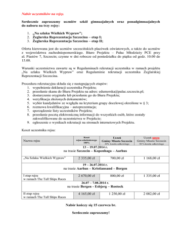 Nabór uczestników na rejsy. Serdecznie zapraszamy uczniów szkół gimnazjalnych oraz ponadgimnazjalnych do naboru na trzy rejsy: 1. „Na szlaku Wielkich Wypraw”; 2. Żeglarska Reprezentacja Szczecina – etap I; 3. Żeglarska Reprezentacja Szczecina – etap II; Oferta kierowana jest do uczniów szczecińskich placówek oświatowych, a także do uczniów z województwa zachodniopomorskiego. Biuro Projektu – Pałac Młodzieży PCE przy al. Piastów 7, Szczecin; czynne w dni robocze od poniedziałku do piątku od godz. 10.00 do 15.00. Warunki uczestnictwa zawarte są w Regulaminach rekrutacji uczestnika w ramach projektu „Na szlaku Wielkich Wypraw” oraz Regulaminie rekrutacji uczestnika Żeglarskiej Reprezentacji Szczecina. Procedura rekrutacyjna składa się z następujących etapów: 1. wypełnienie deklaracji uczestnika Projektu; 2. przesłanie skanu do Biura Projektu na adres: [email protected]; 3. dostarczenie oryginału lub przesłanie go do Biura Projektu; 4. weryfikacja złożonych dokumentów; 5. wybór kandydatów ze względu na kryterium grupy docelowej określone w § 3; 6. rozmowa kwalifikacyjna – autoprezentacja; 7. sporządzenie listy uczestników Projektu; 8. przesłanie pocztą elektroniczną informacji do wszystkich osób, które zostały zakwalifikowane do uczestnictwa w Projekcie; 9. ogłoszenie o wynikach rekrutacji na stronach internetowych Projektu. Koszt uczestnika rejsu: Koszt rejsu szkoleniowego 100% Nazwa rejsu Uczeń Gminy Miasto Szczecin Uczeń spoza Gminy Miasto Szczecin 30% kosztu całkowitego 50 % kosztu całkowitego 13 – 19.07.2014 r. na trasie Szczecin – Kopenhaga – Aarhus „Na Szlaku Wielkich Wypraw” 2 335,00 zł 700,00 zł 1 168,00 zł 19 – 26.07.2014 r. na trasie Aarhus – Kristiansand – Bergen I etap rejsu w ramach The Tall Ships Races 2 670,00 zł 800,00 zł 1 335,00 zł 26.07 – 7.08.2014 r. na trasie Bergen - Esbjerg – Rostock II etap rejsu w ramach The Tall Ships Races 4 165,00 zł 1 250,00 zł Nabór kończy się 15 czerwca br. Serdecznie zapraszamy! 2 082,00 zł