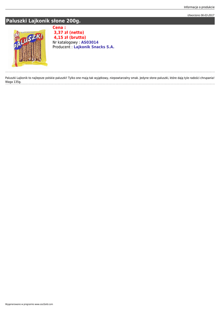 Informacje o produkcie Utworzono 06-03-2017 Paluszki Lajkonik słone 200g. Cena : 3,37 zł (netto) 4,15 zł (brutto) Nr katalogowy : AS03014 Producent : Lajkonik Snacks S.A. Paluszki Lajkonik to najlepsze polskie paluszki! Tylko one mają tak wyjątkowy, niepowtarzalny smak. Jedyne słone paluszki, które dają tyle radości chrupania! Waga 135g. Wygenerowano w programie www.oscGold.com