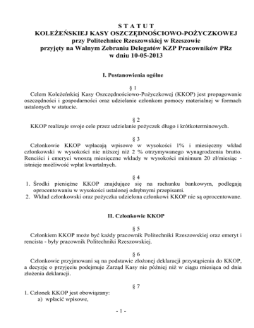 STATUT KOLEŻEŃSKIEJ KASY OSZCZĘDNOŚCIOWO-POŻYCZKOWEJ przy Politechnice Rzeszowskiej w Rzeszowie przyjęty na Walnym Zebraniu Delegatów KZP Pracowników PRz w dniu 10-05-2013 I. Postanowienia ogólne §1 Celem Koleżeńskiej Kasy Oszczędnościowo-Pożyczkowej (KKOP) jest propagowanie oszczędności i gospodarności oraz udzielanie członkom pomocy materialnej w formach ustalonych w statucie. §2 KKOP realizuje swoje cele przez udzielanie pożyczek długo i krótkoterminowych. §3 Członkowie KKOP wpłacają wpisowe w wysokości 1% i miesięczny wkład członkowski w wysokości nie niższej niż 2 % otrzymywanego wynagrodzenia brutto. Renciści i emeryci wnoszą miesięczne wkłady w wysokości minimum 20 zł/miesiąc istnieje możliwość wpłat kwartalnych. §4 1. Środki pieniężne KKOP znajdujące się na rachunku bankowym, podlegają oprocentowaniu w wysokości ustalonej odrębnymi przepisami. 2. Wkład członkowski oraz pożyczka udzielona członkowi KKOP nie są oprocentowane. II. Członkowie KKOP §5 Członkiem KKOP może być każdy pracownik Politechniki Rzeszowskiej oraz emeryt i rencista - były pracownik Politechniki Rzeszowskiej. §6 Członkowie przyjmowani są na podstawie złożonej deklaracji przystąpienia do KKOP, a decyzję o przyjęciu podejmuje Zarząd Kasy nie później niż w ciągu miesiąca od dnia złożenia deklaracji. §7 1. Członek KKOP jest obowiązany: a) wpłacić wpisowe, -1- b) wpłacać miesięczny wkład członkowski lub wyrazić zgodę na potrącanie wkładu z wynagrodzenia za pracę, zasiłku chorobowego lub zasiłku wychowawczego, c) ściśle przestrzegać przepisów statutu oraz postanowień organów KKOP. 2. Postanowienie ust. 1 pkt. a) nie dotyczy członków KKOP, którzy przenoszą swoje wkłady z poprzedniego miejsca pracy. § 8 Członek KKOP ma prawo: 1. gromadzić oszczędności w KKOP według zasad określonych w statucie, 2. korzystać z pożyczek, 3. brać udział w obradach Walnego Zebrania Członków, 4. wybierać i być wybieranym do Zarządu KKOP i Komisji Rewizyjnej. §9 Członek KKOP nabywa uprawnienia określone w § 8 pkt. 1, 3 i 4 z chwilą przyjęcia w poczet członków, zaś uprawnienia określone w § 8 pkt. 2 po wpłaceniu wpisowego i trzech kolejnych wkładów miesięcznych. § 10 Skreślenie z listy członków KKOP następuje: 1. na pisemne żądanie członka Kasy, 2. w razie rozwiązania stosunku pracy, z wyjątkiem przejścia na emeryturę lub rentę, 3. w razie śmierci członka Kasy, 4. na skutek decyzji Zarządu KKOP, powziętej w wyniku niedopełnienia przez członka obowiązków określonych w § 7. § 11 Członkowie KKOP skreśleni z listy członków na własne żądanie mogą być ponownie przyjęci do Kasy po upływie 6 miesięcy od dnia skreślenia na zasadach ogólnych. Powyższa zasada nie dotyczy rencistów i emerytów, którzy nie mogą być ponownie przyjęci do Kasy. Członkowie KKOP skreśleni na podstawie § 10 pkt. 4 mogą być ponownie przyjęci do Kasy po upływie 24 miesięcy od dnia skreślenia na zasadach ogólnych. § 12 Osobom skreślonym z listy członków KKOP przysługuje zwrot ich wkładów członkowskich w terminie do 1 miesiąca od dnia skreślenia z listy członków z wyjątkiem przypadku § 10 pkt. 3, kiedy w przypadku wkładów przekraczających aktualne zadłużenie różnicę wypłaca się osobie wskazanej w deklaracji przystąpienia do KKOP lub spadkobiercom zmarłego (w przeciwnym przypadku zastosowanie ma § 46). § 13 Osoby skreślone z listy członków KKOP powinny odebrać swoje wkłady najpóźniej w ciągu 12 miesięcy od dnia skreślenia. Jeżeli były członek KKOP nie odbierze swoich -2- wkładów w powyższym terminie, Zarząd Kasy po zatwierdzeniu bilansu KKOP za rok, w którym nastąpiło skreślenie, niepodjęte wkłady przenosi na fundusz rezerwowy określony w § 32. § 14 Członkowie KKOP, których stan wkładów przekroczył wysokość 1/2 aktualnie przyznawanej maksymalnej pożyczki mogą wycofać do 50 % wkładu pod warunkiem, że wkład nie jest zabezpieczeniem pożyczki. § 15 1. W stosunku do członków KKOP przebywających na urlopach bezpłatnych, macierzyńskich i wychowawczych można zawiesić obowiązek wpłacania miesięcznych wkładów członkowskich do czasu podjęcia pracy. Osoby korzystające z tego zwolnienia mogą otrzymać pożyczkę do wysokości zgromadzonego wkładu członkowskiego. 2. Osoby wymienione w pkt. 1 mogą korzystać wyłącznie z pożyczek ratalnych. III. Organy KKOP § 16 1. Organami KKOP są: a) Walne Zebranie Członków, b) Zarząd KKOP, c) Komisja Rewizyjna 2. Jeżeli KKOP liczy więcej niż 150 członków, zamiast Walnego Zebrania Członków, Zarząd zwołuje Zebranie Delegatów. 3. Wybór delegatów dokonywany jest przez Walne Zebrania Członków przeprowadzone w okręgach wyborczych. 4. Zarząd ustala okręgi wyborcze oraz harmonogram wyborów z zachowaniem zasady, iż 1 delegat przypada na 15 członków KKOP oraz przeprowadza wybory. Wybory delegatów są ważne niezależnie od ilości członków obecnych podczas głosowania na Walnym Zebraniu Członków w danym okręgu wyborczym. Wybór delegatów następuje w wyniku głosowania tajnego lub jawnego jeżeli tak zdecyduje większość członków obecnych na głosowaniu. 5. Delegaci wybierani są na okres kadencji Zarządu. § 17 1. Uchwały organów KKOP zapadają zwykłą większością głosów w obecności co najmniej połowy liczby członków danego organu. 2. W razie nie dojścia do skutku Zebrania Delegatów z powodu braku wymaganej liczby obecnych członków, zebranie powinno być zwołane w drugim terminie - nie później jednak niż w ciągu 14 dni. Zebranie Delegatów zwołane w drugim terminie jest ważne -3- bez względu na liczbę obecnych. Z zebrania sporządza się protokół, który podpisują przewodniczący zebrania i protokolant. 3. Zarząd i Komisja Rewizyjna pochodzą z wyboru. 4. Wybory członków Zarządu i Komisji Rewizyjnej przeprowadzane są w wy