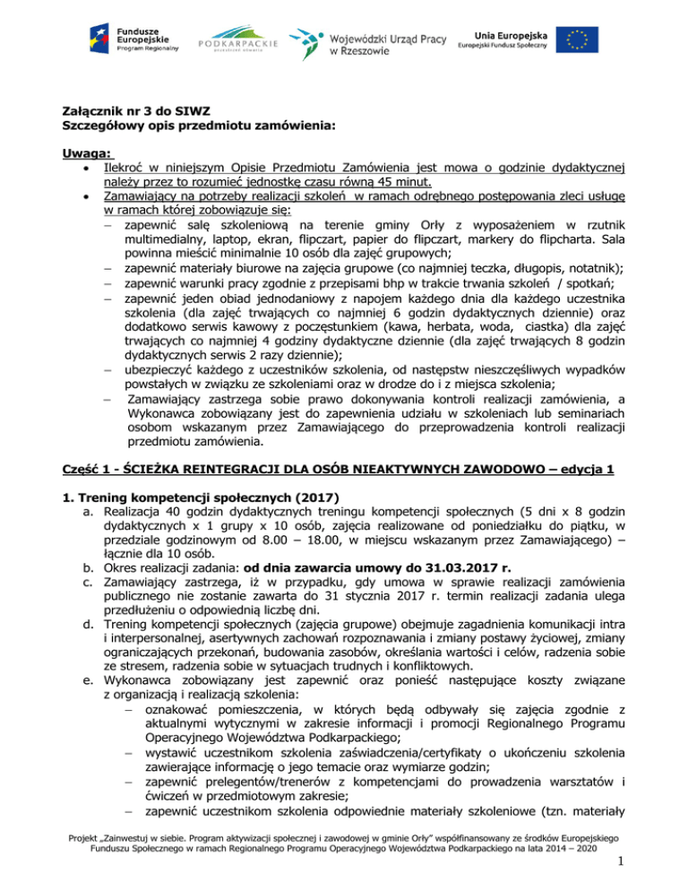 Załącznik nr 3 do SIWZ Szczegółowy opis przedmiotu zamówienia: Uwaga: Ilekroć w niniejszym Opisie Przedmiotu Zamówienia jest mowa o godzinie dydaktycznej należy przez to rozumieć jednostkę czasu równą 45 minut. Zamawiający na potrzeby realizacji szkoleń w ramach odrębnego postępowania zleci usługę w ramach której zobowiązuje się: zapewnić salę szkoleniową na terenie gminy Orły z wyposażeniem w rzutnik multimedialny, laptop, ekran, flipczart, papier do flipczart, markery do flipcharta. Sala powinna mieścić minimalnie 10 osób dla zajęć grupowych; zapewnić materiały biurowe na zajęcia grupowe (co najmniej teczka, długopis, notatnik); zapewnić warunki pracy zgodnie z przepisami bhp w trakcie trwania szkoleń / spotkań; zapewnić jeden obiad jednodaniowy z napojem każdego dnia dla każdego uczestnika szkolenia (dla zajęć trwających co najmniej 6 godzin dydaktycznych dziennie) oraz dodatkowo serwis kawowy z poczęstunkiem (kawa, herbata, woda, ciastka) dla zajęć trwających co najmniej 4 godziny dydaktyczne dziennie (dla zajęć trwających 8 godzin dydaktycznych serwis 2 razy dziennie); ubezpieczyć każdego z uczestników szkolenia, od następstw nieszczęśliwych wypadków powstałych w związku ze szkoleniami oraz w drodze do i z miejsca szkolenia; Zamawiający zastrzega sobie prawo dokonywania kontroli realizacji zamówienia, a Wykonawca zobowiązany jest do zapewnienia udziału w szkoleniach lub seminariach osobom wskazanym przez Zamawiającego do przeprowadzenia kontroli realizacji przedmiotu zamówienia. Część 1 - ŚCIEŻKA REINTEGRACJI DLA OSÓB NIEAKTYWNYCH ZAWODOWO – edycja 1 1. Trening kompetencji społecznych (2017) a. Realizacja 40 godzin dydaktycznych treningu kompetencji społecznych (5 dni x 8 godzin dydaktycznych x 1 grupy x 10 osób, zajęcia realizowane od poniedziałku do piątku, w przedziale godzinowym od 8.00 – 18.00, w miejscu wskazanym przez Zamawiającego) – łącznie dla 10 osób. b. Okres realizacji zadania: od dnia zawarcia umowy do 31.03.2017 r. c. Zamawiający zastrzega, iż w przypadku, gdy umowa w sprawie realizacji zamówienia publicznego nie zostanie zawarta do 31 stycznia 2017 r. termin realizacji zadania ulega przedłużeniu o odpowiednią liczbę dni. d. Trening kompetencji społecznych (zajęcia grupowe) obejmuje zagadnienia komunikacji intra i interpersonalnej, asertywnych zachowań rozpoznawania i zmiany postawy życiowej, zmiany ograniczających przekonań, budowania zasobów, określania wartości i celów, radzenia sobie ze stresem, radzenia sobie w sytuacjach trudnych i konfliktowych. e. Wykonawca zobowiązany jest zapewnić oraz ponieść następujące koszty związane z organizacją i realizacją szkolenia: oznakować pomieszczenia, w których będą odbywały się zajęcia zgodnie z aktualnymi wytycznymi w zakresie informacji i promocji Regionalnego Programu Operacyjnego Województwa Podkarpackiego; wystawić uczestnikom szkolenia zaświadczenia/certyfikaty o ukończeniu szkolenia zawierające informację o jego temacie oraz wymiarze godzin; zapewnić prelegentów/trenerów z kompetencjami do prowadzenia warsztatów i ćwiczeń w przedmiotowym zakresie; zapewnić uczestnikom szkolenia odpowiednie materiały szkoleniowe (tzn. materiały Projekt „Zainwestuj w siebie. Program aktywizacji społecznej i zawodowej w gminie Orły” współfinansowany ze środków Europejskiego Funduszu Społecznego w ramach Regionalnego Programu Operacyjnego Województwa Podkarpackiego na lata 2014 – 2020 1 szkoleniowe związane z tematyką szkolenia, 10 kpl.+1 kpl., które po zakończeniu szkolenia przejdą w posiadanie absolwentów (10 kpl.) i Zamawiającego w celu dokumentacji prawidłowości realizacji usługi (1 kpl.); przeprowadzić ewaluację – dokonać oceny za pomocą ankiet ewaluacyjnych; opracować i przedłożyć Zamawiającemu w terminie 30 dni kalendarzowych od zakończenia usługi raport z realizacji usługi szkoleniowej, listy poświadczające odbiór certyfikatów, kopie certyfikatów (zaświadczeń o ukończeniu szkolenia) przekazanych uczestnikom, ankiety ewaluacyjne wypełnione przez uczestników szkolenia oraz dziennik zajęć; 2.Trening kompetencji życiowych (2017) a. Realizacja 24 godzin dydaktycznych treningu kompetencji życiowych (3 dni x 8 godzin dydaktycznych x 1 grupa x 10 osób, zajęcia realizowane od poniedziałku do piątku, w przedziale godzinowym od 8.00 – 18.00, w miejscu wskazanym przez Zamawiającego) – łącznie dla 10 osób. b. Okres realizacji zadania: od dnia zawarcia umowy do 31.03.2017 r. c. Zamawiający zastrzega, iż w przypadku, gdy umowa w sprawie realizacji zamówienia publicznego nie zostanie zawarta do 31 stycznia 2017 r. termin realizacji zadania ulega przedłużeniu o odpowiednią liczbę dni. d. Trening kompetencji życiowych (zajęcia grupowe) obejmuje nauka umiejętności gospodarowania budżetem domowym, zarządzania czasem, załatwiania spraw w różnego rodzaju instytucjach. e. Wykonawca zobowiązany jest zapewnić oraz ponieść następujące koszty związane z organizacją i realizacją szkolenia: oznakować pomieszczenia, w których będą odbywały się zajęcia zgodnie z aktualnymi wytycznymi w zakresie informacji i promocji Regionalnego Programu Operacyjnego Województwa Podkarpackiego; wystawić uczestnikom szkolenia zaświadczenia/certyfikaty o ukończeniu szkolenia zawierające informację o jego temacie oraz wymiarze godzin; zapewnić prelegentów/trenerów z kompetencjami do prowadzenia warsztatów i ćwiczeń w przedmiotowym zakresie; zapewnić uczestnikom szkolenia odpowiednie materiały szkoleniowe (tzn. materiały szkoleniowe związane z tematyką szkolenia, 10 kpl.+1 kpl., które po zakończeniu szkolenia przejdą w posiadanie absolwentów (10 kpl.) i Zamawiającego w celu dokumentacji prawidłowości realizacji usługi (1 kpl.); przeprowadzić ewaluację – dokonać oceny za pomocą ankiet ewaluacyjnych; opracować i przedłożyć