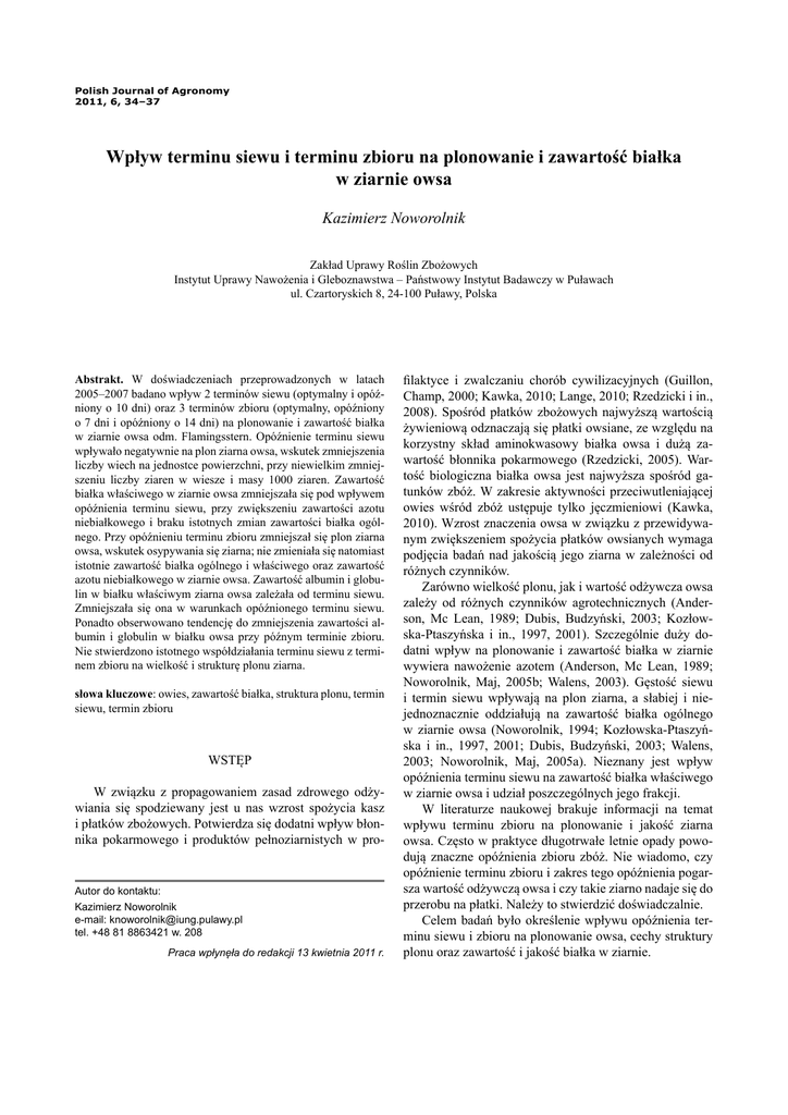 34 Polish Journal of Agronomy, No. 6, 2011 Polish Journal of Agronomy 2011, 6, 34–37 Wpływ terminu siewu i terminu zbioru na plonowanie i zawartość białka w ziarnie owsa Kazimierz Noworolnik Zakład Uprawy Roślin Zbożowych Instytut Uprawy Nawożenia i Gleboznawstwa – Państwowy Instytut Badawczy w Puławach ul. Czartoryskich 8, 24-100 Puławy, Polska Abstrakt. W doświadczeniach przeprowadzonych w latach 2005–2007 badano wpływ 2 terminów siewu (optymalny i opóźniony o 10 dni) oraz 3 terminów zbioru (optymalny, opóźniony o 7 dni i opóźniony o 14 dni) na plonowanie i zawartość białka w ziarnie owsa odm. Flamingsstern. Opóźnienie terminu siewu wpływało negatywnie na plon ziarna owsa, wskutek zmniejszenia liczby wiech na jednostce powierzchni, przy niewielkim zmniejszeniu liczby ziaren w wiesze i masy 1000 ziaren. Zawartość białka właściwego w ziarnie owsa zmniejszała się pod wpływem opóźnienia terminu siewu, przy zwiększeniu zawartości azotu niebiałkowego i braku istotnych zmian zawartości białka ogólnego. Przy opóźnieniu terminu zbioru zmniejszał się plon ziarna owsa, wskutek osypywania się ziarna; nie zmieniała się natomiast istotnie zawartość białka ogólnego i właściwego oraz zawartość azotu niebiałkowego w ziarnie owsa. Zawartość albumin i globulin w białku właściwym ziarna owsa zależała od terminu siewu. Zmniejszała się ona w warunkach opóźnionego terminu siewu. Ponadto obserwowano tendencję do zmniejszenia zawartości albumin i globulin w białku owsa przy późnym terminie zbioru. Nie stwierdzono istotnego współdziałania terminu siewu z terminem zbioru na wielkość i strukturę plonu ziarna. słowa kluczowe: owies, zawartość białka, struktura plonu, termin siewu, termin zbioru WSTĘP W związku z propagowaniem zasad zdrowego odżywiania się spodziewany jest u nas wzrost spożycia kasz i płatków zbożowych. Potwierdza się dodatni wpływ błonnika pokarmowego i produktów pełnoziarnistych w pro- Autor do kontaktu: Kazimierz Noworolnik e-mail: [email protected] tel. +48 81 8863421 w. 208 Praca wpłynęła do redakcji 13 kwietnia 2011 r. filaktyce i zwalczaniu chorób cywilizacyjnych (Guillon, Champ, 2000; Kawka, 2010; Lange, 2010; Rzedzicki i in., 2008). Spośród płatków zbożowych najwyższą wartością żywieniową odznaczają się płatki owsiane, ze względu na korzystny skład aminokwasowy białka owsa i dużą zawartość błonnika pokarmowego (Rzedzicki, 2005). Wartość biologiczna białka owsa jest najwyższa spośród gatunków zbóż. W zakresie aktywności przeciwutleniającej owies wśród zbóż ustępuje tylko jęczmieniowi (Kawka, 2010). Wzrost znaczenia owsa w związku z przewidywanym zwiększeniem spożycia płatków owsianych wymaga podjęcia badań nad jakością jego ziarna w zależności od różnych czynników. Zarówno wielkość plonu, jak i wartość odżywcza owsa zależy od różnych czynników agrotechnicznych (Anderson, Mc Lean, 1989; Dubis, Budzyński, 2003; Kozłowska-Ptaszyńska i in., 1997, 2001). Szczególnie duży dodatni wpływ na plonowanie i zawartość białka w ziarnie wywiera nawożenie azotem (Anderson, Mc Lean, 1989; Noworolnik, Maj, 2005b; Walens, 2003). Gęstość siewu i termin siewu wpływają na plon ziarna, a słabiej i niejednoznacznie oddziałują na zawartość białka ogólnego w ziarnie owsa (Noworolnik, 1994; Kozłowska-Ptaszyńska i in., 1997, 2001; Dubis, Budzyński, 2003; Walens, 2003; Noworolnik, Maj, 2005a). Nieznany jest wpływ opóźnienia terminu siewu na zawartość białka właściwego w ziarnie owsa i udział poszczególnych jego frakcji. W literaturze naukowej brakuje informacji na temat wpływu terminu zbioru na plonowanie i jakość ziarna owsa. Często w praktyce długotrwałe letnie opady powodują znaczne opóźnienia zbioru zbóż. Nie wiadomo, czy opóźnienie terminu zbioru i zakres tego opóźnienia pogarsza wartość odżywczą owsa i czy takie ziarno nadaje się do przerobu na płatki. Należy to stwierdzić doświadczalnie. Celem badań było określenie wpływu opóźnienia terminu siewu i zbioru na plonowanie owsa, cechy struktury plonu oraz zawartość i jakość białka w ziarnie. 35 K. Noworolnik – Wpływ terminu siewu i terminu zbioru na plonowanie owsa MATERIAŁ I METODY BADAŃ W doświadczeniach mikropoletkowych przeprowadzonych w Instytucie Uprawy Nawożenia i Gleboznawstwa – PIB w Puławach w latach 2005–2007 badano wpływ 2 terminów siewu: wczesny (8–14 IV) i późny (18–24 IV) oraz 3 terminów zbioru: optymalny (w dojrzałości pełnej ziarna), opóźniony o 7 dni i opóźniony o 14 dni na plonowanie owsa. Doświadczenia zakładano na glebie kompleksu pszennego dobrego (piasek gliniasty mocny na glinie lekkiej). Do badań użyto odmiany Flamingsstern, zalecanej do produkcji płatków. Określono plon ziarna, liczbę wiech na 1 m2, liczbę ziaren w wiesze, masę 1000 ziaren i masę ziaren osypanych. W pobranych obiektowych próbkach ziarna (oplewionego) oznaczono zawartość białka ogólnego (metodą Dumasa), zawartość białka właściwego (metodą Modesta i Engela) oraz zawartość albumin i globulin w białku właściwym wg Wieser i in. (1998). Doświadczenia zakładano metodą podbloków losowanych, w 4 powtórzeniach. Zabiegi agrotechniczne stosowano zgodnie z zaleceniami IUNG-PIB (Sułek, Brzóska, 2007). Wyniki opracowano statystycznie metodą analizy wariancji z zastosowaniem półprzedziałów ufności Tukeya. Warunki pogodowe w poszczególnych latach badań (szczególnie w okresie marzec – maj) nie różniły się znacznie, nie odbiegając w dużej mierze od miesięcznych średnich wieloletnich ilości opadów i temperatury. Przeważnie mniejsza od średniej wieloletniej ilość opadów w jednym miesiącu łączyła się z większą ilością opadów w następnym miesiącu i odwrotnie. Jedynie w okresie czerwiec – lipiec 2006 roku wystąpiły znacznie mniejsze ilości opadów od śred