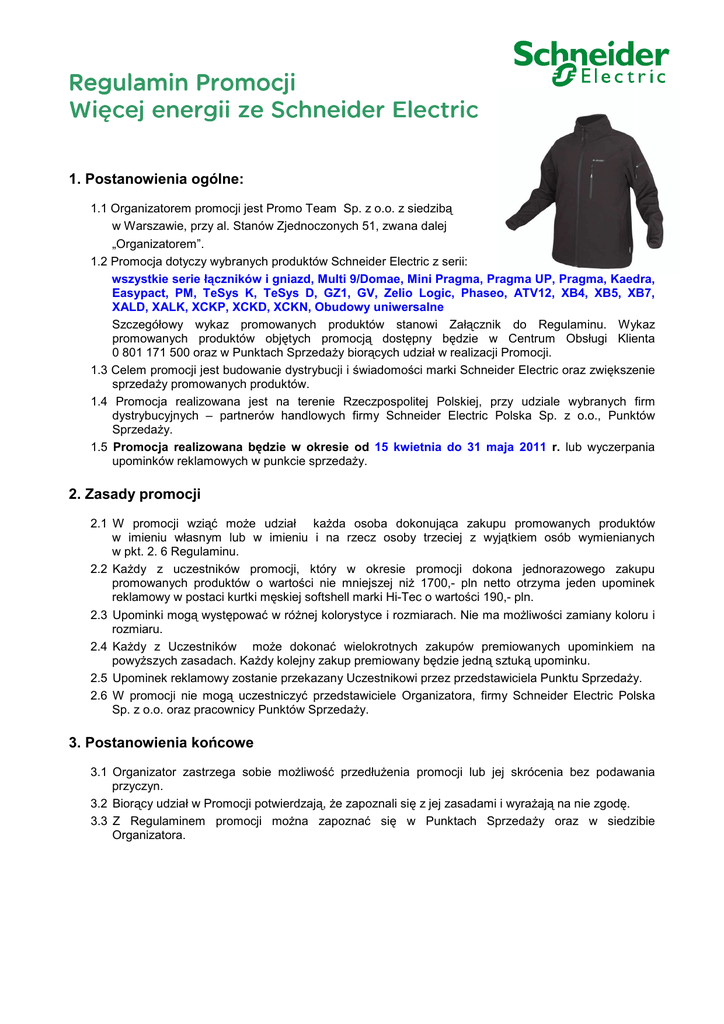 Regulamin Promocji Więcej energii ze Schneider Electric 1. Postanowienia ogólne: 1.1 Organizatorem promocji jest Promo Team Sp. z o.o. z siedzibą w Warszawie, przy al. Stanów Zjednoczonych 51, zwana dalej „Organizatorem”. 1.2 Promocja dotyczy wybranych produktów Schneider Electric z serii: wszystkie serie łączników i gniazd, Multi 9/Domae, Mini Pragma, Pragma UP, Pragma, Kaedra, Easypact, PM, TeSys K, TeSys D, GZ1, GV, Zelio Logic, Phaseo, ATV12, XB4, XB5, XB7, XALD, XALK, XCKP, XCKD, XCKN, Obudowy uniwersalne Szczegółowy wykaz promowanych produktów stanowi Załącznik do Regulaminu. Wykaz promowanych produktów objętych promocją dostępny będzie w Centrum Obsługi Klienta 0 801 171 500 oraz w Punktach SprzedaŜy biorących udział w realizacji Promocji. 1.3 Celem promocji jest budowanie dystrybucji i świadomości marki Schneider Electric oraz zwiększenie sprzedaŜy promowanych produktów. 1.4 Promocja realizowana jest na terenie Rzeczpospolitej Polskiej, przy udziale wybranych firm dystrybucyjnych – partnerów handlowych firmy Schneider Electric Polska Sp. z o.o., Punktów SprzedaŜy. 1.5 Promocja realizowana będzie w okresie od 15 kwietnia do 31 maja 2011 r. lub wyczerpania upominków reklamowych w punkcie sprzedaŜy. 2. Zasady promocji 2.1 W promocji wziąć moŜe udział kaŜda osoba dokonująca zakupu promowanych produktów w imieniu własnym lub w imieniu i na rzecz osoby trzeciej z wyjątkiem osób wymienianych w pkt. 2. 6 Regulaminu. 2.2 KaŜdy z uczestników promocji, który w okresie promocji dokona jednorazowego zakupu promowanych produktów o wartości nie mniejszej niŜ 1700,- pln netto otrzyma jeden upominek reklamowy w postaci kurtki męskiej softshell marki Hi-Tec o wartości 190,- pln. 2.3 Upominki mogą występować w róŜnej kolorystyce i rozmiarach. Nie ma moŜliwości zamiany koloru i rozmiaru. 2.4 KaŜdy z Uczestników moŜe dokonać wielokrotnych zakupów premiowanych upominkiem na powyŜszych zasadach. KaŜdy kolejny zakup premiowany będzie jedną sztuką upominku. 2.5 Upominek reklamowy zostanie przekazany Uczestnikowi przez przedstawiciela Punktu SprzedaŜy. 2.6 W promocji nie mogą uczestniczyć przedstawiciele Organizatora, firmy Schneider Electric Polska Sp. z o.o. oraz pracownicy Punktów SprzedaŜy. 3. Postanowienia końcowe 3.1 Organizator zastrzega sobie moŜliwość przedłuŜenia promocji lub jej skrócenia bez podawania przyczyn. 3.2 Biorący udział w Promocji potwierdzają, Ŝe zapoznali się z jej zasadami i wyraŜają na nie zgodę. 3.3 Z Regulaminem promocji moŜna zapoznać się w Punktach SprzedaŜy oraz w siedzibie Organizatora.