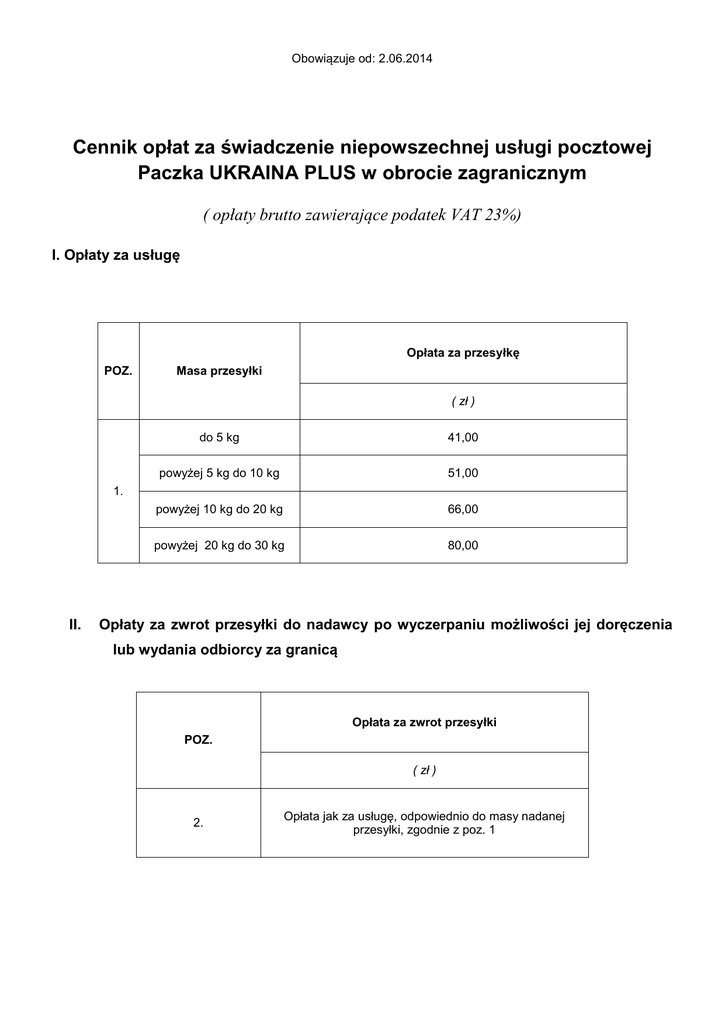 Obowiązuje od: 2.06.2014 Cennik opłat za świadczenie niepowszechnej usługi pocztowej Paczka UKRAINA PLUS w obrocie zagranicznym ( opłaty brutto zawierające podatek VAT 23%) I. Opłaty za usługę Opłata za przesyłkę POZ. Masa przesyłki ( zł ) do 5 kg 41,00 powyżej 5 kg do 10 kg 51,00 powyżej 10 kg do 20 kg 66,00 powyżej 20 kg do 30 kg 80,00 1. II. Opłaty za zwrot przesyłki do nadawcy po wyczerpaniu możliwości jej doręczenia lub wydania odbiorcy za granicą Opłata za zwrot przesyłki POZ. ( zł ) 2. Opłata jak za usługę, odpowiednio do masy nadanej przesyłki, zgodnie z poz. 1