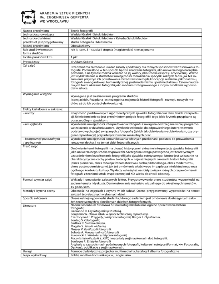 Nazwa przedmiotu Teorie fotografii Jednostka prowadząca Wydział