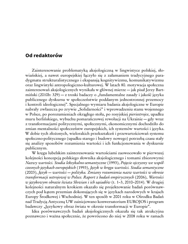 Od redaktorów Zainteresowanie problematyką aksjologiczną w lingwistyce polskiej, słowiańskiej, a nawet europejskiej łączyło się z załamaniem tradycyjnego paradygmatu strukturalistycznego i ekspansją kognitywizmu, komunikatywizmu oraz lingwistyki antropologiczno-kulturowej. W latach 80. motywacja społeczna zainteresowań aksjologicznych wynikała w głównej mierze — jak pisał Jerzy Bartmiński (2010b: 329) — z troski badaczy o „fundamentalne zasady i jakość języka publicznego dyskursu w społeczeństwie poddanym jednostronnej przemocy i kontroli ideologicznej”. Specjalnego wymiaru badania aksjologiczne w Europie nabrały zwłaszcza po zrywie „Solidarności” i wprowadzeniu stanu wojennego w Polsce, po porozumieniach okrągłego stołu, po rosyjskiej pieriestrojce, upadku muru berlińskiego, wybuchu pomarańczowej rewolucji na Ukrainie — gdy wraz z transformacjami politycznymi, społecznymi, ekonomicznymi dochodziło do zmian mentalności społeczeństw europejskich, ich systemów wartości i języka. W dobie tych złożonych, wielorakich przekształceń i przewartościowań systemu społeczno-politycznego (upadku starego i budowy nowego) potrzebą czasu stały się analizy sposobów rozumienia wartości i ich funkcjonowania w dyskursie publicznym. W kręgu lubelskim zainteresowanie wartościami zaowocowało w pierwszej kolejności koncepcją polskiego słownika aksjologicznego i tomami zbiorowymi: Nazwy wartości. Studia leksykalno-semantyczne (1993), Pojęcie ojczyzny we współczesnych językach europejskich (1993), Język w kręgu wartości. Studia semantyczne (2003), Język — wartości — polityka. Zmiany rozumienia nazw wartości w okresie transformacji ustrojowej w Polsce. Raport z badań empirycznych (2006), Wartości w językowym obrazie świata Słowian i ich sąsiadów (t. 1–3, 2010–2014). W drugiej kolejności naturalnym krokiem okazało się projektowanie badań porównawczych pod kątem przemian dokonujących się w językach narodowych w krajach Europy Środkowej i Wschodniej. W ten sposób w 2001 roku w Ośrodku Badań nad Tradycją Antyczną UW zainicjowano konwersatorium EUROJOS i program badawczy „Językowy obraz świata w okresie transformacji w Europie”. Idea porównawczych badań aksjologicznych okazała się tak atrakcyjna poznawczo i ważna społecznie, że powrócono do niej w 2008 roku w ramach 8 OD REDAKTORÓW bloku tematycznego „Wartości w językowym obrazie Słowian i ich sąsiadów” na XIV Międzynarodowym Kongresie Slawistów w Ochrydzie. Następnie — z inicjatywy Jerzego Bartmińskiego — konwersatorium EUROJOS afiliowano w Instytucie Slawistyki PAN. U podłoża projektowanych badań porównawczych legły założenia, że: (1) język jest nie tylko narzędziem komunikacji, ale też efektem procesu doświadczania, konceptualizacji i interpretacji świata; (2) w języku — w gramatyce, słownictwie i tekstach jako manifestacji systemu językowego — utrwalony jest obraz świata; (3) językowy obraz świata jest czynnikiem konsolidującym określone wspólnoty: rodzinne, lokalne, regionalne, narodowe i transnarodowe; jest współczynnikiem decydującym o ich tożsamości; (4) u podłoża językowego obrazu świata leżą wartości, których hierarchia i pojmowanie są różne w zależności od języka i kultury; (5) badanie językowych obrazów świata różnych wspólnot komunikacyjnych powala dotrzeć do podobieństw i różnic w konceptualizacji świata. Wagę tych badań Jerzy Bartmiński (2009b: 1) podkreślał na łamach „Pauzy Akademickiej”, czasopisma Polskiej Akademii Umiejętności, wypowiadając się na temat priorytetów badawczych w humanistyce: „Obecnie za priorytet uważam rozpoznanie i zdefiniowanie podstawowych wartości naszej kultury na możliwie szerokim tle porównawczym, ponadnarodowym, z uwzględnieniem jej wszystkich obiegów, od »wysokiego« do »niskiego«, na tle ujawniających się różnic między Wschodem i Zachodem Europy. Potrzebne jest określenie, co składa się na fenomen polskości na tle Europy. W programie mieścić się powinny także niekonfesyjne, tj. niezależne od Kościoła (wolne od instytucjonalnych nacisków) badania nad naszą religijnością, jej cechami narodowymi i uniwersalnymi. Za potrzebne uważam analizy języka w jego różnych sferach użycia, badania kultury życia codziennego, mentalności potocznej, a także diagnozy dotyczące komunikacji publicznej (w prasie, telewizji i nowych mediach elektronicznych, w Internecie)”. Od czasu publikacji tej wypowiedzi bibliografia lingwistycznych prac poświęconych wartościom i wartościowaniu powiększyła się w zawrotnym tempie. Ugruntowaną i ważną pozycję zajmuje w niej dorobek Jerzego Bartmińskiego, inspiratora i twórcy polskiej etnolingwistyki, przez całe życie zawodowe związanego z Instytutem Filologii Polskiej UMCS w Lublinie. Profesor — rozwijając autorską koncepcję lingwistyki antropologiczno-kulturowej (etnolingwistyki) jako dyscypliny ukierunkowanej na badanie relacji język–kultura i zogniskowanej wokół pojęć językowego obrazu świata, stereotypów językowo-kulturowych, definicji kognitywnej, profilowania, punktu widzenia, perspektywy interpretacyjnej — w centrum badań zawsze sytuował O D R E D A KTO R ÓW 9 kategorię podmiotu (homo loquens) i wartości. Wartości — jak pisał w książce Aspects of Cognitive Ethnolinguistics (Bartmiński 2009a: 12) — są „pomostem między językiem a kulturą. Leżą w sercu kultury i stanowią fundament języka”. Aby uczcić jubileusz siedemdziesięciopięciolecia urodzin Profesora, jako Jego uczniowie, współpracownicy i członkowie lubelskiego zespołu etnolingwistycznego, zdecydowaliśmy, że — tym razem zamiast tradycyjnej księgi jubileuszowej — dokonamy wyboru i opracowania redakcyjnego Jego rozproszonych prac aksjologicznych, publikowanych w latach 1981–2014 w pismach i tomach zbiorowych, często dziś niedo