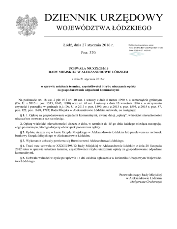 DZIENNIK URZĘDOWY WOJEWÓDZTWA ŁÓDZKIEGO Łódź, dnia 27 stycznia 2016 r. Elektronicznie podpisany przez: Anna Siwińska; Łódzki Urząd Wojewódzki w Łodzi Data: 2016-01-27 14:23:05 Poz. 370 UCHWAŁA NR XIX/202/16 RADY MIEJSKIEJ W ALEKSANDROWIE ŁÓDZKIM z dnia 21 stycznia 2016 r. w sprawie ustalenia terminu, częstotliwości i trybu uiszczania opłaty za gospodarowanie odpadami komunalnymi Na podstawie art. 18 ust. 2 pkt 15 i art. 40 ust. 1 ustawy z dnia 8 marca 1990 r. o samorządzie gminnym (Dz. U. z 2015 r. poz. 1515, 1045, 1890) oraz art. 6l ust. 1 ustawy z dnia 13 września 1996 r. o utrzymaniu czystości i porządku w gminach (t.j.: Dz. U. z 2013 r. poz. 1399, zm.: z 2013 r. poz. 1593, z 2015 r. poz. 87, poz. 122, poz. 1688, 1793) Rada Miejska w Aleksandrowie Łódzkim uchwala, co następuje: § 1. 1. Opłatę za gospodarowanie odpadami komunalnymi, zwaną dalej „opłatą”, właściciel nieruchomości uiszcza bez wezwania raz na miesiąc. 2. Opłatę właściciel nieruchomości uiszcza z dołu, w terminie do 15-go dnia każdego miesiąca następującego po miesiącu, którego dotyczy obowiązek ponoszenia opłaty. § 2. Opłatę uiszcza się w kasie Urzędu Miejskiego w Aleksandrowie Łódzkim lub przelewem na rachunek bankowy Urzędu Miejskiego w Aleksandrowie Łódzkim. § 3. Wykonanie uchwały powierza się Burmistrzowi Aleksandrowa Łódzkiego. § 4. Traci moc uchwała nr XXXIII/298/12 Rady Miejskiej w Aleksandrowie Łódzkim z dnia 28 listopada 2012 roku w sprawie ustalenia terminu, częstotliwości i trybu uiszczania opłaty za gospodarowanie odpadami komunalnymi. § 5. Uchwała wchodzi w życie po upływie 14 dni od dnia ogłoszenia w Dzienniku Urzędowym Województwa Łódzkiego. Przewodniczący Rady Miejskiej w Aleksandrowie Łódzkim Małgorzata Grabarczyk