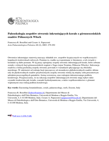 Paleoekologia zespołów otwornic inkrustujących korale z górnoeoceńskich osadów Północnych Włoch Francesca R. Bosellini and Cesare A. Papazzoni Acta Palaeontologica Polonica 48 (2), 2003: 279-292 Otwornice inkrustujące stanowią znaczący składnik tzw. zespołów kryptycznych we współczesnych i kopalnych środowiskach rafowych. Pomimo to, rzadko są wspominane w literaturze, a ich związki z koralami są słabo poznane. W tej pracy opisujemy zespoły otwornic inkrustujących korale, które zebrane zostały z różnych facji górnoeoceńskich wapieni z Nago (rejon Trentino, Północne Wlochy). Sekwencja osadowa z której pochodzą zespoły otwornic powstała w warunkach spłycającego się zbiornika morskiego. W zależności od rodzaju facji (począwszy od stosunkowo głębokowodnych osadów skłonu rafy do płytkowodnych osadów przybrzeżnych) zespoły otwornic różnią się między soba procentowym udziałem poszczególnych gatunków, formą wzrostową, oraz rodzajem inkrustowanego podłoża koralowego. Przypuszczamy, że na sukcesję zespołów inkrustujących otwornic mają wpływ takie czynniki środowiska jak światło, warunki hydrodynamiczne, a także współzawodnictwo z glonami wapiennymi oraz rodzaj podłoża koralowego. Key words: Encrusting foraminiferans, corals, palaeoecology, reefs, Eocene, Italy Francesca R. Bosellini [[email protected]], Dipartimento del Museo di Paleobiologia e dell’Orto Botanico, Università di Modena e Reggio Emilia, Via Università, 4, I−41100 Modena, Italy; Cesare A. Papazzoni [[email protected]], Dipartimento del Museo di Paleobiologia e dell’Orto Botanico, Università di Modena e Reggio Emilia, Via Università, 4, I−41100 Modena, Italy. Full text (1,036.5 kB) Powered by TCPDF (www.tcpdf.org)