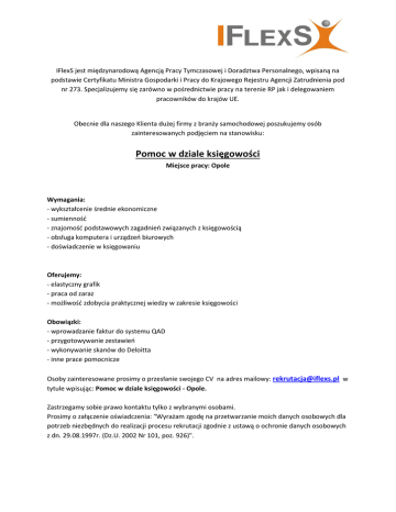 IFlexS jest międzynarodową Agencją Pracy Tymczasowej i Doradztwa Personalnego, wpisaną na podstawie Certyfikatu Ministra Gospodarki i Pracy do Krajowego Rejestru Agencji Zatrudnienia pod nr 273. Specjalizujemy się zarówno w pośrednictwie pracy na terenie RP jak i delegowaniem pracowników do krajów UE. Obecnie dla naszego Klienta dużej firmy z branży samochodowej poszukujemy osób zainteresowanych podjęciem na stanowisku: Pomoc w dziale księgowości Miejsce pracy: Opole Wymagania: - wykształcenie średnie ekonomiczne - sumienność - znajomość podstawowych zagadnień związanych z księgowością - obsługa komputera i urządzeń biurowych - doświadczenie w księgowaniu Oferujemy: - elastyczny grafik - praca od zaraz - możliwość zdobycia praktycznej wiedzy w zakresie księgowości Obowiązki: - wprowadzanie faktur do systemu QAD - przygotowywanie zestawień - wykonywanie skanów do Deloitta - inne prace pomocnicze Osoby zainteresowane prosimy o przesłanie swojego CV na adres mailowy: [email protected] w tytule wpisując: Pomoc w dziale księgowości - Opole. Zastrzegamy sobie prawo kontaktu tylko z wybranymi osobami. Prosimy o załączenie oświadczenia: "Wyrażam zgodę na przetwarzanie moich danych osobowych dla potrzeb niezbędnych do realizacji procesu rekrutacji zgodnie z ustawą o ochronie danych osobowych z dn. 29.08.1997r. (Dz.U. 2002 Nr 101, poz. 926)".