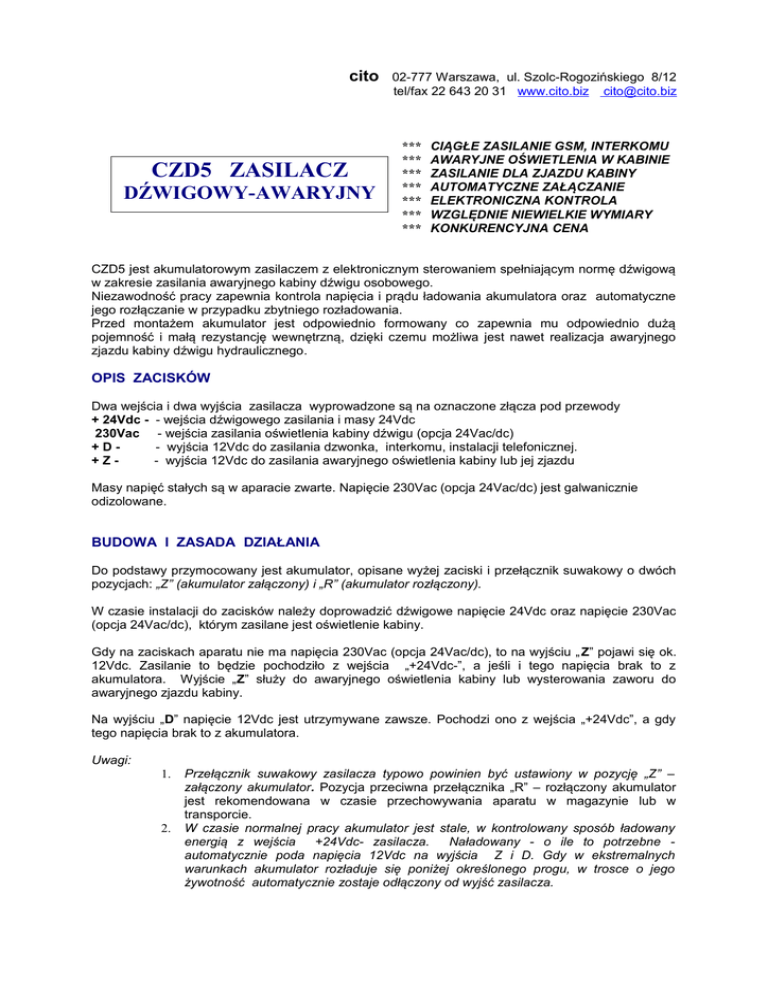cito CZD5 ZASILACZ DŹWIGOWY-AWARYJNY 02-777 Warszawa, ul. Szolc-Rogozińskiego 8/12 tel/fax 22 643 20 31 www.cito.biz [email protected] *** *** *** *** *** *** *** CIĄGŁE ZASILANIE GSM, INTERKOMU AWARYJNE OŚWIETLENIA W KABINIE ZASILANIE DLA ZJAZDU KABINY AUTOMATYCZNE ZAŁĄCZANIE ELEKTRONICZNA KONTROLA WZGLĘDNIE NIEWIELKIE WYMIARY KONKURENCYJNA CENA CZD5 jest akumulatorowym zasilaczem z elektronicznym sterowaniem spełniającym normę dźwigową w zakresie zasilania awaryjnego kabiny dźwigu osobowego. Niezawodność pracy zapewnia kontrola napięcia i prądu ładowania akumulatora oraz automatyczne jego rozłączanie w przypadku zbytniego rozładowania. Przed montażem akumulator jest odpowiednio formowany co zapewnia mu odpowiednio dużą pojemność i małą rezystancję wewnętrzną, dzięki czemu możliwa jest nawet realizacja awaryjnego zjazdu kabiny dźwigu hydraulicznego. OPIS ZACISKÓW Dwa wejścia i dwa wyjścia zasilacza wyprowadzone są na oznaczone złącza pod przewody + 24Vdc - - wejścia dźwigowego zasilania i masy 24Vdc 230Vac - wejścia zasilania oświetlenia kabiny dźwigu (opcja 24Vac/dc) +D- wyjścia 12Vdc do zasilania dzwonka, interkomu, instalacji telefonicznej. +Z- wyjścia 12Vdc do zasilania awaryjnego oświetlenia kabiny lub jej zjazdu Masy napięć stałych są w aparacie zwarte. Napięcie 230Vac (opcja 24Vac/dc) jest galwanicznie odizolowane. BUDOWA I ZASADA DZIAŁANIA Do podstawy przymocowany jest akumulator, opisane wyżej zaciski i przełącznik suwakowy o dwóch pozycjach: „Z” (akumulator załączony) i „R” (akumulator rozłączony). W czasie instalacji do zacisków należy doprowadzić dźwigowe napięcie 24Vdc oraz napięcie 230Vac (opcja 24Vac/dc), którym zasilane jest oświetlenie kabiny. Gdy na zaciskach aparatu nie ma napięcia 230Vac (opcja 24Vac/dc), to na wyjściu „ Z” pojawi się ok. 12Vdc. Zasilanie to będzie pochodziło z wejścia „+24Vdc-”, a jeśli i tego napięcia brak to z akumulatora. Wyjście „Z” służy do awaryjnego oświetlenia kabiny lub wysterowania zaworu do awaryjnego zjazdu kabiny. Na wyjściu „D” napięcie 12Vdc jest utrzymywane zawsze. Pochodzi ono z wejścia „+24Vdc”, a gdy tego napięcia brak to z akumulatora. Uwagi: 1. 2. Przełącznik suwakowy zasilacza typowo powinien być ustawiony w pozycję „Z” – załączony akumulator. Pozycja przeciwna przełącznika „R” – rozłączony akumulator jest rekomendowana w czasie przechowywania aparatu w magazynie lub w transporcie. W czasie normalnej pracy akumulator jest stale, w kontrolowany sposób ładowany energią z wejścia +24Vdc- zasilacza. Naładowany - o ile to potrzebne automatycznie poda napięcia 12Vdc na wyjścia Z i D. Gdy w ekstremalnych warunkach akumulator rozładuje się poniżej określonego progu, w trosce o jego żywotność automatycznie zostaje odłączony od wyjść zasilacza. AKUMULATOR Standardowo zasilacz CZD5 wyposażamy w bezobsługowy akumulator 5Ah wykonany w technologii AGM (absorbed glass mat) z elektrolitem uwięzionym w matach z włókna szklanego. Są to akumulatory typu SLA czyli szczelne, z samouszczelniającymi się zaworami bezpieczeństwa. Przed montażem akumulator jest formowany zgodnie z zaleceniem producenta. NORMY: Akumulatory wykonywane są w procesie produkcyjnym i kontroli jakości wg normy ISO 9002. Posiadają certyfikat CE (dopuszczenie G4M20104-0412-E-16) dopuszczający do obrotu na terenie krajów Unii Europejskiej. TRANSPORT: Akumulatory (zasilacze CZD5) dopuszczone są do transportu samochodowego, kolejowego oraz, zgodnie z 49 punktem CFR 173.159 do transportu powietrznego. Opakowanie transportowe dodatkowo musi zabezpieczać akumulatory przed zwarciami elektrod i opisywać zawartość jako „niewylewające akumulatory”. MAGAZYNOWANIE: Dopuszcza się magazynowanie akumulatorów w pomieszczeniach o temperaturze od -15°C do 40°C o wilgotności od 25% do 85%, bez wibracji, udarów mechanicznych, dużego nasłonecznienia, z przewietrzaniem. Czas składowania nowych akumulatorów jest zależny od temperatury w pomieszczeniu: 20°C można składować akumulatory do 9 miesięcy, 30°C można składować akumulatory do 6 miesięcy, 40°C można składować akumulatory do 3 miesięcy. W trakcie magazynowania poziom ich napięcia powoli spada. Tempo tego spadku uzależnione jest od temperatury otoczenia. Zakłada się, że akumulator w pełni naładowany może być składowany do momentu utraty 50% swojej pojemności prądem samorozładującym. Po tym momencie należy bezwzględnie akumulator naładować. Zależność trwałości akumulatora od temperatury otoczenia Czas życia akumulatora zależny jest od wielu czynników: warunków składowania, typu i temperatury ładowania, parametrów termicznych i prądowych oraz krotności i głębokości rozładowania. PARAMERTY TECHNICZNE Wyjście „Z” Wyjście „D” Wejście +24VdcWejście 230Vac 12Vdc max 5A 12Vdc max 1A max 32V/1A max 240V/4mA (opcja 24Vac/dc) Pojemność akumulatora Wymiary zasilacza Całkowity ciężar Mocowanie 5Ah 90*118*125mm 1,9kg 4* M3 (83*110mm) cito oferuje również akumulatory i inne typy zasilaczy awaryjnych