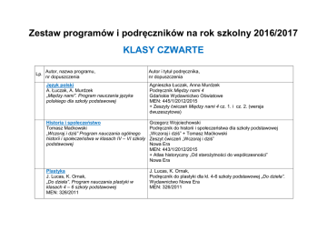 Zestaw programów i podręczników na rok szkolny 2016/2017 KLASY CZWARTE Lp. Autor, nazwa programu, nr dopuszczenia Autor i tytuł podręcznika, nr dopuszczenia Język polski A. Łuczak, A. Murdzek „Między nami”. Program nauczania języka polskiego dla szkoły podstawowej Agnieszka Łuczak, Anna Murdzek Podręcznik Między nami 4 Gdańskie Wydawnictwo Oświatowe MEN: 445/1/2012/2015 + Zeszyty ćwiczeń Między nami 4 cz. 1. i cz. 2. (wersja dwuzeszytowa) Historia i społeczeństwo Tomasz Maćkowski „Wczoraj i dziś” Program nauczania ogólnego historii i społeczeństwa w klasach IV – VI szkoły podstawowej Grzegorz Wojciechowski Podręcznik do historii i społeczeństwa dla szkoły podstawowej „Wczoraj i dziś” + Tomasz Maćkowski Zeszyt ćwiczeń „Wczoraj i dziś” Nowa Era MEN: 443/1/2012/2015 + Atlas historyczny „Od starożytności do współczesności” Nowa Era Plastyka J. Lucas, K. Ornak, „Do dzieła”. Program nauczania plastyki w klasach 4 – 6 szkoły podstawowej MEN: 326/2011 J. Lucas, K. Ornak, Podręcznik do plastyki dla kl. 4-6 szkoły podstawowej „Do dzieła”. Wydawnictwo Nowa Era MEN: 326/2011 Zajęcia techniczne L. Łabecki, M. Łabecka „Jak to działa?” Program nauczania ogólnego zajęć technicznych w szkole MEN: 295/2010 L. Łabecki, M. Łabecka Podręcznik do zajęć technicznych dla kl. 4-6 szkoły podstawowej „Jak to działa?” Wydawnictwo Nowa Era MEN: 295/2010 Etyka Anna Ziemska, Łukasz Malinowski „Ludzkie ścieżki”. Kompleksowy program nauczania etyki na II, III i IV etapie edukacyjnym Bez podręcznika Muzyka M. Gromek, G. Kilbach Program nauczania ogólnego muzyki w klasach 4 – 6 szkoły podstawowej Wydawnictwo Nowa Era M. Gromek, G. Kilbach, Podręcznik „Lekcja muzyki 4” (z dodatkiem „Zagrajmy”) + zeszyt ucznia Wydawnictwo Nowa Era MEN: 589/1/2012 Religia ks. K.Mielnicki, E. Kondrak, B. Nosek Program „Odkrywamy tajemnice Bożego świata” AZ-2-02/12 30 V 2012 ks. K. Mielnicki, E. Kondrak, B. Nosek Podręcznik „Miejsca pełne BOGActw” Wydawnictwo Jedność, Kielce AZ-21-02/12-KI-1/12 Matematyka Marta Jucewicz, Marcin Karpiński, Jacek Lech „Matematyka z plusem”. Program nauczania matematyki dla drugiego etapu edukacyjnego Gdańskie Wydawnictwo Oświatowe M. Dobrowolska, M. Jucewicz, M. Karpiński, P. Zarzycki Matematyka 4. Podręcznik. Nowa wersja. Seria Matematyka z plusem. MEN: 340/1/2015/z1 + Zeszyty ćwiczeń: 1. Liczby naturalne. Wersja A 2. Ułamki. Wersja A Przyroda J. Golanko „Tajemnice przyrody”. Program nauczania przyrody klasach 4 -6 szkoły podstawowej. Wydawnictwo Nowa Era 3. Geometria. Wersja A Gdańskie Wydawnictwo Oświatowe M. Marko - Worłowska, F. Szlajfer, J. Stawarz Podręcznik dla klasy czwartej szkoły podstawowej „Tajemnice przyrody 4” Wydawnictwo Nowa Era MEN: 399/1/2011 Zeszyty ćwiczeń „Tajemnice przyrody 4” (dwie części) Wydawnictwo Nowa Era Atlas przyrodniczy kl. 4-6 Wydawnictwo Nowa Era (dowolny) Elementy informatyki D.Kiałka, K.Kiałka „Informatyka Europejczyka”. Program nauczania zajęć komputerowych dla drugiego etapu edukacyjnego D. Kiałka i K.Kiałka „Informatyka Europejczyka”. Podręcznik do zajęć komputerowych dla szkoły podstawowej (kl. 4.) Edycja: Windows 7, Windows Vista, Linux Ubuntu, MS Office 2007, OpenOffice.org (Wydanie II) MEN: 475/1/2012 Wychowanie fizyczne U. Kierczak T. Głos Program wychowania fizycznego dla czterech etapów edukacyjnych „Zabawa i sport” (II etap edukacyjny) DKW 4014 - 88/01 WSiP Brak podręcznika Język angielski Katarzyna Łastawiecka Program nauczania języka angielskiego dla klas IV –VI Szkoły Podstawowej nr 20 im. Jana Herbert Puchta, Günter Gerngross and Peter Lewis-Jones Super Minds 4 (podręcznik + ćwiczenia) Wydawnictwo Cambridge University Press 2012 Raymond Murphy Gutenberga Fundacji Szkolnej Essential Grammar in Use Third Edition with answers. Wydawnictwo Cambridge University Press 2012 Karen Saxby Student’s Book: Storyfun for Flyers, Wydawnictwo Cambridge University Press Język francuski Z. Dziegielewska, M. Pamuła, M. Szeska-Plewako Program nauczania dla szkoły podstawowej – język francuski MEN: DKW-4014 -249/99 Hugues Denisot Super Max 1 (podręcznik i ćwiczenia) Wydawnictwo Hachette MEN:150/1/2009 Język hiszpański A. Olszewska-Jaroszewicz, A. Wyrzykowska Program własny nauczania języka hiszpańskiego w szkole podstawowej Maria Castro Podręcznik Clan 7 con Hola Amigos ( + Zeszyt ćwiczeń 1) Wydawnictwo Edinumen MEN: 700/1/2014 Język niemiecki Aleksandra Kubicka Program nauczania języka niemieckiego w szkole podstawowej Książek-Kempa Ewa i inni Podręcznik WIR Smart 1, klasa 4, Motta Giorgio i inni Smartbook ( rozszerzony zeszyt ćwiczeń z interaktywnym kompletem uczniowskim) Wydawnictwo Lektorklett MEN: 442/1/2012