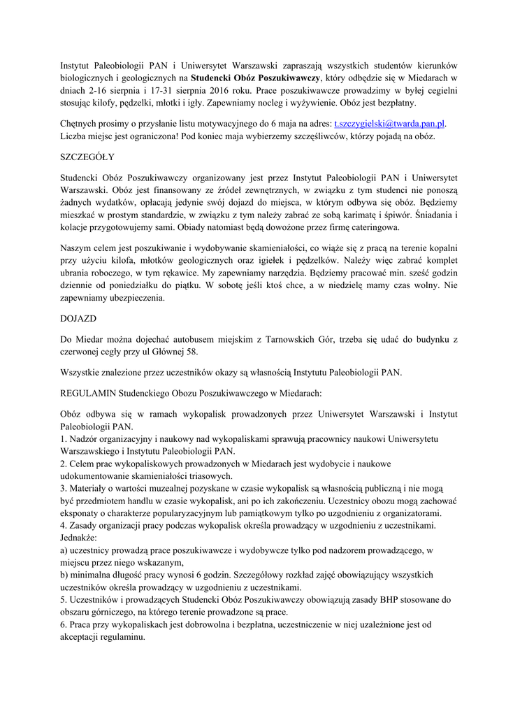 Instytut Paleobiologii PAN i Uniwersytet Warszawski zapraszają wszystkich studentów kierunków biologicznych i geologicznych na Studencki Obóz Poszukiwawczy, który odbędzie się w Miedarach w dniach 2-16 sierpnia i 17-31 sierpnia 2016 roku. Prace poszukiwawcze prowadzimy w byłej cegielni stosując kilofy, pędzelki, młotki i igły. Zapewniamy nocleg i wyżywienie. Obóz jest bezpłatny. Chętnych prosimy o przysłanie listu motywacyjnego do 6 maja na adres: [email protected]. Liczba miejsc jest ograniczona! Pod koniec maja wybierzemy szczęśliwców, którzy pojadą na obóz. SZCZEGÓŁY Studencki Obóz Poszukiwawczy organizowany jest przez Instytut Paleobiologii PAN i Uniwersytet Warszawski. Obóz jest finansowany ze źródeł zewnętrznych, w związku z tym studenci nie ponoszą żadnych wydatków, opłacają jedynie swój dojazd do miejsca, w którym odbywa się obóz. Będziemy mieszkać w prostym standardzie, w związku z tym należy zabrać ze sobą karimatę i śpiwór. Śniadania i kolacje przygotowujemy sami. Obiady natomiast będą dowożone przez firmę cateringowa. Naszym celem jest poszukiwanie i wydobywanie skamieniałości, co wiąże się z pracą na terenie kopalni przy użyciu kilofa, młotków geologicznych oraz igiełek i pędzelków. Należy więc zabrać komplet ubrania roboczego, w tym rękawice. My zapewniamy narzędzia. Będziemy pracować min. sześć godzin dziennie od poniedziałku do piątku. W sobotę jeśli ktoś chce, a w niedzielę mamy czas wolny. Nie zapewniamy ubezpieczenia. DOJAZD Do Miedar można dojechać autobusem miejskim z Tarnowskich Gór, trzeba się udać do budynku z czerwonej cegły przy ul Głównej 58. Wszystkie znalezione przez uczestników okazy są własnością Instytutu Paleobiologii PAN. REGULAMIN Studenckiego Obozu Poszukiwawczego w Miedarach: Obóz odbywa się w ramach wykopalisk prowadzonych przez Uniwersytet Warszawski i Instytut Paleobiologii PAN. 1. Nadzór organizacyjny i naukowy nad wykopaliskami sprawują pracownicy naukowi Uniwersytetu Warszawskiego i Instytutu Paleobiologii PAN. 2. Celem prac wykopaliskowych prowadzonych w Miedarach jest wydobycie i naukowe udokumentowanie skamieniałości triasowych. 3. Materiały o wartości muzealnej pozyskane w czasie wykopalisk są własnością publiczną i nie mogą być przedmiotem handlu w czasie wykopalisk, ani po ich zakończeniu. Uczestnicy obozu mogą zachować eksponaty o charakterze popularyzacyjnym lub pamiątkowym tylko po uzgodnieniu z organizatorami. 4. Zasady organizacji pracy podczas wykopalisk określa prowadzący w uzgodnieniu z uczestnikami. Jednakże: a) uczestnicy prowadzą prace poszukiwawcze i wydobywcze tylko pod nadzorem prowadzącego, w miejscu przez niego wskazanym, b) minimalna długość pracy wynosi 6 godzin. Szczegółowy rozkład zajęć obowiązujący wszystkich uczestników określa prowadzący w uzgodnieniu z uczestnikami. 5. Uczestników i prowadzących Studencki Obóz Poszukiwawczy obowiązują zasady BHP stosowane do obszaru górniczego, na którego terenie prowadzone są prace. 6. Praca przy wykopaliskach jest dobrowolna i bezpłatna, uczestniczenie w niej uzależnione jest od akceptacji regulaminu.