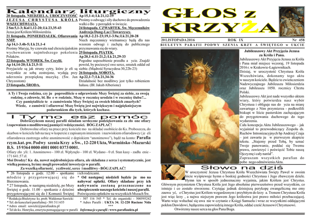 Kalendarz liturgiczny 20 listopada. NIEDZIELA. UROCZYSTOŚĆ JEZUSA CHRYSTUSA KRÓLA WSZECHŚWIATA. 2 Sm 5,1-3; Kol 1,12-20; Łk 23,35-43 Jezus jest Królem Miłosierdzia. 21 listopada. PONIEDZIAŁEK. Ofiarowania NMP. Ap 14,1-3.4b-5; Łk 21,1-4 Prośmy Maryję, by czuwała nad chrześcijańskim wychowaniem najmłodszego pokolenia Polaków. 22 listopada. WTOREK. Św. Cecylii. Ap 14,14-20; Łk 21,5-11 Przyjaciele są jak struny cytry, które jeżeli są wszystkie ze sobą zestrojone, wydają przy uderzeniu przepiękną muzykę. (Św. Jan Chryzostom) 23 listopada. ŚRODA. Ap 15,1-4; Łk 21,12-19 Prośmy o odwagę i siły duchowe do prowadzenia walki o Boży porządek w świecie. 24 listopada. CZWARTEK. Św. Męczenników Andrzeja Dung-Lac i Towarzyszy. Ap 18,1-2.21-23;19,1-3.9a; Łk 21,20-28 Niech męczennicy wietnamscy będą dla nas wzorem odwagi i zachętą do publicznego przyznawania się do wiary. 25 listopada. PIĄTEK. Ap 20,1-4.11-21,2; Łk 21,29-33 Pogodne usposobienie przedłuża życie. Znajdź powód, by pocieszyć swe serce, smutek oddal od siebie. (Mądrość Syracydesa 30,22b-23) 26 listopada. SOBOTA. Ap 22,1-7; Łk 21,34-36 Działalność bez modlitwy jest tylko robieniem hałasu. (Bł. Jakub Alberione) A Ty i Twoja rodzina, czy już poprosiliście o odprawienie Mszy Świętej za siebie, za swoją rodzinę, o zdrowie, bł. Boże w rodzinie, Mszę w rocznicę urodzin i w rocznicę ślubu?... Czy pamiętaliście też o zamówieniu Mszy Świętej za swoich bliskich zmarłych? Wiedz, że zamówić i ofiarować Mszę Świętą jest największym i najpiękniejszym podarunkiem dla tych, których kochasz. I Ty możesz pomóc Dobroczyńcom naszej parafii składam serdeczne podziękowania za złożone ofiary i zapewniam o modlitewnej pamięci i wdzięczności. BÓG ZAPŁAĆ! Dobrowolne ofiary na prace przy kościele można składać osobiście do Ks. Proboszcza, do skarbon w kościele lub na tacę w kopercie z zapisanym imieniem i nazwiskiem ofiarodawcy ( jeżeli ofiarodawca zastrzega sobie anonimowość z dopiskiem “anonimowo”), bądź na konto: Parafia rzym.kat. pw. Podwyższenia Krzyża Św. , 12-220 Ukta, Warmińsko -Mazurski B.S. 15 9364 0000 4001 0001 0373 0001. Ofiary złożyli: 1. Anonimowo - 100 zł. Wpłynęło - 100 zł. Wydano - 0 zł. Stan kasy - zadłużenie 171 641.57 zł. Moi Drodzy! Każda, nawet najdrobniejsza ofiara, ale składana z serca i systematycznie, jest wielką pomocą, byśmy mogli prowadzić inwestycje w parafii. Za wszelką ofiarność, życzliwość, serce i modlitwy - BÓG ZAPŁAĆ! * 26 listopada o godz. 12.00 - spotkanie i ich rodzicami. m ł o d z i e ż y p r z y g o t o w u j ą c e j s i ę d o * Od następnej niedzieli będzie już można Bierzmowania. nabywać opłatki. Ofiary składane przy ich * 27 listopada, w następną niedzielę, po Mszy nabywaniu zostaną przeznaczone na Świętej o godz. 11.00 - spotkanie z dziećmi ubezpieczenie naszego kościoła i naszej parafii. przygotowującymi się do I Komunii Świętej Poświęcenie opłatków na wszystkich Mszach Św. * Redakcja Biuletynu- ks. prob. Waldemar Sawicki - 507 116 545 * Tel. do organistki - 500595242 * Tel. do kancelarii parafialnej - 501 511 655 * Adres Parafii : UKTA 34. 12-220 Ruciane Nida * Adres email: [email protected] *** * Tel do ks. Henryka, emeryta pomagającego w parafii Informacje o parafii : www.parafiaukta.pl GŁOS z KRZYŻA 20 LISTOPADA 2016 ROK IX Nr 458 B I U L E T Y N PA R A F I I P O D W Y Ż S Z E N I A K R Z Y Ż A Ś W I Ę T E G O w U K C I E Jubileuszowy Akt Przyjęcia Jezusa za Króla i Pana. Jubileuszowy Akt Przyjęcia Jezusa za Króla i Pana miał miejsce wczoraj, 19 listopada 2016 r. w Krakowie-Łagiewnikach. Dzisiaj, w uroczystość Chrystusa Króla Wszechświata, dokonamy tego aktu w naszym kościele. Będzie to zwieńczeniem Nadzwyczajnego Jubileuszu Miłosierdzia oraz Jubileuszu 1050. rocznicy Chrztu Polski. Jubileuszowy Akt jest nade wszystko aktem wiary, który potwierdza nasz wybór Chrystusa i obliguje nas do życia na miarę zawartego z Nim przymierza - podkreślili biskupi w liście pasterskim zachęcającym do przygotowania duchowego do tego wydarzenia. Cała koncepcja Aktu Jubileuszowego – jak wyjaśniał to przewodniczący Zespołu ds. Ruchów Intronizacyjnych bp Andrzej Czaja – jest zawarta już w pierwszym akapicie tekstu. „Stajemy przed Tobą, by uznać Twoje panowanie, poddać się Twemu prawu, zawierzyć i poświęcić Tobie naszą Ojczyznę i cały naród”. Zapraszam wszystkich parafian do pobożnego odmówienia Aktu. Słowo na dziś W uroczystość Jezusa Chrystusa Króla Wszechświata Święty Paweł w swoim liście wyśpiewuje hymn o boskiej godności Chrystusa i Jego zbawczym dziele. Hymn ten w sposób jednoznaczny wyjaśnia, jakim Królem jest Chrystus. Głównym przymiotem Chrystusa Króla jest Jego absolutne pierwszeństwo przed wszystkim, co istnieje i co zostało stworzone. Czytając jednak dzisiejszą perykopę ewangeliczną możemy zauważyć, że Chrystus jest Królem wzgardzonym i przybitym do krzyża. Tronem Chrystusa Króla jest więc krzyż, a najważniejszym prawem Jego królestwa jest prawo miłości przebaczającej. Warto więc wsłuchać się uważnie w czytanie z Księgi Samuela i wraz ze wszystkimi oddającymi pokłon Dawidowi, będącemu zapowiedzią innego Króla, oddać cześć Jezusowi Chrystusowi. Otwórzmy nasze serca na głos Pana Boga. Ogłoszenia * Komunikaty 1. Dzisiejsza uroczystość, ustanowiona przed ponad 90 laty encykliką papieża Piusa XI Quas primas, stanowi zwieńczenie roku liturgicznego, podczas którego przeżywamy całe misterium zbawcze. Uwielbiamy Pana Boga i dziękujemy Mu za dzieło stworzenia i odkupienia. Uwielbiamy i składamy dzięki za Jego wcielenie, śmierć i zmartwychwstanie. Przez chrzest święty uczestniczymy w tym misterium i poddajemy się królewskiej władzy Jezusa Chrystusa, który pragnie nas wszystkich zjednoczyć w swoim królestwie prawdy, pokoju i zbawien