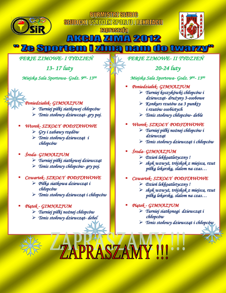 FERIE ZIMOWE- I TYDZIEŃ FERIE ZIMOWE- II TYDZIEŃ 13- 17 luty 20-24 luty Miejska Sala Sportowa- Godz. 900- 1300 Miejska Sala Sportowa- Godz. 900- 1300 Poniedziałek- GIMNAZJUM Turniej piłki siatkowej chłopców Tenis stołowy dziewcząt- gry poj. Poniedziałek- GIMNAZJUM Turniej koszykówki chłopców i dziewcząt- drużyny 3-osobowe Konkurs rzutów za 3 punkty i rzutów osobistych Tenis stołowy chłopców- deble Wtorek- SZKOŁY PODSTAWOWE Gry i zabawy rzędów Tenis stołowy dziewcząt i chłopców Wtorek- SZKOŁY PODSTAWOWE Turniej piłki nożnej chłopców i dziewcząt Tenis stołowy dziewcząt i chłopców Środa- GIMNAZJUM Turniej piłki siatkowej dziewcząt Tenis stołowy chłopców- gry poj. Środa- GIMNAZJUM Dzień lekkoatletyczny ! skok wzwyż, trójskok z miejsca, rzut piłką lekarską, slalom na czas… Czwartek- SZKOŁY PODSTAWOWE Piłka siatkowa dziewcząt i chłopców Tenis stołowy dziewcząt i chłopców Czwartek- SZKOŁY PODSTAWOWE Dzień lekkoatletyczny ! skok wzwyż, trójskok z miejsca, rzut piłką lekarską, slalom na czas… Piątek - GIMNAZJUM Turniej piłki nożnej chłopców Tenis stołowy dziewcząt- debel Piątek - GIMNAZJUM Turniej siatkonogi dziewcząt i chłopców Tenis stołowy dziewcząt i chłopców