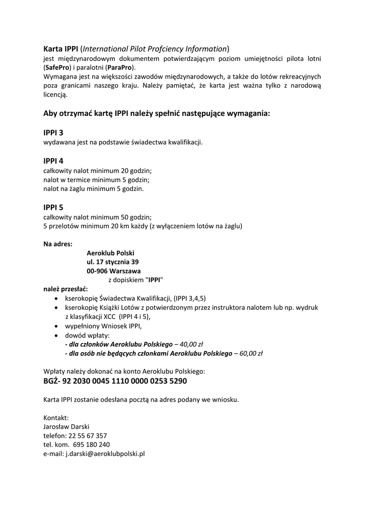 Karta IPPI (International Pilot Profciency Information) jest międzynarodowym dokumentem potwierdzającym poziom umiejętności pilota lotni (SafePro) i paralotni (ParaPro). Wymagana jest na większości zawodów międzynarodowych, a także do lotów rekreacyjnych poza granicami naszego kraju. Należy pamiętać, że karta jest ważna tylko z narodową licencją. Aby otrzymać kartę IPPI należy spełnić następujące wymagania: IPPI 3 wydawana jest na podstawie świadectwa kwalifikacji. IPPI 4 całkowity nalot minimum 20 godzin; nalot w termice minimum 5 godzin; nalot na żaglu minimum 5 godzin. IPPI 5 całkowity nalot minimum 50 godzin; 5 przelotów minimum 20 km każdy (z wyłączeniem lotów na żaglu) Na adres: Aeroklub Polski ul. 17 stycznia 39 00-906 Warszawa z dopiskiem "IPPI" należ przesłać: kserokopię Świadectwa Kwalifikacji, (IPPI 3,4,5) kserokopię Książki Lotów z potwierdzonym przez instruktora nalotem lub np. wydruk z klasyfikacji XCC (IPPI 4 i 5), wypełniony Wniosek IPPI, dowód wpłaty: - dla członków Aeroklubu Polskiego – 40,00 zł - dla osób nie będących członkami Aeroklubu Polskiego – 60,00 zł Wpłaty należy dokonać na konto Aeroklubu Polskiego: BGŻ- 92 2030 0045 1110 0000 0253 5290 Karta IPPI zostanie odesłana pocztą na adres podany we wniosku. Kontakt: Jarosław Darski telefon: 22 55 67 357 tel. kom. 695 180 240 e-mail: [email protected]